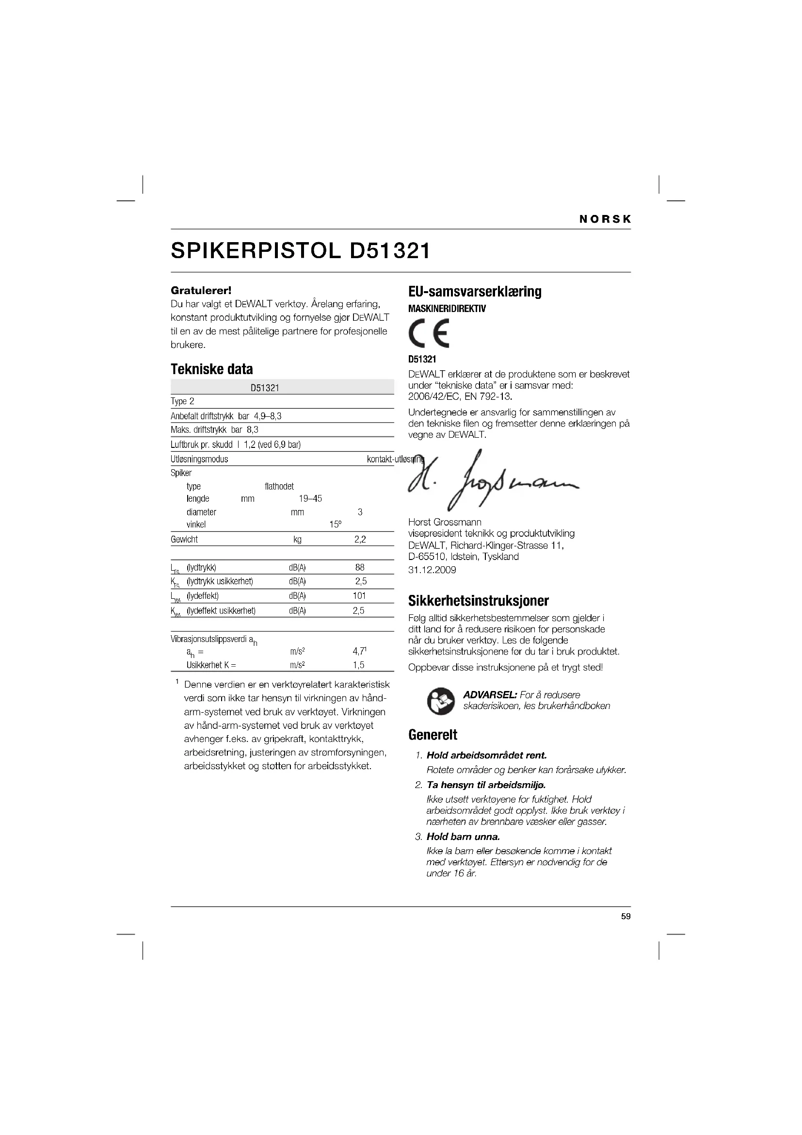 Denne verdien er en verktøyrelatert karakteristisk verdi som ikke tar hensyn til virkningen av hånd- arm-systemet ved bruk av verktøyet. Virkningen av hånd-arm-systemet ved bruk av verktøyet avhenger f.eks. av gripekraft, kontakttrykk, arbeidsretning, justeringen av strømforsyningen, arbeidsstykket og støtten for arbeidsstykket. EU-samsvarserklæring MASKINERIDIREKTIV D51321 DEWALT erklærer at de produktene som er beskrevet under “tekniske data” er i samsvar med: 2006/42/EC, EN 792-13. Undertegnede er ansvarlig for sammenstillingen av den tekniske filen og fremsetter denne erklæringen på vegne av DEWALT. Horst Grossmann visepresident teknikk og produktutvikling DEWALT, Richard-Klinger-Strasse 11, D-65510, Idstein, Tyskland