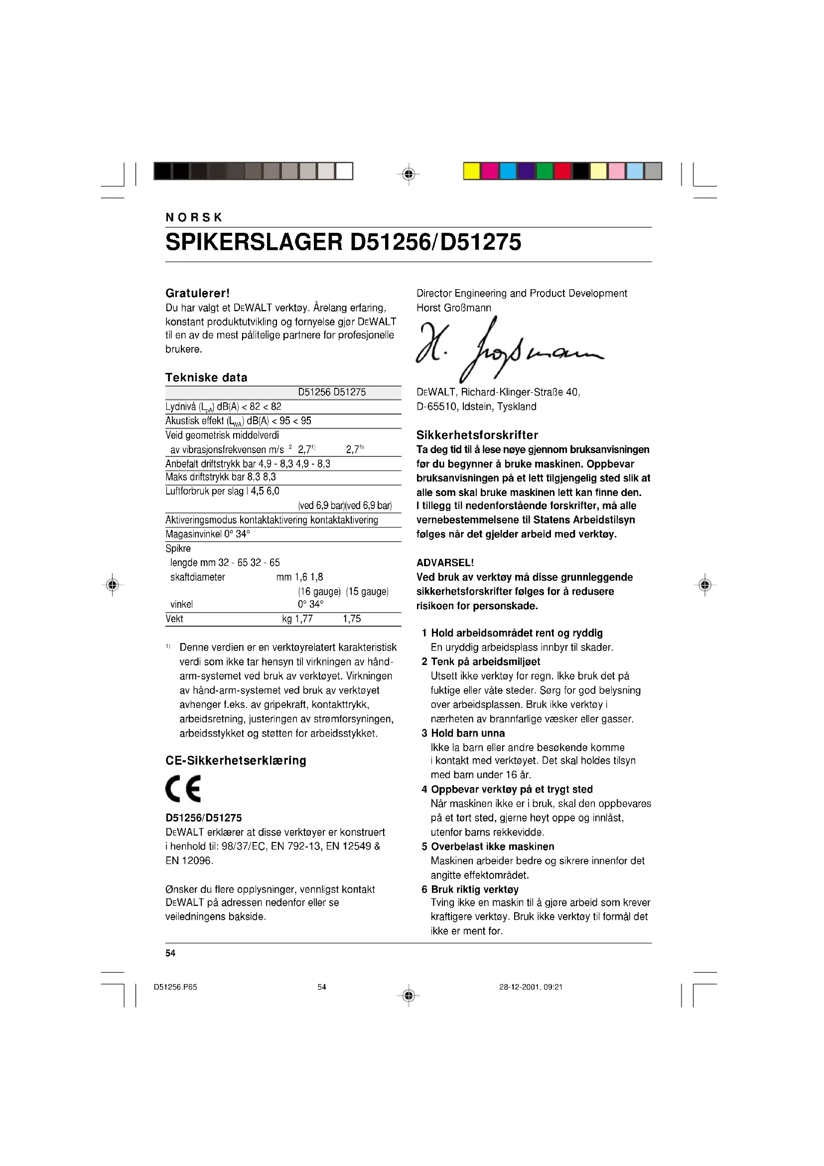 Denne verdien er en verktøyrelatert karakteristisk verdi som ikke tar hensyn til virkningen av hånd- arm-systemet ved bruk av verktøyet. Virkningen av hånd-arm-systemet ved bruk av verktøyet avhenger f.eks. av gripekraft, kontakttrykk, arbeidsretning, justeringen av strømforsyningen, arbeidsstykket og støtten for arbeidsstykket. CE-Sikkerhetserklæring D51256/D51275 DEWALT erklærer at disse verktøyer er konstruert i henhold til: 98/37/EC, EN 792-13, EN 12549 & EN 12096. Ønsker du flere opplysninger, vennligst kontakt DEWALT på adressen nedenfor eller se veiledningens bakside. Director Engineering and Product Development Horst Großmann DEWALT, Richard-Klinger-Straße 40, D-65510, Idstein, Tyskland Sikkerhetsforskrifter Ta deg tid til å lese nøye gjennom bruksanvisningen før du begynner å bruke maskinen. Oppbevar bruksanvisningen på et lett tilgjengelig sted slik at alle som skal bruke maskinen lett kan finne den. I tillegg til nedenforstående forskrifter, må alle vernebestemmelsene til Statens Arbeidstilsyn følges når det gjelder arbeid med verktøy. ADVARSEL! Ved bruk av verktøy må disse grunnleggende sikkerhetsforskrifter følges for å redusere risikoen for personskade. 1 Hold arbeidsområdet rent og ryddig En uryddig arbeidsplass innbyr til skader. 2 Tenk på arbeidsmiljøet Utsett ikke verktøy for regn. Ikke bruk det på fuktige eller våte steder. Sørg for god belysning over arbeidsplassen. Bruk ikke verktøy i nærheten av brannfarlige væsker eller gasser. 3 Hold barn unna Ikke la barn eller andre besøkende komme i kontakt med verktøyet. Det skal holdes tilsyn med barn under 16 år. 4 Oppbevar verktøy på et trygt sted Når maskinen ikke er i bruk, skal den oppbevares på et tørt sted, gjerne høyt oppe og innlåst, utenfor barns rekkevidde. 5 Overbelast ikke maskinen Maskinen arbeider bedre og sikrere innenfor det angitte effektområdet. 6 Bruk riktig verktøy Tving ikke en maskin til å gjøre arbeid som krever kraftigere verktøy. Bruk ikke verktøy til formål det ikke er ment for. D51256.P65 28-12-2001, 09:215455 NORSK 7 Kle deg riktig Ha ikke på deg løstsittende klær eller smykker. De kan sette seg fast i de bevegelige delene. Vi anbefaler gummihansker og sko som ikke glir når du arbeider utendørs. Bruk hårnett hvis du har langt hår. 8 Strekk deg ikke for langt Pass på at du alltid har sikkert fotfeste og balanse. 9 Vær nøye med vedlikeholdet Hold tilbehøret skarpt og rent. Følg forskriftene når det gjelder vedlikehold og skifte av tilbehør. Hold håndtakene tørre, rene og fri for olje og fett. 10 Vær oppmerksom Se på det du gjør. Bruk sunn fornuft. Bruk ikke maskinen når du er trett. 11 Sjekk skadede deler Før fortsatt bruk av maskinen skal eventuelle skadede deler eller deksler kontrolleres nøye for å bringe på det rene om de fungerer riktig og utfører det de skal. Kontroller justeringen av bevegelige deler, om de sitter i klemme, om deler er brukket. Sjekk at alt er riktig montert og er slik det skal være. En del eller et deksel som er skadet, skal repareres eller skiftes ut av et autorisert verksted dersom ikke annet er angitt i bruksanvisningen. 12 ADVARSEL! Bruk bare tilbehør og utstyr som anbefales i bruksanvisningen og i katalogene. Bruk av annet verktøy eller tilbehør enn det som anbefales i bruksanvisningen eller i katalogene kan medføre en mulig risiko for personskade. 13 La verktøyet repareres av et autorisert DEWALT serviceverksted Dette verktøyet er i samsvar med gjeldende sikkerhetsforskrifter. Unngå risiko: Overlat alltid reparasjon av verktøyet til kvalifisert servicepersonale. Ytterligere sikkerhetsinstruksjoner for pneumatiske spikerslagere