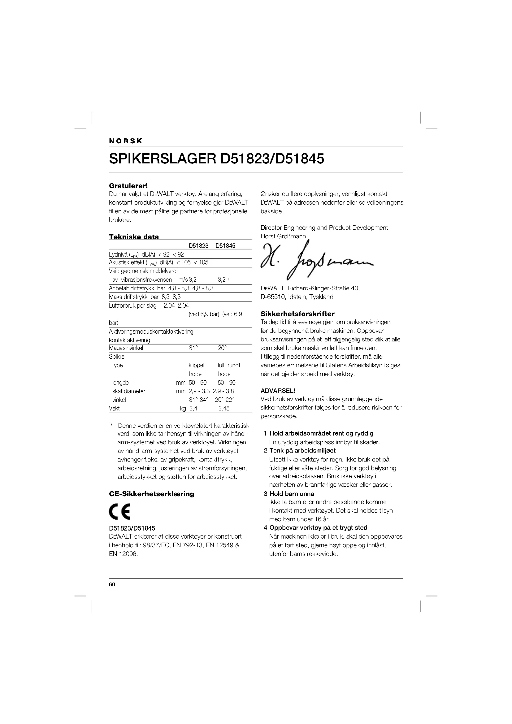 Denne verdien er en verktøyrelatert karakteristisk verdi som ikke tar hensyn til virkningen av hånd- arm-systemet ved bruk av verktøyet. Virkningen av hånd-arm-systemet ved bruk av verktøyet avhenger f.eks. av gripekraft, kontakttrykk, arbeidsretning, justeringen av strømforsyningen, arbeidsstykket og støtten for arbeidsstykket. CE-Sikkerhetserklæring D51823/D51845 DEWALT erklærer at disse verktøyer er konstruert i henhold til: 98/37/EC, EN 792-13, EN 12549 & EN 12096. Ønsker du fl ere opplysninger, vennligst kontakt
