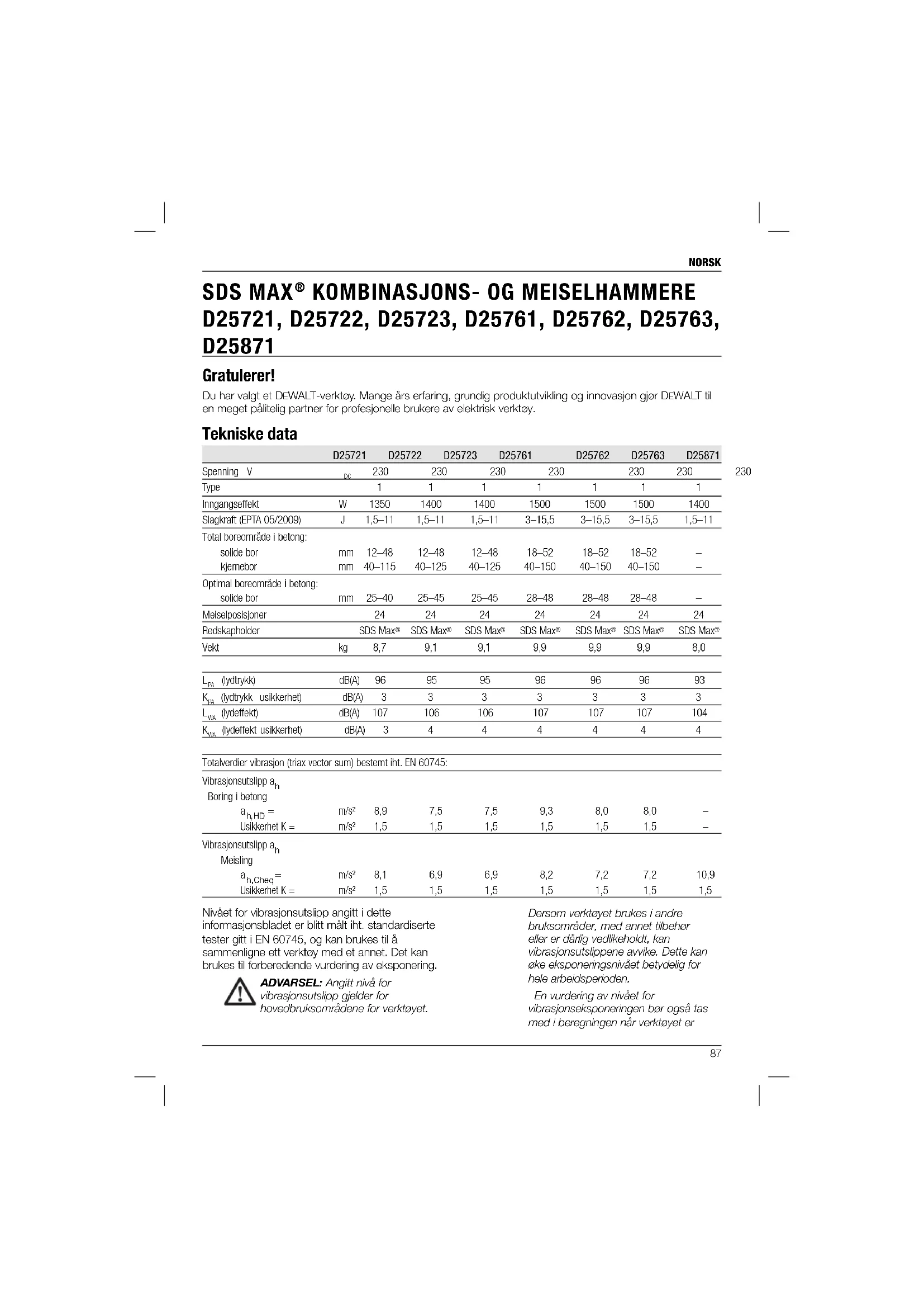 D25721, D25722, D25723, D25761, D25762, D25763, D25871 Gratulerer! Du har valgt et DEWALT-verktøy. Mange års erfaring, grundig produktutvikling og innovasjon gjør DEWALT til en meget pålitelig partner for profesjonelle brukere av elektrisk verktøy. Tekniske data D25721 D25722 D25723 D25761 D25762 D25763 D25871 Spenning V