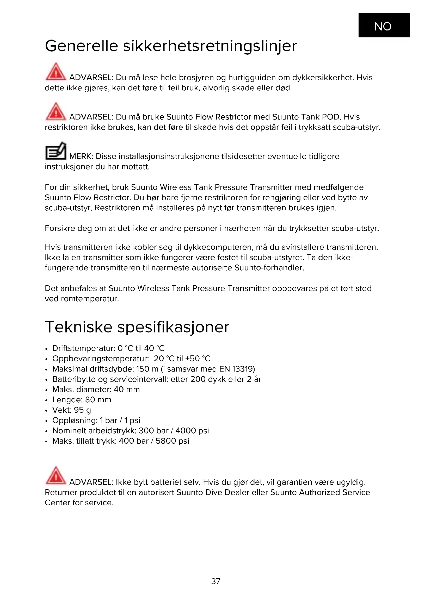 bekræfte forbindelsen. BEMÆRK: Ældre senderenheder er ikke forsynet med lysdioder.37 Generelle sikkerhetsretningslinjer ADVARSEL: Du må lese hele brosjyren og hurtigguiden om dykkersikkerhet. Hvis dette ikke gjøres, kan det føre til feil bruk, alvorlig skade eller død. ADVARSEL: Du må bruke Suunto Flow Restrictor med Suunto Tank POD. Hvis restriktoren ikke brukes, kan det føre til skade hvis det oppstår feil i trykksatt scuba-utstyr. MERK: Disse installasjonsinstruksjonene tilsidesetter eventuelle tidligere instruksjoner du har mottatt. For din sikkerhet, bruk Suunto Wireless Tank Pressure Transmitter med medfølgende Suunto Flow Restrictor. Du bør bare erne restriktoren for rengjøring eller ved bytte av scuba-utstyr. Restriktoren må installeres på nytt før transmitteren brukes igjen. Forsikre deg om at det ikke er andre personer i nærheten når du trykksetter scuba-utstyr. Hvis transmitteren ikke kobler seg til dykkecomputeren, må du avinstallere transmitteren. Ikke la en transmitter som ikke fungerer være festet til scuba-utstyret. Ta den ikke- fungerende transmitteren til nærmeste autoriserte Suunto-forhandler. Det anbefales at Suunto Wireless Tank Pressure Transmitter oppbevares på et tørt sted ved romtemperatur. Tekniske spesifikasjoner
