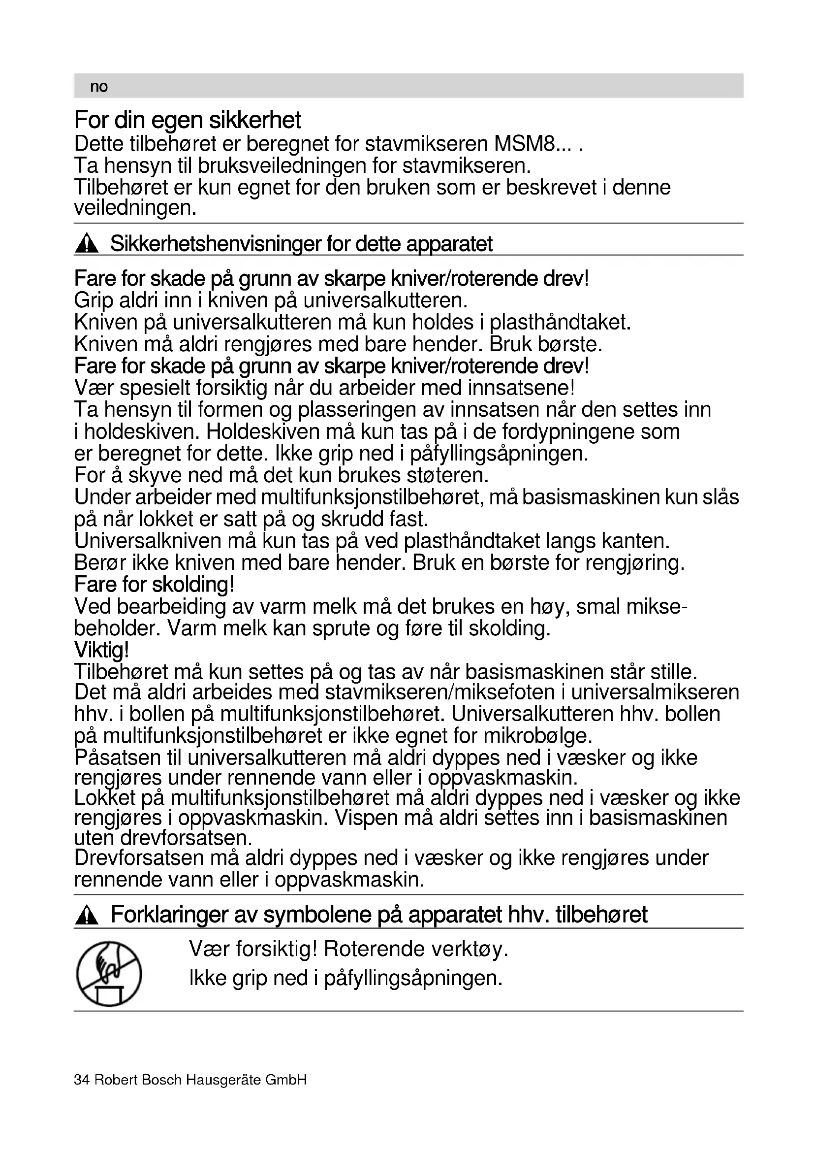 Sikkerhetshenvisninger for dette apparatet Fare for skade på grunn av skarpe kniver/roterende drev! Grip aldri inn i kniven på universalkutteren. Kniven på universalkutteren må kun holdes i plasthåndtaket. Kniven må aldri rengjøres med bare hender. Bruk børste. Fare for skade på grunn av skarpe kniver/roterende drev! Vær spesielt forsiktig når du arbeider med innsatsene! Ta hensyn til formen og plasseringen av innsatsen når den settes inn i holdeskiven. Holdeskiven må kun tas på i de fordypningene som er beregnet for dette. Ikke grip ned i påfyllingsåpningen. For å skyve ned må det kun brukes støteren. Under arbeider med multifunksjonstilbehøret, må basismaskinen kun slås på når lokket er satt på og skrudd fast. Universalkniven må kun tas på ved plasthåndtaket langs kanten. Berør ikke kniven med bare hender. Bruk en børste for rengjøring. Fare for skolding! Ved bearbeiding av varm melk må det brukes en høy, smal mikse- beholder. Varm melk kan sprute og føre til skolding. Viktig! Tilbehøret må kun settes på og tas av når basismaskinen står stille. Det må aldri arbeides med stavmikseren/miksefoten i universalmikseren hhv. i bollen på multifunksjonstilbehøret. Universalkutteren hhv. bollen på multifunksjonstilbehøret er ikke egnet for mikrobølge. Påsatsen til universalkutteren må aldri dyppes ned i væsker og ikke rengjøres under rennende vann eller i oppvaskmaskin. Lokket på multifunksjonstilbehøret må aldri dyppes ned i væsker og ikke rengjøres i oppvaskmaskin. Vispen må aldri settes inn i basismaskinen uten drevforsatsen. Drevforsatsen må aldri dyppes ned i væsker og ikke rengjøres under rennende vann eller i oppvaskmaskin.