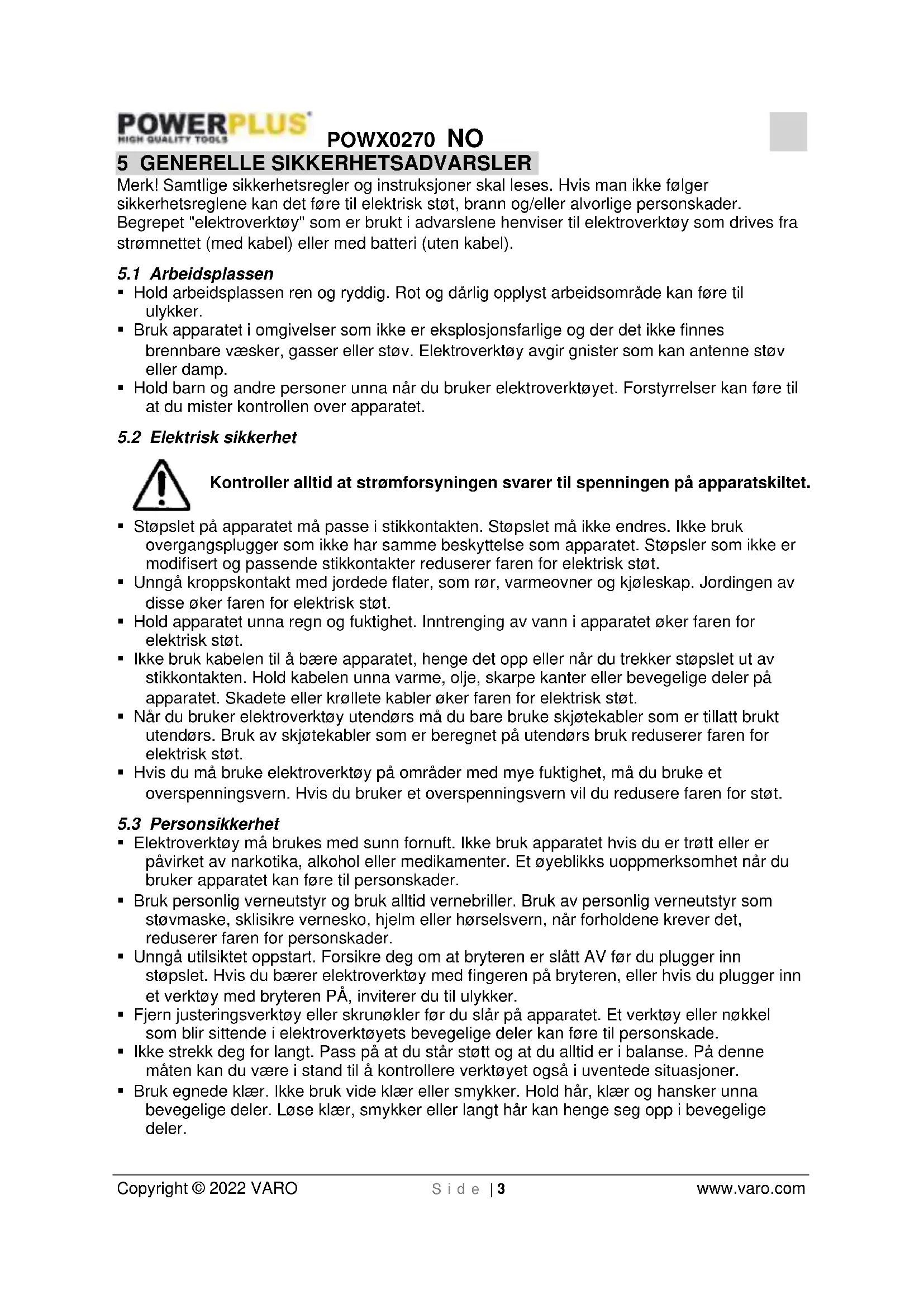 - Garantien dekker bestemt ikke skader som skyldes inntrenging av væsker, inntrenging av mye støv, overlagt skade (med hensikt eller ved grov uaktsomhet), feilaktig bruk (bruk til noe produktet ikke er beregnet på), ikke-kompetent bruk (for eksempel ved at anvisningene i håndboken ignoreres), feilaktig montering, lynnedslag eller feil nettspenning. Denne listen er ikke begrensende.POWX0270 NO Copyright © 2022 VARO S i d e | 7 www.varo.com