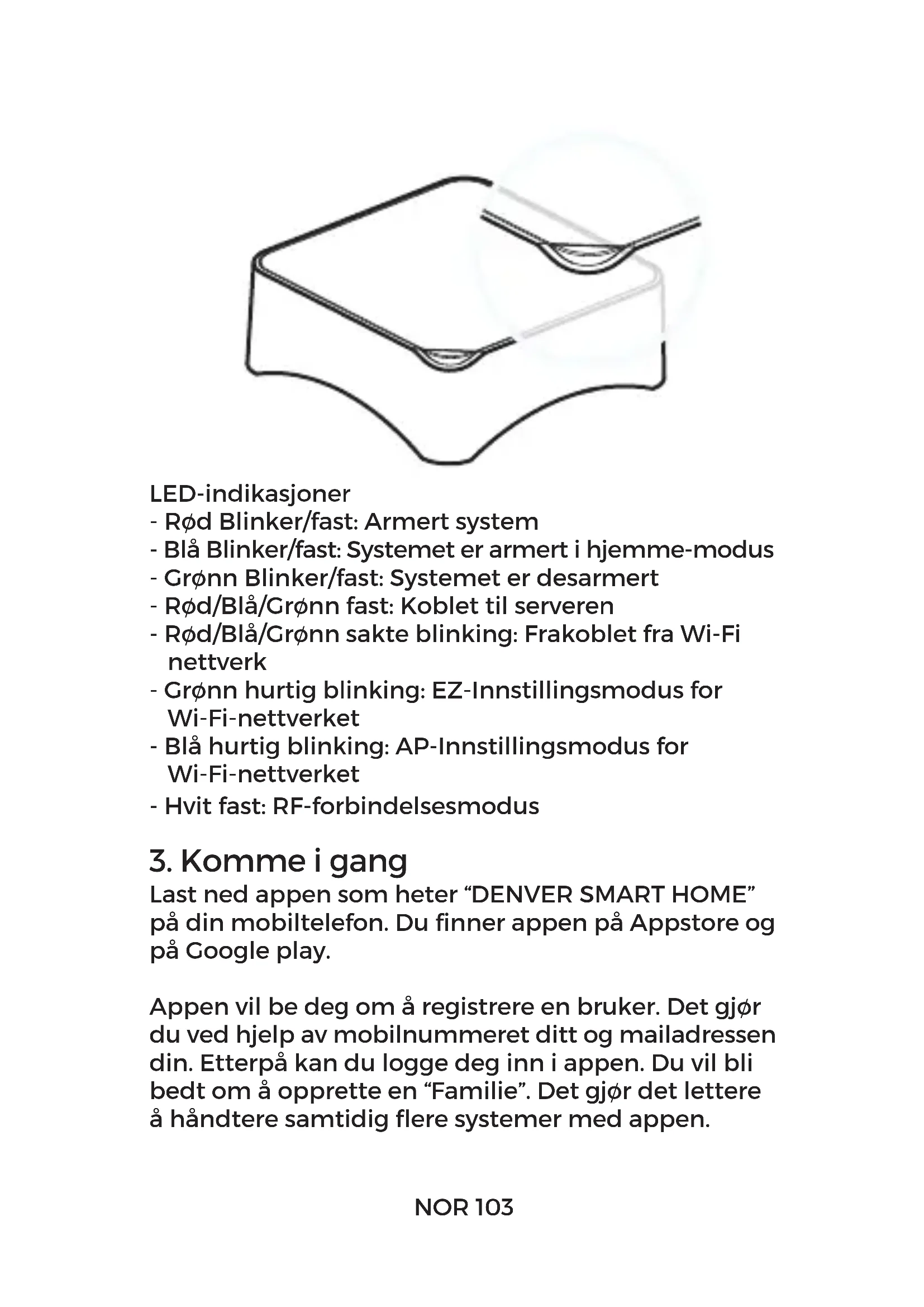 Strømknapp SIM-kortspor Inngang for strømadapteren Koblingsknapp SIM Alt utstyr pares sammen med betjeningspanel, unntatt IP-kameraet. NOR 1023. Komme i gang LED-indikasjoner - Rød Blinker/fast: Armert system - Blå Blinker/fast: Systemet er armert i hjemme-modus - Grønn Blinker/fast: Systemet er desarmert - Rød/Blå/Grønn fast: Koblet til serveren - Rød/Blå/Grønn sakte blinking: Frakoblet fra Wi-Fi nettverk - Grønn hurtig blinking: EZ-Innstillingsmodus for Wi-Fi-nettverket - Blå hurtig blinking: AP-Innstillingsmodus for Wi-Fi-nettverket - Hvit fast: RF-forbindelsesmodus Last ned appen som heter “DENVER SMART HOME” på din mobiltelefon. Du finner appen på Appstore og på Google play. Appen vil be deg om å registrere en bruker. Det gjør du ved hjelp av mobilnummeret ditt og mailadressen din. Etterpå kan du logge deg inn i appen. Du vil bli bedt om å opprette en “Familie”. Det gjør det lettere å håndtere samtidig flere systemer med appen. NOR 103Nå må du legge til alarmsystemet i appen. Begynn med å pakke ut betjeningspanelet og tilbehøret. Trekk ut alle beskyttelsesfilmene på batteriene, og slå på betjeningspanelet ved å trykke på tilkoblingsknappen (bruk en pen, en tannpirker eller lignende) Trykk på “Legg til enhet”, gå til “Annet” og velg “Wi-Fi connector”, og følg instruksene på skjermen. Du vil veiledes gjennom hele prosessen. Alarmanlegget er nå koblet til, og du kan installere dine sensorer osv. hvor du vil. IP-kameraet må kobles til separat. Følg instruksene for å “Legge til” et nytt utstyr, og velg “Sikkerhet & NOR 1044. Daglig bruk Sensor”. Velg så “Smart kamera” og følg instruksene på skjermen. Du finner nå alarmen din på appens startside. Trykk på den, og du vil komme til siden som viser alarminnstillingene. Der kan alarmen armeres/ dearmeres, settes i hjemmemodus osv. Der kan du også legge til nye sensorer og tilleggsutstyr hvis du får flere av dem. Du kan justere forsinkelsestiden, velge automatisert armering/desarmering osv. Du kan også bruke fjernkontrollen for å armere/ dearmere alarmsystemet. Tastaturet som følger med kan også brukes. NOR 105Hvis du bruker tastaturet, må du taste inn koden (standard kode er 1234, men du kan selvfølgelig endre den), og så trykke på låsen for å armere alarmen. For å dearmere, gjør du det samme, men du trykker på åpningstasten. RFID-taggen kan brukes for å dearmere alarmsystemet. Hold den opp mot tastaturet. (Den kan kun brukes for dearmering, ikke for armering) Den smarteste & enkleste måten å bruke DENVER SHA-150 på er denne appen, og alarmsystemet på Wi-Fi. Det går også an å bruke alarmsystemet via SMS- eller telefonkommandoer. En slik betjening beskrives i den komplette brukermanualen som du finner på hjemmesiden vår. Gå inn på denver.eu og søk etter SHA-150. Der finner du den komplette brukermanualen på engelsk. Hvis du av en eller annen grunn må nullstille betjeningspanelet, kan du gjøre det ved å trykke 5 ganger på koblingsknappen innen 5 sekunder etter at du har slått på betjeningspanelet. Utstyret vil da få tilbake sine fabrikkinnstillinger. (Merk deg at all paring med sensorer og annet utstyr også vil bli slettet. Se den komplette brukermanualen for å legge til nye sensorer igjen. Vennligst merk at vi kan gjøre endringer på alle våre produkter uten forvarsel. Vi tar forbehold om eventuelle feil og mangler i denne manualen.