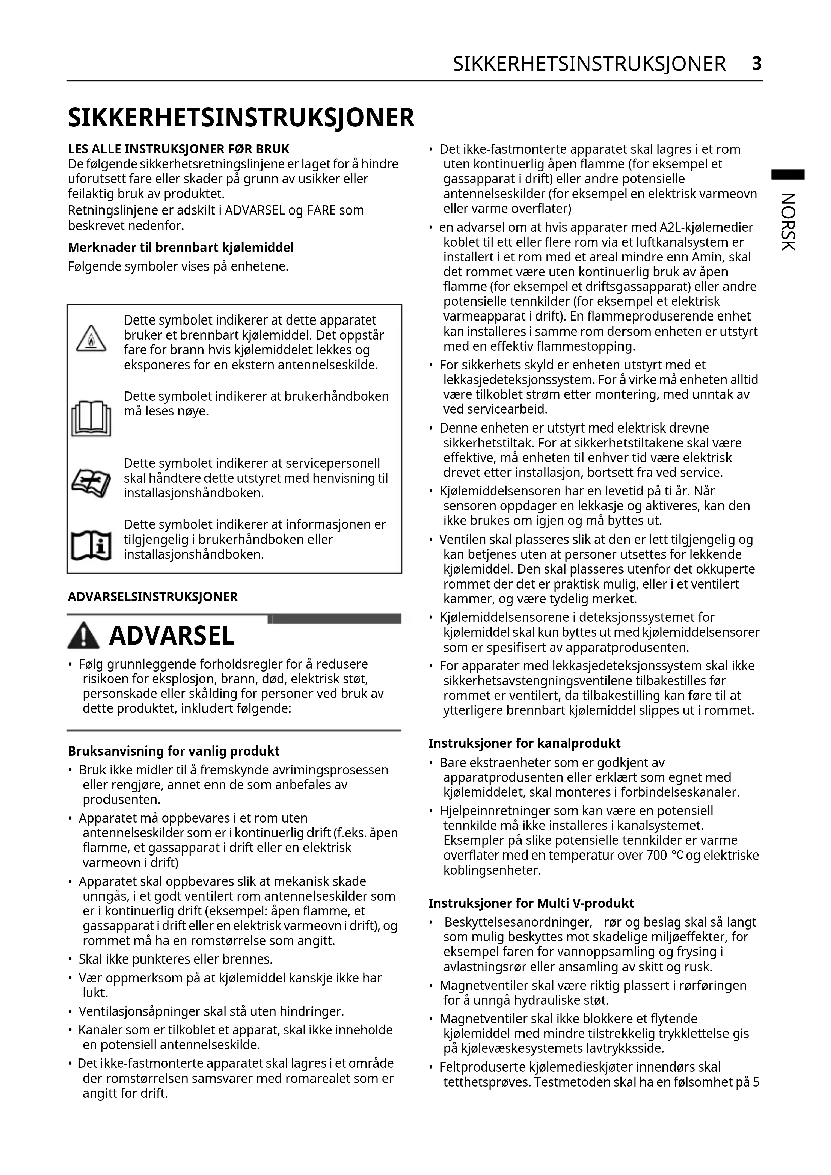 - Før du begynner på arbeidet med systemer som inneholder brennbare kjølemidler, kreves det sikkerhetskontroller for å påse at faren for antennelse minimeres. For reparasjon av kjølesystemet skal følgende forholdsregler overholdes før arbeid på systemet utføres.5 SIKKERHETSINSTRUKSJONER NORSK Arbeidsprosedyre