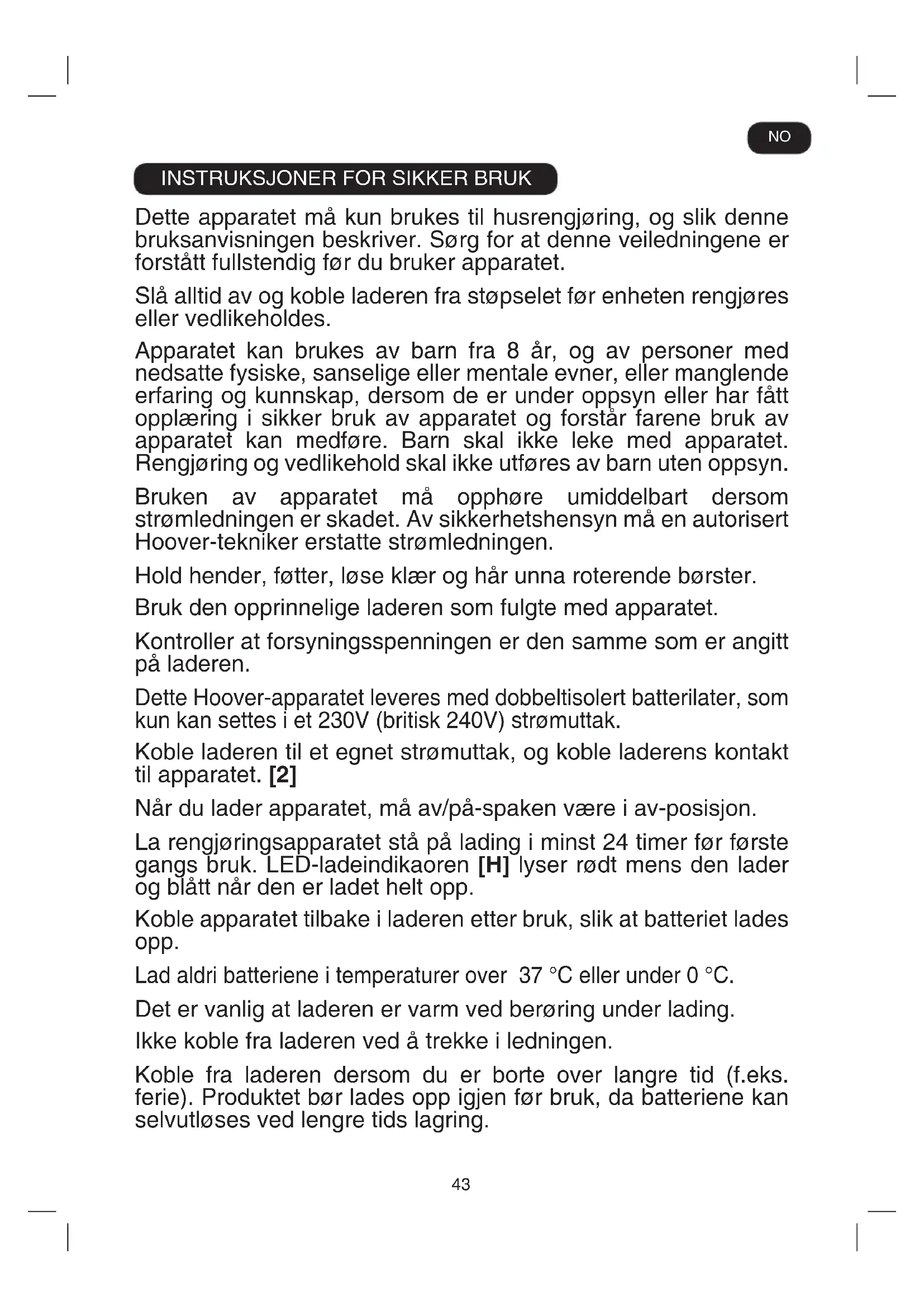 Dette apparatet må kun brukes til husrengjøring, og slik denne bruksanvisningen beskriver. Sørg for at denne veiledningene er forstått fullstendig før du bruker apparatet. Slå alltid av og koble laderen fra støpselet før enheten rengjøres eller vedlikeholdes. Apparatet kan brukes av barn fra 8 år, og av personer med nedsatte fysiske, sanselige eller mentale evner, eller manglende erfaring og kunnskap, dersom de er under oppsyn eller har fått opplæring i sikker bruk av apparatet og forstår farene bruk av apparatet kan medføre. Barn skal ikke leke med apparatet. Rengjøring og vedlikehold skal ikke utføres av barn uten oppsyn. Bruken av apparatet må opphøre umiddelbart dersom strømledningen er skadet. Av sikkerhetshensyn må en autorisert Hoover-tekniker erstatte strømledningen. Hold hender, føtter, løse klær og hår unna roterende børster. Bruk den opprinnelige laderen som fulgte med apparatet. Kontroller at forsyningsspenningen er den samme som er angitt på laderen. Dette Hoover-apparatet leveres med dobbeltisolert batterilater, som kun kan settes i et 230V (britisk 240V) strømuttak. Koble laderen til et egnet strømuttak, og koble laderens kontakt til apparatet. [2] Når du lader apparatet, må av/på-spaken være i av-posisjon. La rengjøringsapparatet stå på lading i minst 24 timer før første gangs bruk. LED-ladeindikaoren [H] lyser rødt mens den lader og blått når den er ladet helt opp. Koble apparatet tilbake i laderen etter bruk, slik at batteriet lades opp. Lad aldri batteriene i temperaturer over 37 °C eller under 0 °C. Det er vanlig at laderen er varm ved berøring under lading. Ikke koble fra laderen ved å trekke i ledningen. Koble fra laderen dersom du er borte over langre tid (f.eks. ferie). Produktet bør lades opp igjen før bruk, da batteriene kan selvutløses ved lengre tids lagring. NO44 Hvis apparatet skal avhendes, bør batteriene fjernes først. Apparatet må være frakoblet strømnettet når du fjerner batteriet. Kast batteriene på en trygg måte. La apparatet gå til den stopper fordi batteriene er helt tømt. Brukte batterier bør leveres til en gjenbruksstasjon, og ikke kastes sammen med husholdningsavfall. For å fjerne batteriene, bør du kontakte Hoovers kundesenter, eller fortsette som anvist nedenfor: VIKTIG: Påse at batteriene er fulladede før du fjerner dem. La rengjøringsapparatet gå til batteriene er helt tømt. Ta laderkontakten ut av apparatet. Trekk i batteripakkens utløserknapp, slik at batteripakken skyves litt ut automatisk. [14a] Trekk batteripakken sakte ut av hakket. [14b] Merk: Hvis du har vanskeligheter med å demontere enheten eller ønsker mer detaljert informasjon om behandling, gjenvinning og resirkulering av apparatet, ta kontakt med kommunen eller renovasjonsselskapet. Bruk kun tilbehør, forbruksvarer eller reservedeler som anbefales eller leveres av Hoover. Statisk elektrisitet: Enkelte tepper kan bygge opp små mengder statisk elektrisitet. Utladning av statisk elektrisitet er ikke helseskadelig. Du må ikke bruke apparatet utendørs, på våte overater eller til å støvsuge væske. Du må ikke støvsuge harde eller skarpe objekter, varm aske, sigarettsneiper eller andre liknende gjenstander. Apparatet må ikke utsettes for eller støvsuge opp brennbare væsker, rengjøringsmidler, aerosoler eller damp fra slike væsker. Unngå å kjøre over ledningen eller trekke ut støpselet under bruk. Ikke fortsett å bruke rengjøringsapparatet eller laderen hvis det virker som om det er noe feil med dem. Hoover-service: For å sikre at apparatet fortsatt virker som det skal, og er trygt å bruke, anbefaler vi at all service og alle reparasjoner blir utført av en autorisert Hoover-tekniker. Du må ikke bruke apparatet til å rengjøre dyr eller mennesker. Ikke erstatt batteriene med ikke-oppladbare batterier. NOPRODUKTKOMPONENTER A. Dokkingstasjon * B. 2 i 1 støvbørste * C. Utløserknapp for agitator D. Kraftdyse E. Dysens LED-lampe * F. Rør G. Utløserknapp for tilbehør H. LED-lampe for håndholdt enhet