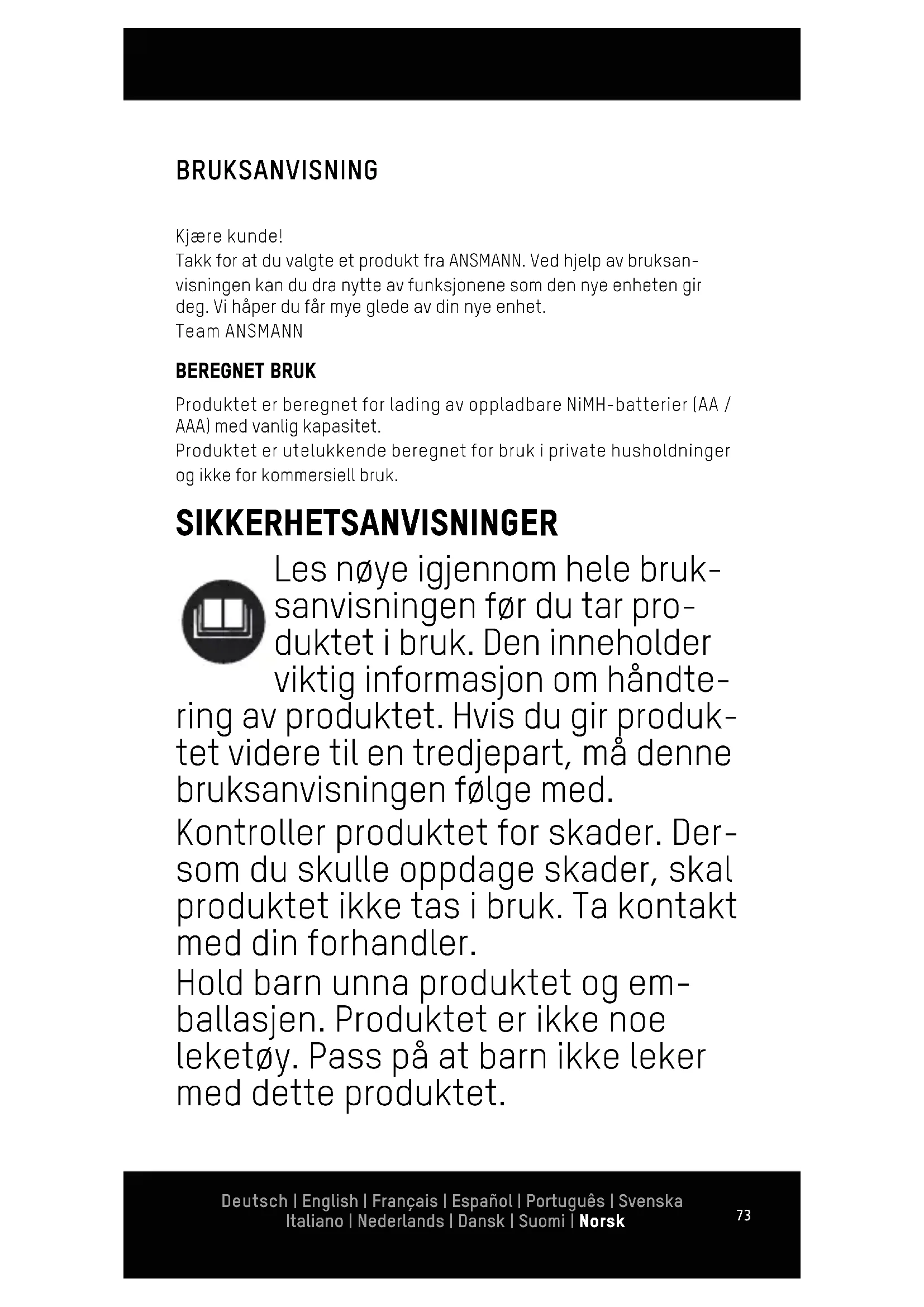 Rengjøring Koble produktet fra strømforsyningen før hver rengjøring og ta ut alle batteriene. Bruk bare en myk, tørr eller lett fuktet klut til rengjøring (eventuelt kan du tilføye et mildt oppvaskmiddel). Under ingen omstendighet må du bruke skurepulver eller løsemidler til rengjøring. TEKNISKE DATA Strømforsyning USB 5V, min. 1A for hurtiglading, maks. 2,4A Ladekanaler 2 Ladestrøm AA: 800mA / AAA: 400mA Vedlikeholdsladestrøm AA: 13 mA / AAA: 6,5mA Egnede batterityper (ulike typer eller kapasiteter kan kombineres på en hvilken som helst måte) Antall Type (NiMH) Maks. kapasitet 1-2 Mignon AA 3000 mAh Micro AAA 1100 mAh78 Deutsch | English | Français | Español | Português | Svenska Italiano | Nederlands | Dansk | Suomi | Norsk Ladetidtabell Type Kapasitet Ladetid ca. Ladestrøm Micro AAA 1000 mAh 3 h 400 mA 800 mAh 2,4 h Mignon AA 2650 mAh 4 h 800 mA 2500 mAh 3,75 h 2100 mAh 3 h 1300 mAh 2 h KASSERING Kasser produktet i henhold til gjeldende nasjonale bestemmel- ser. Symbolet "søppeldunk" angir at i EU skal elektrisk utstyr ikke kastes i vanlig husholdningsavfall. Bruk lokale retur- og innsam- lingssystemer, eller kontakt forhandleren der produktet ble kjøpt. Batterier og batteripakker er resirkulerbare materialer og skal ikke kastes sammen med husholdningsavfall. Lever batterier og batteripakker alltid på de respektive returpunktene. Derved oppfyller du dine lovbestemte plikter og yter ditt bidrag til miljøvern. ANSVARSFRASKRIVELSE Informasjon som gis i denne bruksanvisningen kan endres uten fo- rutgående varsel. ANSMANN overtar ikke ansvar for direkte, indirekte, tilfeldige eller andre skader eller følgeskader, som er forårsaket av feil bruk eller manglende overholdelse av informasjonen i denne bruksanvisningen. Vi overtar ikke ansvar og oppfyller ingen garanti- krav ved skader som skyldes feil bruk av produktet.