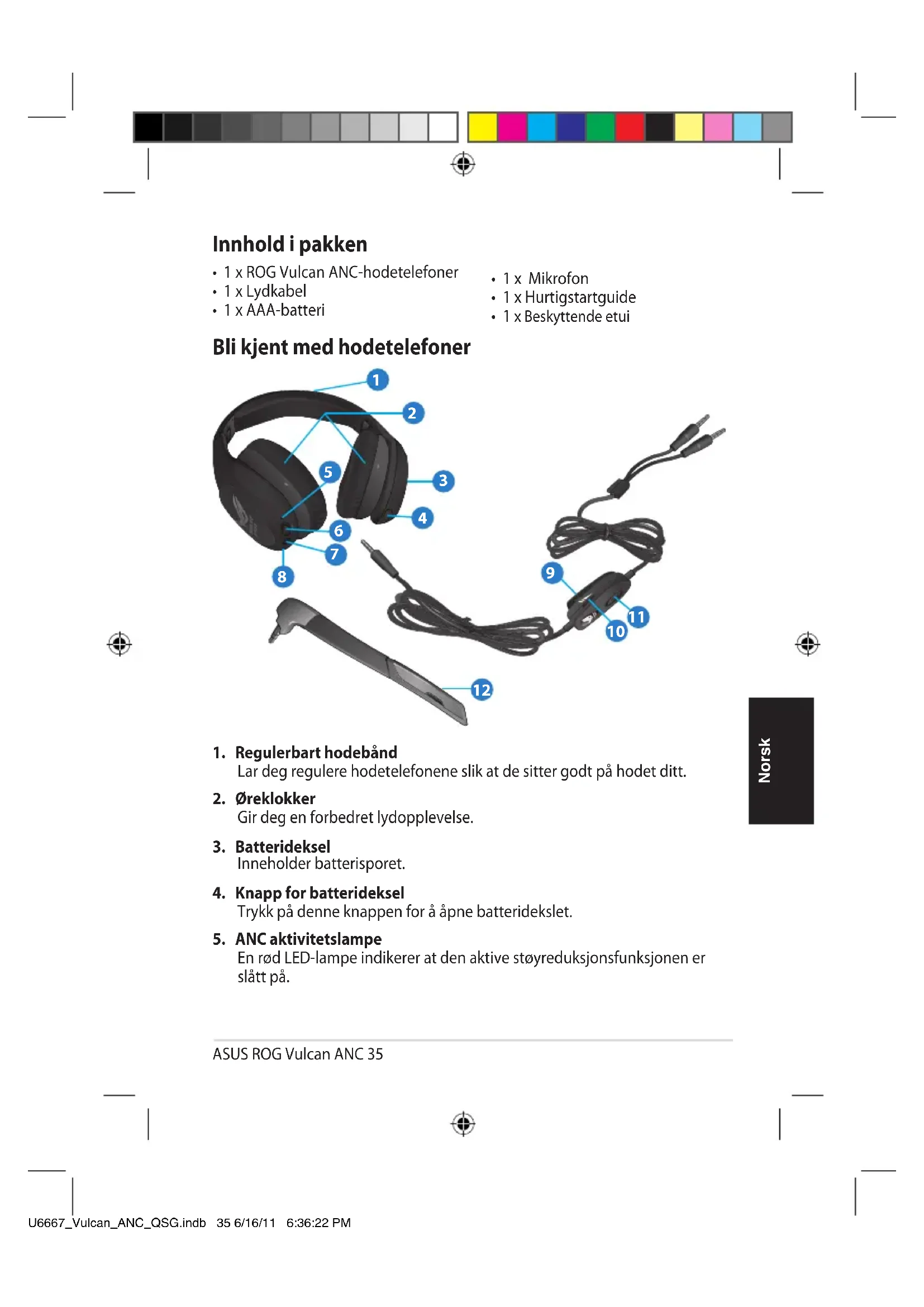 U6667_Vulcan_ANC_QSG.indb 34 6/16/11 6:36:19 PMASUS ROG Vulcan ANC 35 Norsk Norsk Bli kjent med hodetelefoner