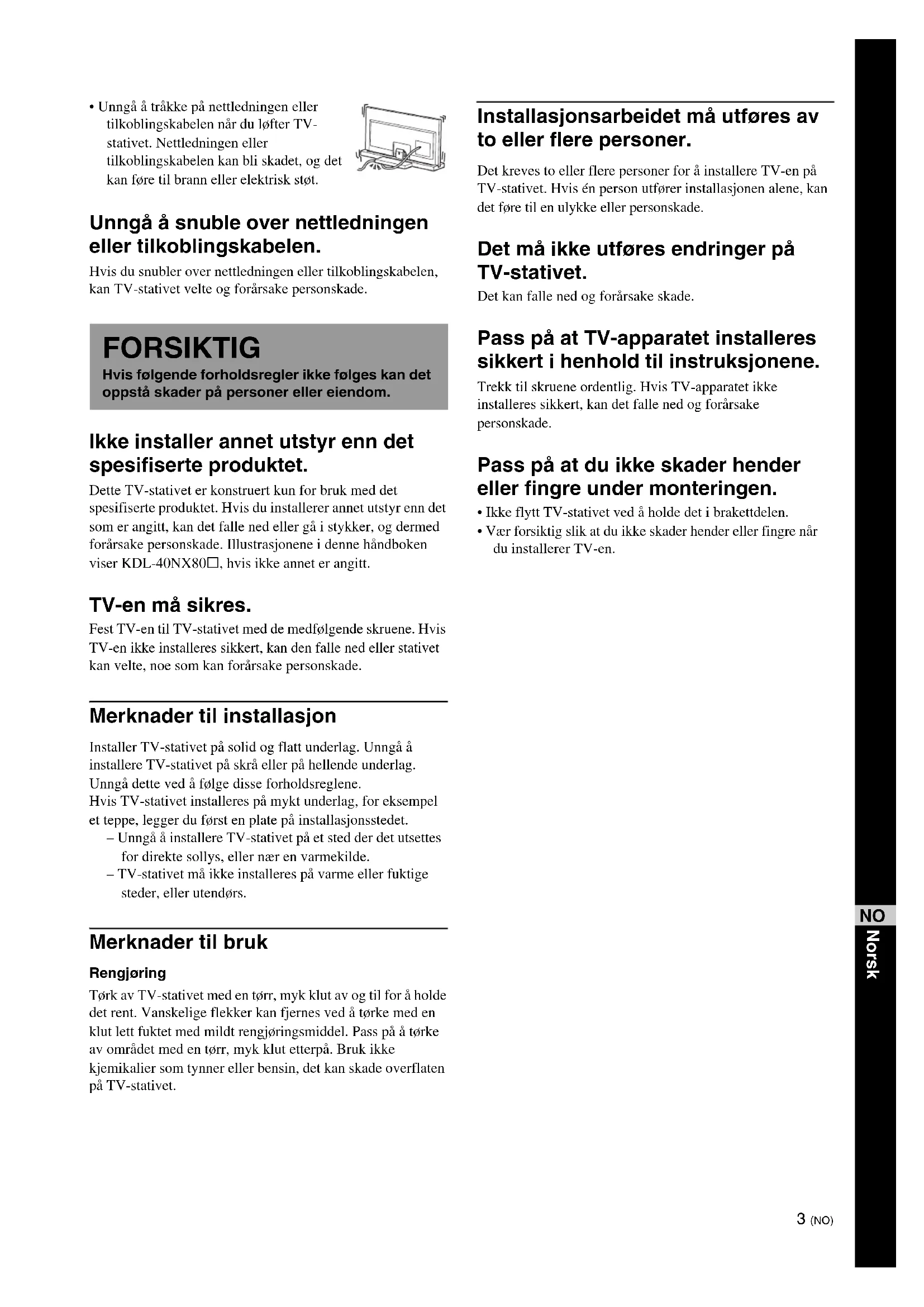 - Unngå å tråkke på nettledningen eller tilkoblingskabelen når du løfter TV- stativet. Nettledningen eller tilkoblingskabelen kan bli skadet, og det kan føre til brann eller elektrisk støt. Unngå å snuble over nettledningen eller tilkoblingskabelen. Hvis du snubler over nettledningen eller tilkoblingskabelen, kan TV-stativet velte og forårsake personskade. Ikke installer annet utstyr enn det spesifiserte produktet. Dette TV-stativet er konstruert kun for bruk med det spesifiserte produktet. Hvis du installerer annet utstyr enn det som er angitt, kan det falle ned eller gå i stykker, og dermed forårsake personskade. Illustrasjonene i denne håndboken viser KDL-40NX80s, hvis ikke annet er angitt. TV-en må sikres. Fest TV-en til TV-stativet med de medfølgende skruene. Hvis TV-en ikke installeres sikkert, kan den falle ned eller stativet kan velte, noe som kan forårsake personskade. Merknader til installasjon Installer TV-stativet på solid og flatt underlag. Unngå å installere TV-stativet på skrå eller på hellende underlag. Unngå dette ved å følge disse forholdsreglene. Hvis TV-stativet installeres på mykt underlag, for eksempel et teppe, legger du først en plate på installasjonsstedet. – Unngå å installere TV-stativet på et sted der det utsettes for direkte sollys, eller nær en varmekilde. – TV-stativet må ikke installeres på varme eller fuktige steder, eller utendørs. Merknader til bruk Rengjøring Tørk av TV-stativet med en tørr, myk klut av og til for å holde det rent. Vanskelige flekker kan fjernes ved å tørke med en klut lett fuktet med mildt rengjøringsmiddel. Pass på å tørke av området med en tørr, myk klut etterpå. Bruk ikke kjemikalier som tynner eller bensin, det kan skade overflaten på TV-stativet. Installasjonsarbeidet må utføres av to eller flere personer. Det kreves to eller flere personer for å installere TV-en på TV-stativet. Hvis én person utfører installasjonen alene, kan det føre til en ulykke eller personskade. Det må ikke utføres endringer på TV-stativet. Det kan falle ned og forårsake skade. Pass på at TV-apparatet installeres sikkert i henhold til instruksjonene. Trekk til skruene ordentlig. Hvis TV-apparatet ikke installeres sikkert, kan det falle ned og forårsake personskade. Pass på at du ikke skader hender eller fingre under monteringen.