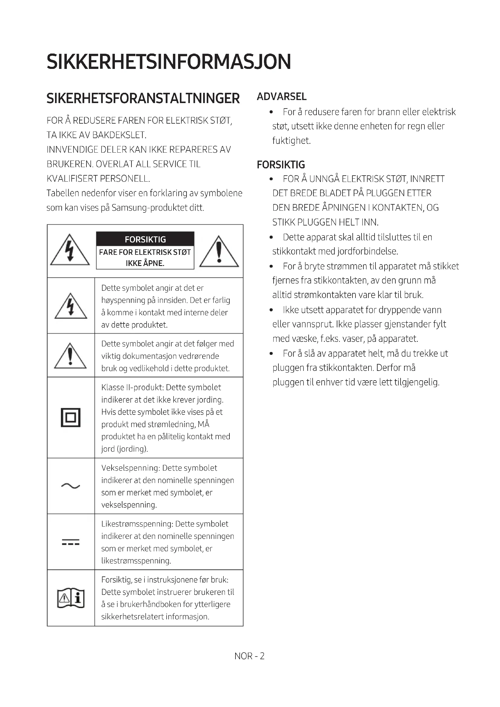 KVALIFISERT PERSONELL. Tabellen nedenfor viser en forklaring av symbolene som kan vises på Samsung-produktet ditt. FORSIKTIG FARE FOR ELEKTRISK STØT IKKE ÅPNE.Dette symbolet angir at det er høyspenning på innsiden. Det er farlig å komme i kontakt med interne deler av dette produktet.Dette symbolet angir at det følger med viktig dokumentasjon vedrørende bruk og vedlikehold i dette produktet.Klasse II-produkt: Dette symbolet indikerer at det ikke krever jording.Hvis dette symbolet ikke vises på et produkt med strømledning, MÅ produktet ha en pålitelig kontakt med jord (jording). Vekselspenning: Dette symbolet indikerer at den nominelle spenningen som er merket med symbolet, er vekselspenning.Likestrømsspenning: Dette symbolet indikerer at den nominelle spenningen som er merket med symbolet, er likestrømsspenning.Forsiktig, se i instruksjonene før bruk: Dette symbolet instruerer brukeren til å se i brukerhåndboken for ytterligere sikkerhetsrelatert informasjon. ADVARSEL