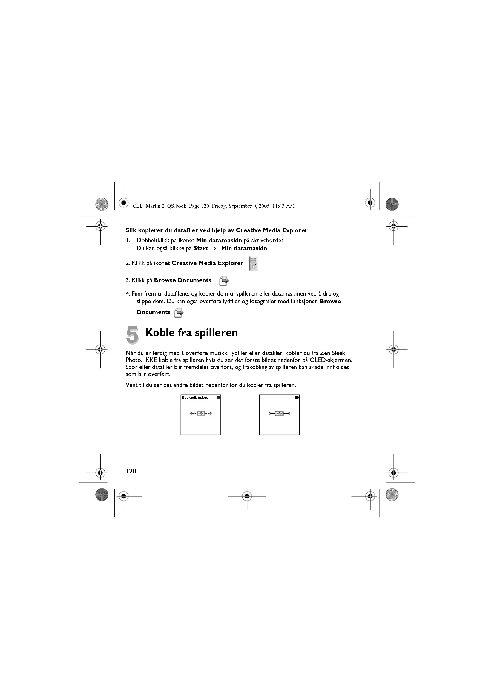 Koble fra spilleren Når du er ferdig med å overføre musikk, lydfiler eller datafiler, kobler du fra Zen Sleek Photo. IKKE koble fra spilleren hvis du ser det første bildet nedenfor på OLED-skjermen. Spor eller datafiler blir fremdeles overført, og frakobling av spilleren kan skade innholdet som blir overført. Vent til du ser det andre bildet nedenfor før du kobler fra spilleren. Docked Docked CLE_Marlin 2_QS.book Page 120 Friday, September 9, 2005 11:43 AM121 Lytte på FM-radio Du kan søke automatisk etter alle tilgjengelige radiostasjoner og lagre opptil 32 forhåndsinnstilte kanaler.