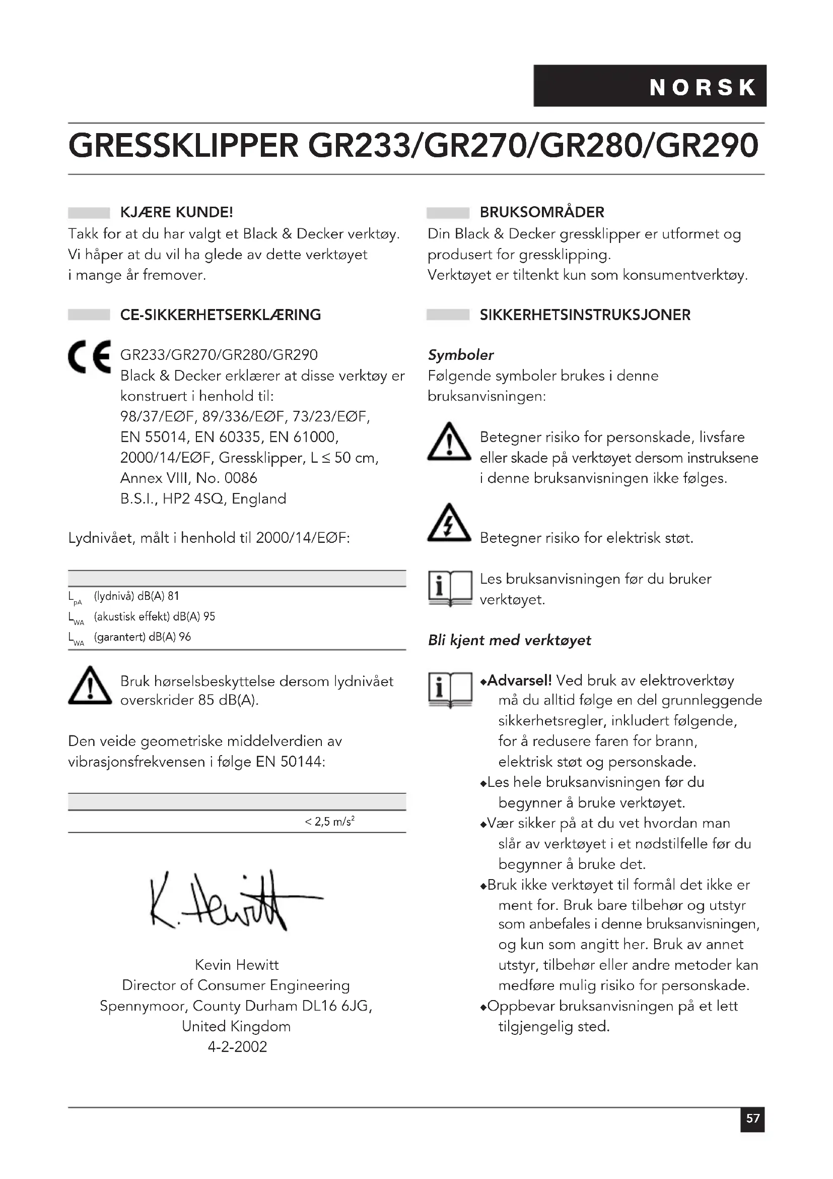 Kevin Hewitt Director of Consumer Engineering Spennymoor, County Durham DL16 6JG, United Kingdom 4-2-2002 BRUKSOMRÅDER Din Black & Decker gressklipper er utformet og produsert for gressklipping. Verktøyet er tiltenkt kun som konsumentverktøy. SIKKERHETSINSTRUKSJONER Symboler Følgende symboler brukes i denne bruksanvisningen: Betegner risiko for personskade, livsfare eller skade på verktøyet dersom instruksene i denne bruksanvisningen ikke følges. Betegner risiko for elektrisk støt. Les bruksanvisningen før du bruker verktøyet. Bli kjent med verktøyet ◆ Advarsel! Ved bruk av elektroverktøy må du alltid følge en del grunnleggende sikkerhetsregler, inkludert følgende, for å redusere faren for brann, elektrisk støt og personskade. ◆ Les hele bruksanvisningen før du begynner å bruke verktøyet. ◆ Vær sikker på at du vet hvordan man slår av verktøyet i et nødstilfelle før du begynner å bruke det. ◆ Bruk ikke verktøyet til formål det ikke er ment for. Bruk bare tilbehør og utstyr som anbefales i denne bruksanvisningen, og kun som angitt her. Bruk av annet utstyr, tilbehør eller andre metoder kan medføre mulig risiko for personskade. ◆ Oppbevar bruksanvisningen på et lett tilgjengelig sted.58 NORSK Arbeidsområde ◆ Ikke utsett verktøyet for regn. Ikke bruk verktøyet i fuktige eller våte omgivelser. ◆ Bruk bare verktøyet i dagslys eller med bra belysning. Personlig vern ◆ Bruk solide sko eller støvler, slik at du beskytter føttene. Bruk ikke verktøyet når du bruker sandaler eller går barfot. ◆ Beskytt bena ved å bruke langbukser. Bruk av verktøyet ◆ Pass på at verktøyet er slått av når du setter inn støpslet. ◆ Vær oppmerksom. Se på det du gjør. Bruk sunn fornuft. ◆ Bruk ikke verktøyet når du er trett. ◆ Hvis verktøyet begynner å vibrere på en unormal måte, slår du det av og trekker ut kontakten. Vent til roterende deler har stanset, og kontroller for eventuelle skader eller løse deler. ◆ Ikke trekk i ledningen når du skal kople fra støpslet. Utsett ikke ledningen for varme, olje, eller skarpe kanter. ◆ Hvis strømkabelen er blitt skadet under bruk, slår du av verktøyet og trekker ut støpslet umiddelbart. Du må ikke berøre strømledningen før du har koblet den fra strømforsyningen. Andre personers sikkerhet ◆ La aldri barn eller personer som ikke har lest denne bruksanvisningen benytte verktøyet. ◆ Ikke la barn, besøkende eller dyr komme i nærheten av arbeidsområdet eller berøre verktøyet eller strømledningen. ◆ Husk at brukeren kan holdes ansvarlig for ulykker eller skader som rammer andre mennesker eller deres eiendeler. Etter bruk ◆ Slå av verktøyet, trekk ut støpslet og kontroller at bevegelige deler har stanset før du går fra verktøyet, bytter, rengjør eller kontrollerer noen av delene på verktøyet. ◆ Når verktøyet ikke er i bruk, må det oppbevares på et tørt sted. Oppbevares utilgjengelig for barn. Kontroll og reparasjon ◆ Før bruk må du kontrollere verktøyet med hensyn til skader eller defekter. Kontroller at de bevegelige delene ikke har satt seg fast eller er feilmontert. Kontroller også at de øvrige delene og beskyttelsene ikke er skadet, og at det ikke foreligger noen andre feil som kan påvirke verktøyets funksjon. ◆ Bruk aldri verktøyet hvis noen av delene er skadet. Ikke bruk verktøyet hvis det ikke er mulig å slå det på og av med strømbryteren. ◆ Bruk aldri verktøyet hvis beskyttelsesinnretningene er skadet eller ikke er på plass. ◆ Kontroller at verktøyet fungerer som det skal, og utfører beregnet funksjon. ◆ Hvis feil oppstår, skal delene repareres eller byttes ut av et autorisert Black & Decker- serviceverksted. ◆ Før bruk må du kontrollere om strømledningen er skadet eller slitt. ◆ Bruk aldri verktøyet hvis strømledningen er skadet. ◆ Hvis strømledningen er skadet, må den byttes ut av en autorisert reparasjonstekniker for å unngå farlige situasjoner. ◆ Prøv aldri å fjerne eller bytte andre deler enn de som er angitt i denne bruksanvisningen. Ytterligere sikkerhetsinstruksjoner for gressklippere Du finner følgende varselssymboler på verktøyet: Ha på deg vernebriller når du bruker dette verktøyet. Kniven fortsetter å gå i et par sekunder etter at verktøyet er slått av. Prøv aldri å tvinge kniven til å stoppe.