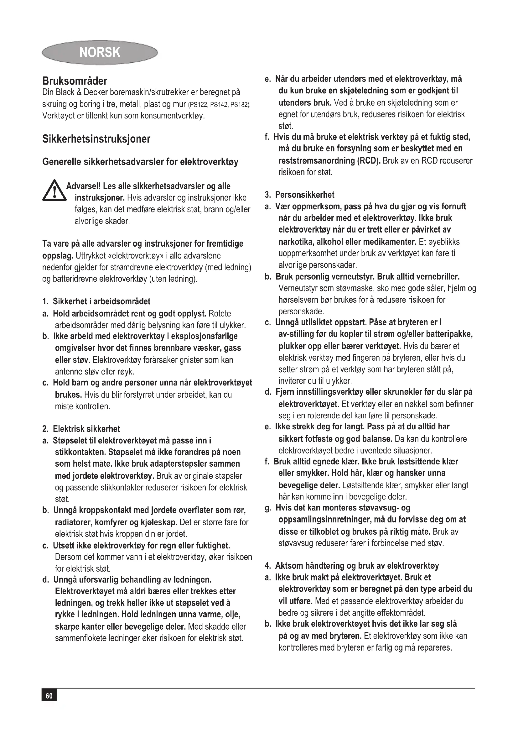 Kevin Hewitt Adm. dir. for forbrukerteknikk Spennymoor, County Durham DL16 6JG, Storbritannia 16-6-2008 Informasjon om design og patent Europeisk patentsøknadsnr. 06114236.0 Europeisk designsøknadsnummer 000681960 Reservdeler / reparasjoner Reservdeler kan kjøpes hos autoriserte Black & Decker serviceverksteder, som også gir kostnadsoverslag og reparerer våre produkter. Oversikt over våre autoriserte serviceverksteder finnes på Internet, vår hjemmeside www.blackanddecker.no samt www.2helpU.com Garanti Black & Decker garanterer at produktet ikke har material- og/eller fabrikasjonsfeil ved levering til kunde. Garantien er i tillegg til kundens lovlige rettigheter og påvirker ikke disse. Garantien gjelder innen medlemsstatene i den Europeiske Unionen og i det Europeiske Frihandelsområdet. Hvis et Black & Decker produkt går i stykker på grunn av material- og/eller fabrikasjonsfeil eller har mangler i forhold til spesifikasjonene, innen 24 måneder fra kjøpet, påtar Black & Decker seg å reparere eller bytte ut produktet med minst mulig vanskelighet for kunden. Garantien gjelder ikke for feil som kommer av: normal slittasje feilaktig bruk eller vedlikehold (mislighold)66 NORSK at produktet har blitt skadet av fremmede gjenstander, emner eller ved et uhell Det gjøres oppmerksom på at produktet ikke er beregnet på industriell/profesjonell/yrkesmessig bruk, men til hus- og hjemmebruk. Garantien gjelder ikke om reparasjoner har blitt utført av noen andre enn et autorisert Black & Decker serviceverksted. For å ta garantien i bruk skal produktet og kjøpekvittering leveres til forhandleren eller til et autorisert serviceverksted senest 2 måneder etter at feilen har blitt oppdaget. For informasjon om nærmeste autoriserte serviceverksted; kontakt det lokale Black & Decker kontoret på den adressen som er angitt i bruksanvisningen. En oversikt over alle autoriserte serviceverksteder samt servicevilkår finnes også tilgjengelig på Internet, adresse: www.2helpU.com Vennligst stikk innom våre nettsider på www.blackanddecker.no for å registrere ditt nye Black & Decker-produkt og for å holde deg oppdatert om nye produkter og spesialtilbud. Du finner mer informasjon om Black & Decker og produktutvalget vårt på www.blackanddecker.no67 DANSK Anvendelsesområde Din Black & Decker boremaskine/skruetrækker er designet til bore- og skrueopgaver i træ, metal, plastik og murværk (PS122, PS142, PS182). Værktøjet er kun beregnet til privat brug. Sikkerhedsinstruktioner Generelle sikkerhedsadvarsler for værktøjet