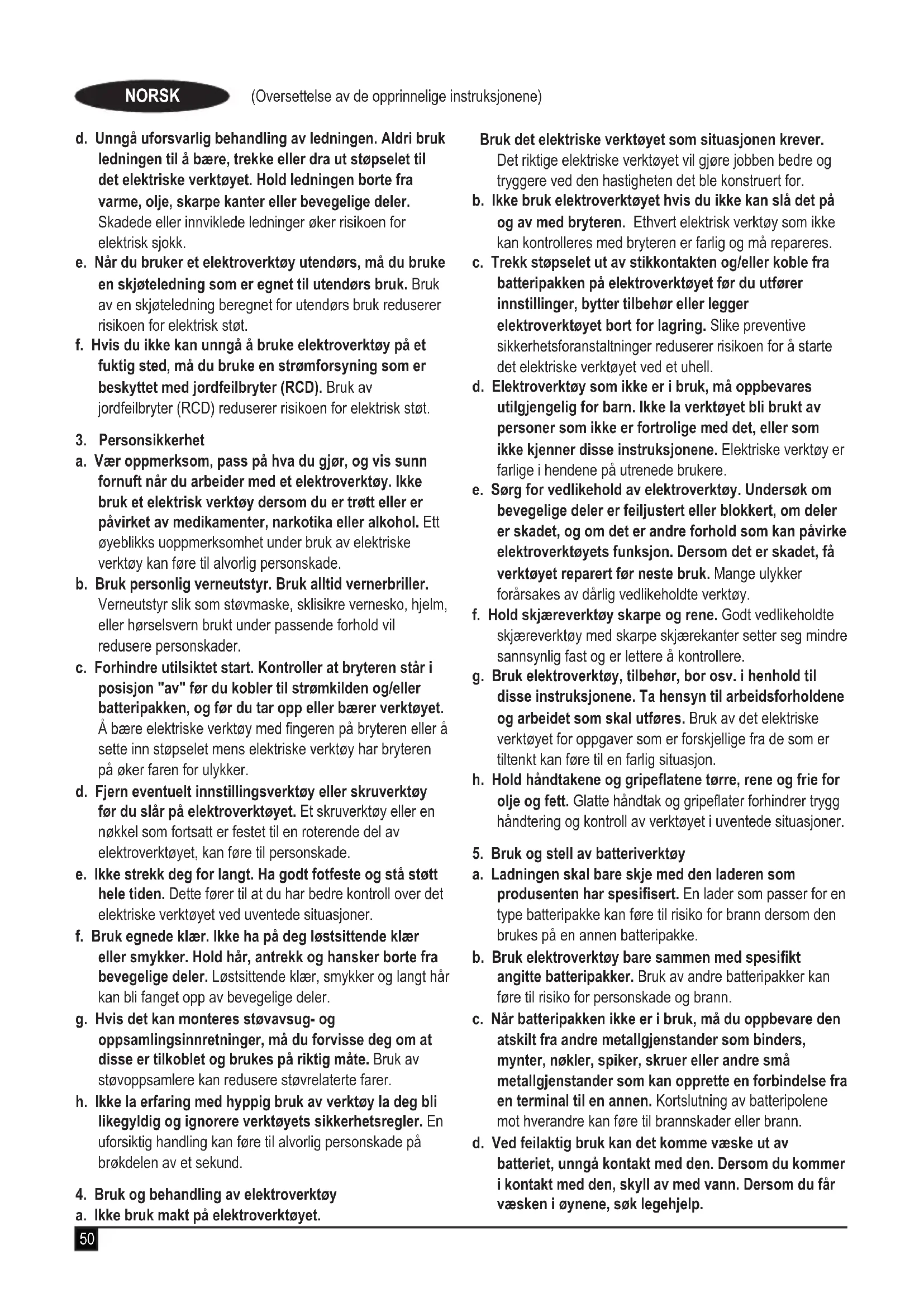 a. Støpselet til verktøyet må passe til stikkontakten. Aldri modiser støpselet på noen måte. Ikke bruk adapterstøpsler til jordede elektriske verktøy. Umodiserte støpsler og stikkontakter som passer vil redusere risikoen for elektrisk sjokk. b. Unngå kroppskontakt med jordede overater som rør, radiatorer, komfyrer og kjøleskap. Det er økt risiko for elektrisk støt dersom kroppen din er jordet. c. Ikke utsett elektroverktøy for regn eller fuktighet. Dersom det kommer vann inn i et elektrisk verktøy vil det øke risikoen for elektrisk sjokk.50 (Oversettelse av de opprinnelige instruksjonene) NORSK d. Unngå uforsvarlig behandling av ledningen. Aldri bruk ledningen til å bære, trekke eller dra ut støpselet til det elektriske verktøyet. Hold ledningen borte fra varme, olje, skarpe kanter eller bevegelige deler. Skadede eller innviklede ledninger øker risikoen for elektrisk sjokk. e. Når du bruker et elektroverktøy utendørs, må du bruke en skjøteledning som er egnet til utendørs bruk. Bruk av en skjøteledning beregnet for utendørs bruk reduserer risikoen for elektrisk støt. f. Hvis du ikke kan unngå å bruke elektroverktøy på et fuktig sted, må du bruke en strømforsyning som er beskyttet med jordfeilbryter (RCD). Bruk av jordfeilbryter (RCD) reduserer risikoen for elektrisk støt.