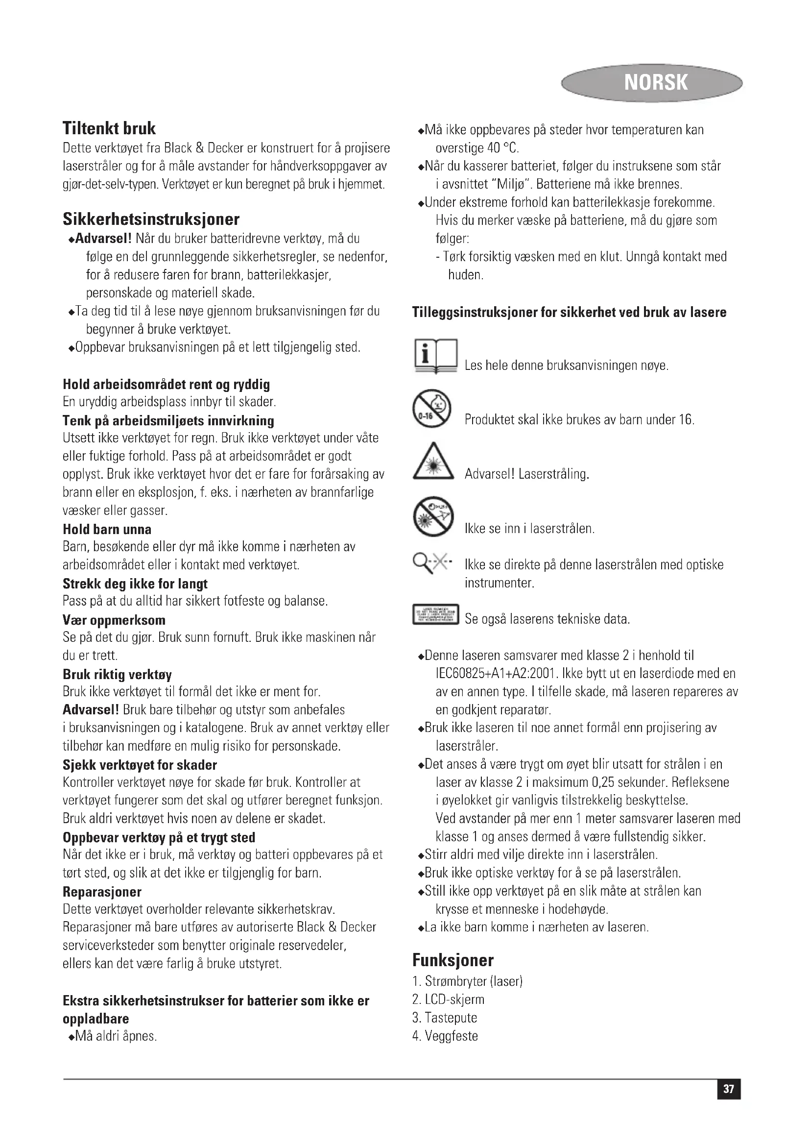 Last ned instruksjonene for din Laserpeker i PDF-format gratis! Finn veiledningen din BDL500M - BLACK & DECKER og ta den elektroniske enheten tilbake i hendene. På denne siden er alle dokumenter som er nødvendige for bruken av enheten din publisert. BDL500M av merket BLACK & DECKER.