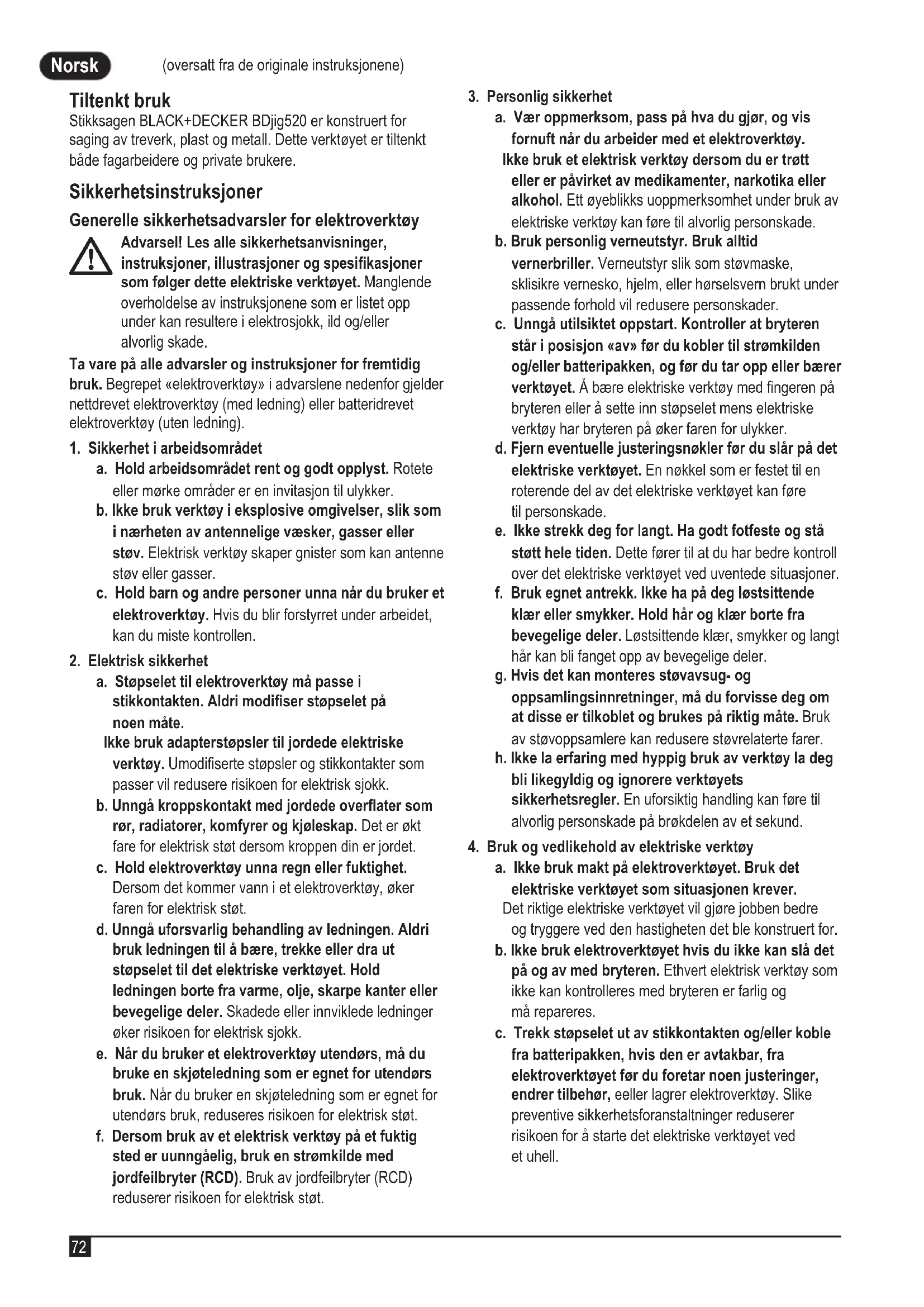 (oversatt fra de originale instruksjonene) Norsk (oversatt fra de originale instruksjonene) Tiltenkt bruk Stikksagen BLACK+DECKER BDjig520 er konstruert for saging av treverk, plast og metall. Dette verktøyet er tiltenkt både fagarbeidere og private brukere. Sikkerhetsinstruksjoner Generelle sikkerhetsadvarsler for elektroverktøy