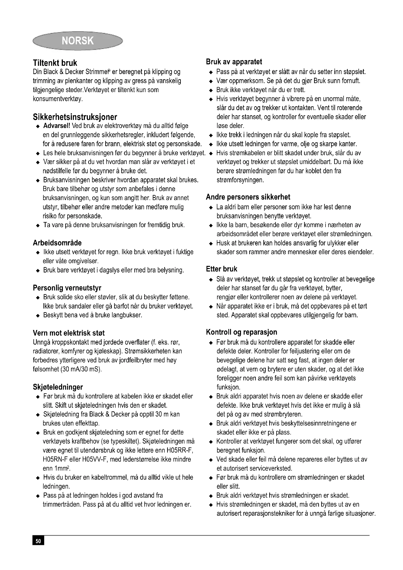 er beregnet på klipping og trimming av plenkanter og klipping av gress på vanskelig tilgjengelige steder.Verktøyet er tiltenkt kun som konsumentverktøy. Sikkerhetsinstruksjoner Advarsel! Ved bruk av elektroverktøy må du alltid følge en del grunnleggende sikkerhetsregler, inkludert følgende, for å redusere faren for brann, elektrisk støt og personskade. Les hele bruksanvisningen før du begynner å bruke verktøyet. Vær sikker på at du vet hvordan man slår av verktøyet i et nødstilfelle før du begynner å bruke det. Bruksanvisningen beskriver hvordan apparatet skal brukes. Bruk bare tilbehør og utstyr som anbefales i denne bruksanvisningen, og kun som angitt her. Bruk av annet utstyr, tilbehør eller andre metoder kan medføre mulig risiko for personskade. Ta vare på denne bruksanvisningen for fremtidig bruk. Arbeidsområde Ikke utsett verktøyet for regn. Ikke bruk verktøyet i fuktige eller våte omgivelser. Bruk bare verktøyet i dagslys eller med bra belysning. Personlig verneutstyr Bruk solide sko eller støvler, slik at du beskytter føttene. Ikke bruk sandaler eller gå barfot når du bruker verktøyet. Beskytt bena ved å bruke langbukser. Vern mot elektrisk støt Unngå kroppskontakt med jordede overflater (f. eks. rør, radiatorer, komfyrer og kjøleskap). Strømsikkerheten kan forbedres ytterligere ved bruk av jordfeilbryter med høy følsomhet (30 mA/30 mS). Skjøteledninger Før bruk må du kontrollere at kabelen ikke er skadet eller slitt. Skift ut skjøteledningen hvis den er skadet. Skjøteledning fra Black & Decker på opptil 30 m kan brukes uten effekttap. Bruk en godkjent skjøteledning som er egnet for dette verktøyets kraftbehov (se typeskiltet). Skjøteledningen må være egnet til utendørsbruk og ikke lettere enn H05RR-F, H05RN-F eller H05VV-F, med lederstørrelse ikke mindre enn 1mm
