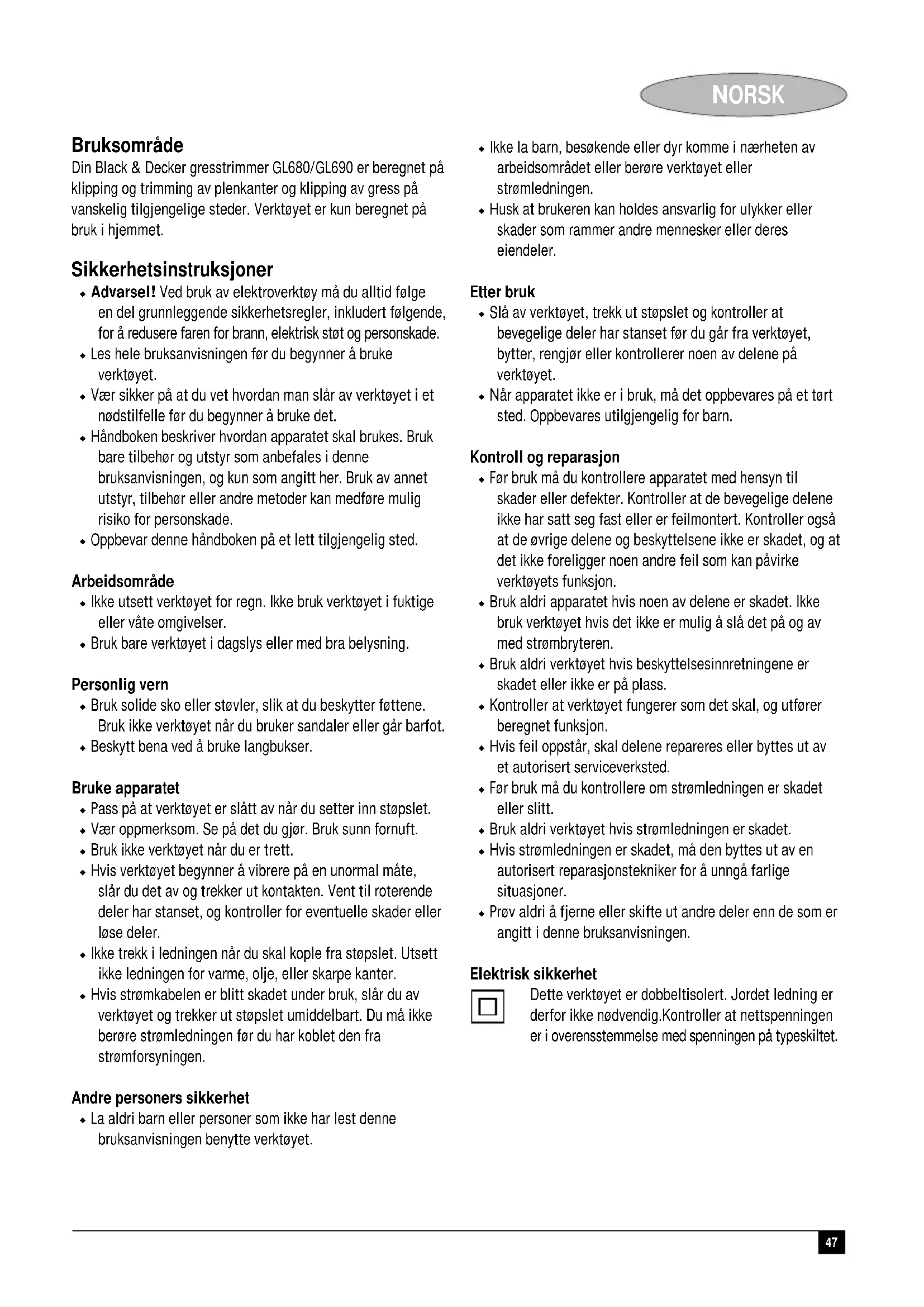 Last ned instruksjonene for din Gressklipper i PDF-format gratis! Finn veiledningen din GL687 - BLACK & DECKER og ta den elektroniske enheten tilbake i hendene. På denne siden er alle dokumenter som er nødvendige for bruken av enheten din publisert. GL687 av merket BLACK & DECKER.