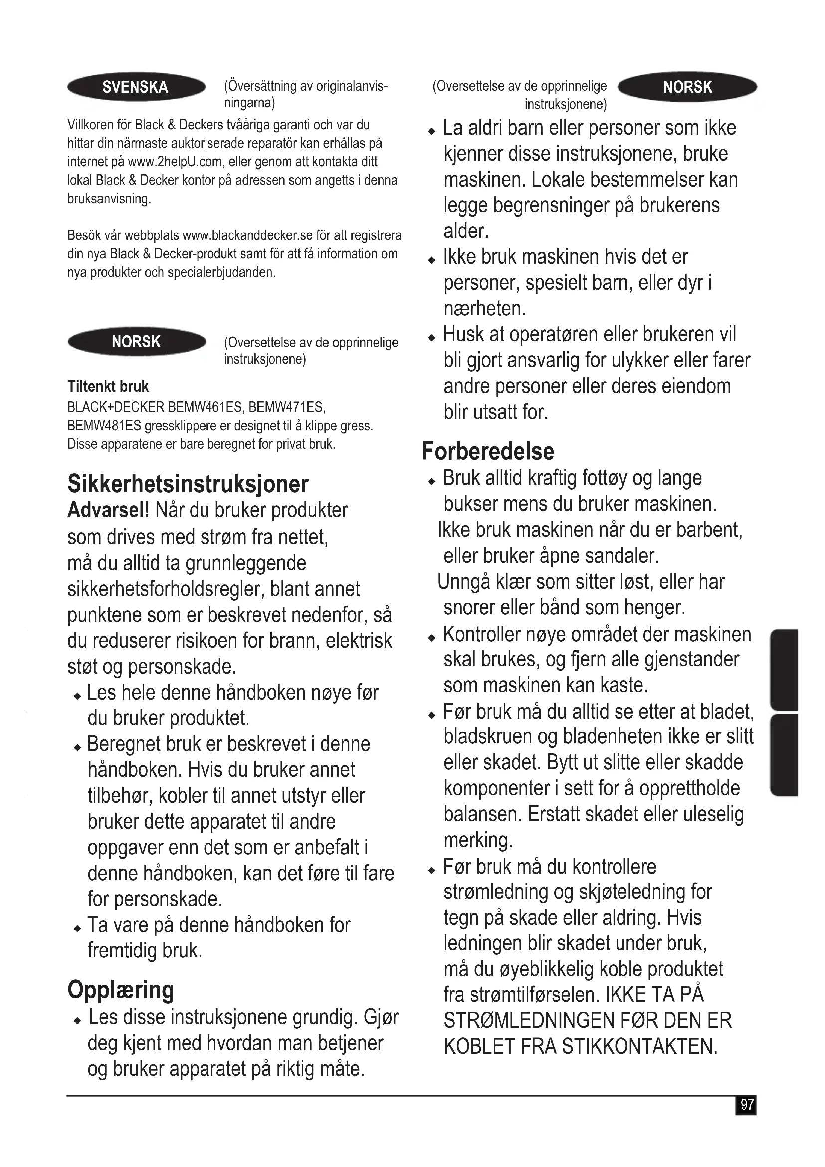 (Oversettelse av de opprinnelige instruksjonene) NORSK Ikke bruk maskinen hvis ledningen er skadet eller slitt. u Benytt vernebriller når du bruker dette produktet. Bruk ansiktsmaske eller støvmaske når det er støv i området der du arbeider. Bruk hørselvern når lydnivået er ubehagelig. u Vern mot elektrisk støt. Unngå å komme i kontakt med jordede overater (for eksempel metallrekkverk, lyktestolper osv.). Bruk u Ikke bruk produktet med defekte vern eller skjold eller uten at sikkerhetsutstyr, for eksempel deektorer og/eller gressamlere, er på plass. u Bruk apparatet bare i dagslys eller god kunstig belysning. u Ikke utsett produktet for regn. Ikke bruk produktet hvis det er fuktig eller vått. Produktet skal helst ikke brukes i vått gress. u Pass på at du har godt fotfeste, særlig i skråninger. Husk at nylig kuttet gress er fuktig og glatt. Ikke arbeid i bratte skråninger. u Arbeid på langs av skråninger, aldri opp og ned. Vær svært forsiktig når du endrer retning i skråninger. u Ikke klipp gresset i svært bratte skråninger. u Gå, og løp aldri, når du bruker produktet. Ikke trekk produktet mot deg, og gå ikke baklengs når du bruker det. u Skru på produktet i samsvar med instruksjonene, og ha føttene godt unna bladet. u Ikke start maskinen når du står foran utmatingsåpningen. u Ikke vipp produktet når du slår det på, hvis det ikke må vippes for starting. I så fall, vipper du ikke produktet mer enn absolutt nødvendig og løfter bare den delen som er lengst fra brukeren. Pass alltid på at begge hender er i betjeningsposisjon før du setter produktet ned på bakken igjen. u Slå av produktet, og vent til bladenheten stanser hvis produktet må vippes for ytting når du krysser andre overater enn gress, og når du ytter produktet til og fra området som skal klippes. u Ikke løft eller bær produktet før bladet har stanset helt. u Hold hendene og føttene godt unna bladet. u Ikke ha hendene eller føttene i nærheten av eller under roterende deler. u Hold deg alltid unna utmatingsåpninger. u Slå av produktet, trekk støpselet ut av stikkontakten, og forsikre deg om at bevegelige deler har sluttet å rotere før du lar produktet stå uten tilsyn, og før du skifter, rengjør eller kontrollerer noen deler av produktet eller fjerner en blokkering. Etter at du har truffet en fremmed gjenstand.99 (Oversettelse av de opprinnelige instruksjonene) NORSK Undersøk om maskinen er skadet, og utfør reparasjoner før du starter og bruker maskinen på nytt; u Hvis produktet begynner å vibrere unormalt, eller hvis du treffer en fremmed gjenstand, slår du av produktet og trekker støpselet ut av stikkontakten. Undersøk om maskinen er skadet, bytt eller reparer skadete deler, undersøk om deler er løse, og stram om nødvendig. u Pass på å holde strømledningen unna bladet. Vær alltid oppmerksom på hvor ledningen er. u Motoren fortsetter å gå noen sekunder etter at du har slått av produktet. Prøv aldri å stanse bladet med makt. Vedlikehold og oppbevaring u Kontroller at apparatet ikke er skadet eller har defekte deler før du bruker det. Kontroller at bevegelige deler ikke er ute av posisjon og ikke klemmes fast, at deler, inkludert vern eller brytere, ikke er skadet, og at det ikke er andre forhold som kan virke inn på funksjonen. Forsikre deg om at produktet fungerer riktig og utfører funksjonen det er beregnet for. Bruk aldri produktet hvis vern eller deksler er skadet eller ute av posisjon. Ikke bruk apparatet hvis en del er skadet eller defekt. Ikke bruk apparatet hvis det ikke kan slås på og av med bryteren.Overlat reparasjon eller utskifting av skadde eller defekte deler til et autorisert serviceverksted. u Kontroller ofte at kabelen ikke er skadet. Hvis kabelen er skadet, må den skiftes hos et autorisert serviceverksted så man unngår fare. Undersøk skjøteledninger regelmessig. Skift ut skjøteledningen straks hvis den er skadet. u Pass på at alle muttere og skruer på produktet er godt tilskrudd, så du sikrer trygge arbeidsforhold. u Kontroller om gressoppsamleren er slitt eller skadet, og bytt den hvis det trengs. Bruk aldri produktet uten gressoppsamleren. u Vær forsiktig når du justerer maskinen så du unngår å klemme ngrene mellom bevegelige og faste deler på maskinen. u Når du vedlikeholder bladene, må du være klar over at selv om strømmen er av, kan bladene fremdeles bevege seg. u Når det ikke er i bruk, skal apparatet oppbevares på et tørt sted. Barn skal ikke ha tilgang til apparater som oppbevares. u La alltid maskinen bli avkjølt før den oppbevares. u Pass på at det bare brukes reserveskjæreredskaper av riktig type. u Bruk bare reservedeler og tilbehør som anbefales av BLACK+DECKER.100 (Oversettelse av de opprinnelige instruksjonene) NORSK Ytterligere sikkerhetsinstruksjoner for gressklippere u Bruk alltid en godkjent skjøteledning som passer til inngangseffekten for dette verktøyet (se tekniske data). Skjøteledningen må passe for utendørs bruk og skal være merket i samsvar med dette. Opptil 30 m 1.5 mm² HO5VV V-F-skjøteledning kan brukes uten tap av ytelse for produktet. Før bruk må du undersøke skjøteledningen for tegn på skade, slitasje og aldring. Bytt skjøteledningen hvis den er skadet eller defekt. Vikle alltid ut kabelen fullstendig når du bruker en kabeltrommel. u Ikke transporter maskinen mens strømkilden er aktiv u Hold godt fast i håndtaket med begge hender når du bruker gressklipperen. u Hvis det på noe tidspunkt er nødvendig å vippe gressklipperen til én side, sørg for at begge hender forblir i denne betjeningsposisjonen mens gressklipperen vippes. Hold begge hender i betjeningsposisjonen helt til gressklipperen er satt riktig tilbake på bakken igjen. u Du må aldri bruke hodetelefoner for radio eller musikk når du bruker gressklipperen. u Forsøk aldri å justere høyden på hjulene mens motoren går, eller mens sikkerhetsnøkkelen er i bryterhuset. u Hvis gressklippere