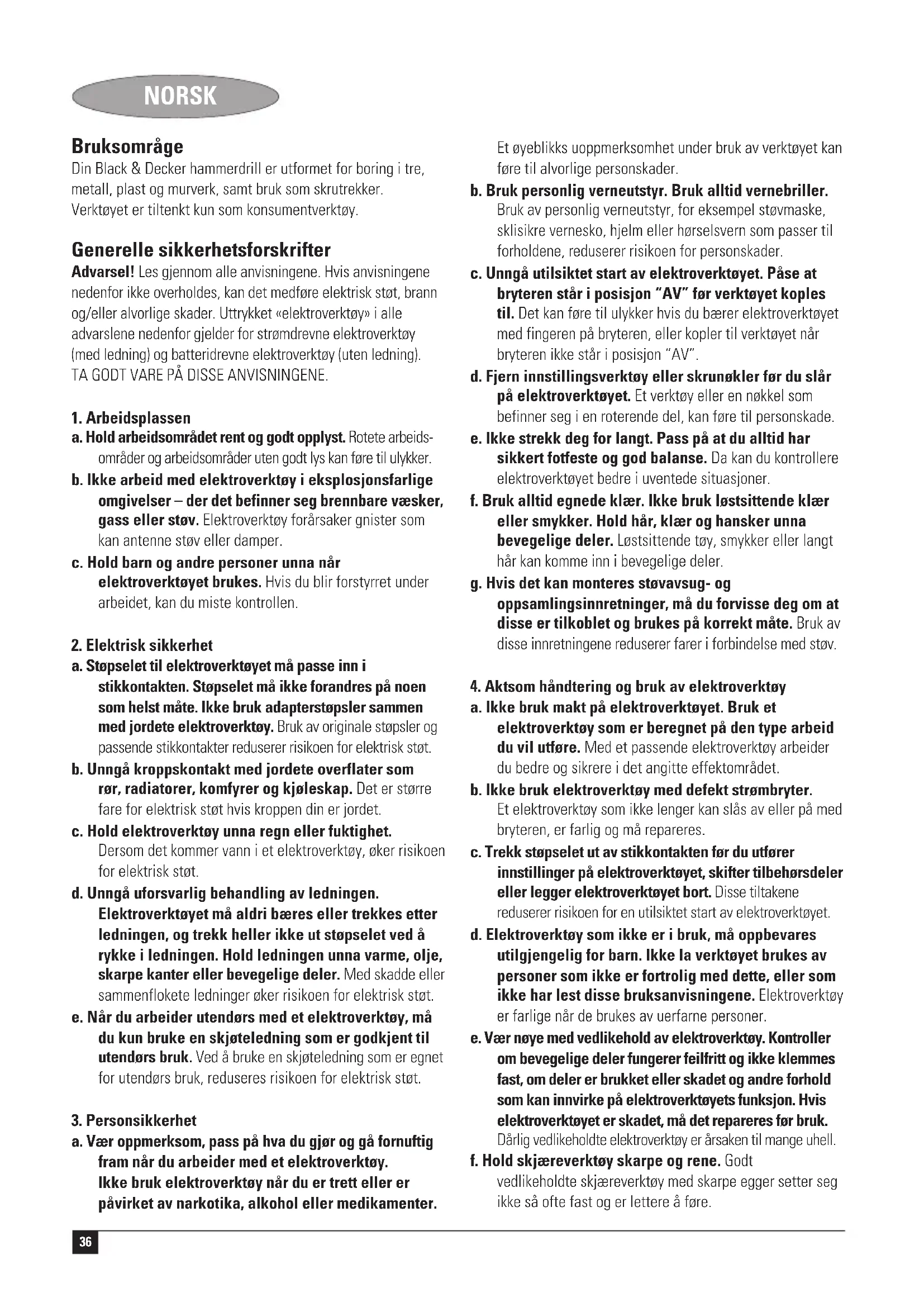(usikkerhet i akustisk effekt) 3 dB(A) Kevin Hewitt Adm. dir. for forbrukerteknikk Spennymoor, County Durham DL16 6JG, Storbritannia 1-9-2005 Reservdeler / reparasjoner Reservdeler kan kjøpes hos autoriserte Black & Decker serviceverksteder, som også gir kostnadsoverslag og reparerer våre produkter. Oversikt over våre autoriserte serviceverksteder finnes på Internet, vår hjemmeside www.blackdecker.no samt www.2helpU.com. Garanti Black & Decker garanterer at produktet ikke har material- og/ eller fabrikasjonsfeil ved levering til kunde. Garantien er i tillegg til kundens lovlige rettigheter og påvirker ikke disse. Garantien gjelder innen medlemsstatene i den Europeiske Unionen og i det Europeiske Frihandelsområdet. Hvis et Black & Decker produkt går i stykker på grunn av material- og/eller fabrikasjonsfeil eller har mangler i forhold til spesifikasjonene, innen 24 måneder fra kjøpet, påtar Black & Decker seg å reparere eller bytte ut produktet med minst mulig vanskelighet for kunden. Garantien gjelder ikke for feil som kommer av: ◆ normal slittasje ◆ feilaktig bruk eller vedlikehold (mislighold) ◆ at produktet har blitt skadet av fremmede gjenstander, emner eller ved et uhell Det gjøres oppmerksom på at produktet ikke er beregnet på industriell/profesjonell/yrkesmessig bruk, men til hus- og hjemmebruk. Garantien gjelder ikke om reparasjoner har blitt utført av noen andre enn et autorisert Black & Decker serviceverksted. For å ta garantien i bruk skal produktet og kjøpekvittering leveres til forhandleren eller til et autorisert serviceverksted senest 2 måneder etter at feilen har blitt oppdaget. For informasjon om nærmeste autoriserte serviceverksted; kontakt det lokale Black & Decker kontoret på den adressen som er angitt i bruksanvisningen. En oversikt over alle autoriserte serviceverksteder samt servicevilkår finnes også tilgjengelig på Internet, adresse: www.2helpU.com. Vennligst registrer deg på nettsiden vår: www.blackanddecker.com for å holde deg oppdatert om nye produkter og spesialtilbud. Du finner mer informasjon om Black & Decker og produktutvalget vårt på www.blackanddecker.com.40 DANSK Anvendelsesområde Din Black & Decker borehammer er designet til at bore i træ, metal, plastic og murværk samt til skruetrækning. Værktøjet er kun beregnet til privat brug. Generelle sikkerhedsregler Advarsel! Læs alle instrukserne. Hvis nedenstående instrukser ikke følges, er der risiko for elektrisk stød, brand og/eller alvorlige personskader. Det benyttede begreb “el-værktøj“ i nedennævnte advarsler refererer til netdrevne (med tilslutningsledning) eller batteridrevne maskiner (uden tilslutningsledning). DISSE INSTRUKSER BØR OPBEVARES TIL SENERE BRUG.