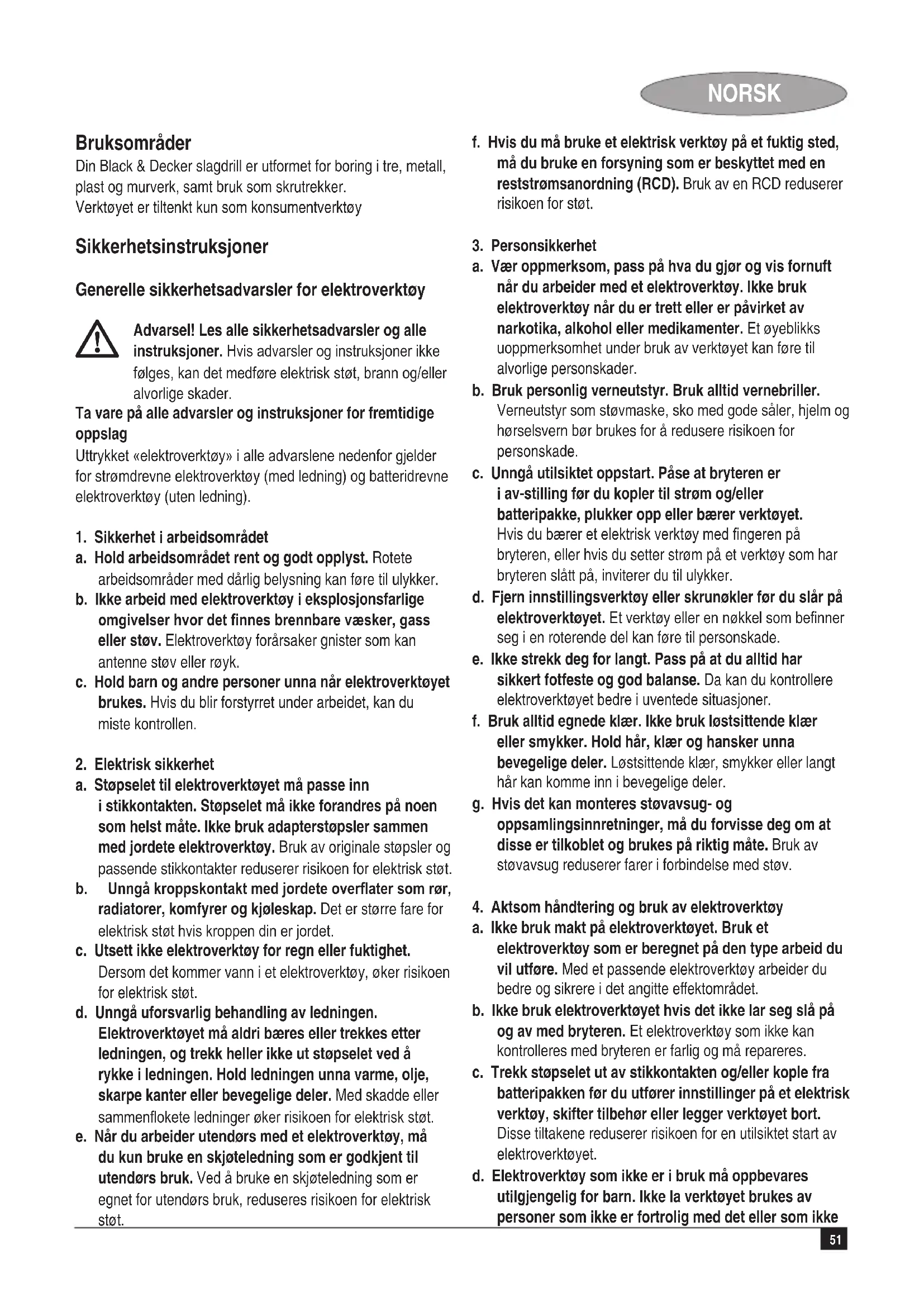 Kevin Hewitt Visepresident, Global Engineering Black & Decker Europe, 210 Bath Road, Slough, Berkshire, SL1 3YD Storbritannia 30/03/2010 Reservdeler / reparasjoner Reservdeler kan kjøpes hos autoriserte Black & Decker serviceverksteder, som også gir kostnadsoverslag og reparerer våre produkter. Oversikt over våre autoriserte serviceverksteder nnes på Internet, vår hjemmeside www.blackanddecker.no samt www.2helpU.com Garanti Black & Decker garanterer at produktet ikke har material- og/ eller fabrikasjonsfeil ved levering til kunde. Garantien er i tillegg til kundens lovlige rettigheter og påvirker ikke disse. Garantien gjelder innen medlemsstatene i den Europeiske Unionen og i det Europeiske Frihandelsområdet. Hvis et Black & Decker produkt går i stykker på grunn av material- og/eller fabrikasjonsfeil eller har mangler i forhold til spesikasjonene, innen 24 måneder fra kjøpet, påtar Black & Decker seg å reparere eller bytte ut produktet med minst mulig vanskelighet for kunden. Garantien gjelder ikke for feil som kommer av: u normal slittasjeu feilaktig bruk eller vedlikehold (mislighold)u at produktet har blitt skadet av fremmede gjenstander, emner eller ved et uhell Det gjøres oppmerksom på at produktet ikke er beregnet på industriell/profesjonell/yrkesmessig bruk, men til hus- og hjemmebruk. Garantien gjelder ikke om reparasjoner har blitt utført av noen andre enn et autorisert Black & Decker serviceverksted. For å ta garantien i bruk skal produktet og kjøpekvittering leveres til forhandleren eller til et autorisert serviceverksted senest 2 måneder etter at feilen har blitt oppdaget. For informasjon om nærmeste autoriserte serviceverksted; kontakt det lokale Black & Decker kontoret på den adressen som er angitt i bruksanvisningen. En oversikt over alle autoriserte serviceverksteder samt servicevilkår nnes også tilgjengelig på Internet, adresse: www.2helpU.com Vennligst stikk innom våre nettsider på www.blackanddecker. no for å registrere ditt nye Black & Decker-produkt og for å holde deg oppdatert om nye produkter og spesialtilbud. Du nner mer informasjon om Black & Decker og produktutvalget vårt på www.blackanddecker.no56 DANSK Anvendelsesområde Din Black & Decker slagboremaskine er designet til at bore i træ, metal, plastic og murværk samt til skruetrækning. Værktøjet er kun beregnet til privat brug. Sikkerhedsinstruktioner Generelle sikkerhedsadvarsler for værktøjet