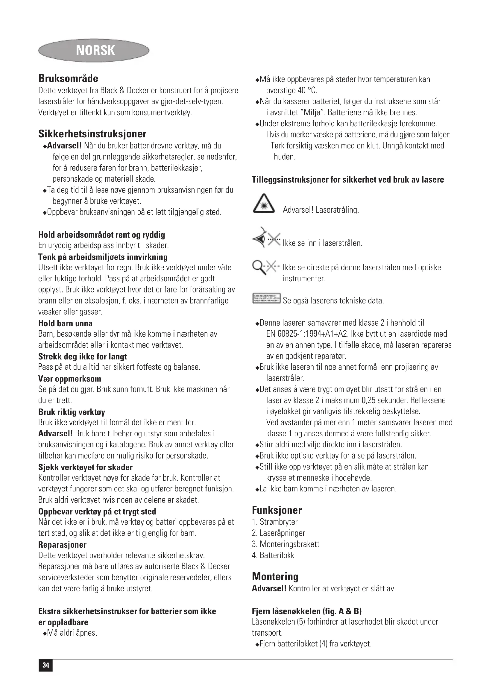 Montering Advarsel! Kontroller at verktøyet er slått av. Fjern låsenøkkelen (fig. A & B) Låsenøkkelen (5) forhindrer at laserhodet blir skadet under transport. ◆ Fjern batterilokket (4) fra verktøyet.35 NORSK ◆ Vri låsenøkkelen (5) en kvart omgang og ta den ut. ◆ For å sette låsenøkkelen på plass igjen, stikk den inn i hullet (6) som vist og vri den en kvart omgang. ◆ Sett på batterilokket igjen og la det klikke på plass. Montere batteriet (fig. A & B) ◆ Fjern batterilokket (4) fra verktøyet. ◆ Koble batteriet til kontakten. Den store batterikontakten kobles til den noe mindre apparatkontakten. ◆ Sett på lokket igjen og la det klikke på plass. Montere verktøyet (fig. C & D) Verktøyet kan monteres på en horisontal flate, f.eks. et gulv eller et bord. Laserhodet kan også monteres på en vegg ved hjelp av braketten (3). Det er også mulig å henge laserhodet fra en bjelke eller annen sikker struktur ved hjelp av en opphengingsstropp. Merk: Laserstrålene vil bare være i vater hvis verktøyet holdes mindre enn 5° fra loddlinjen. Hvis verktøyet holdes utenfor nivåområdet blir de projiserte laserstrålene stiplete i stedet for heltrukne. ◆ Juster verktøyets posisjon på nytt hvis noen eller alle stråler er stiplete. Feste verktøyet på monteringsbraketten (fig. C) ◆ Monter braketten (3) på en vegg på én av måtene beskrevet under. ◆ Installer enheten ved å feste magneten (7) til stålknotten (8). ◆ Fjern enheten fra braketten ved å trekke den av stålknotten. Henge opp laserhodet (fig. D) ◆ Træ opphengingsstroppen gjennom sporet øverst på verktøyet og fest kroken som vist. ◆ Juster verktøyet slik at det henger relativt plant. Veggmontering (fig. E) Enheten kan monteres på vegger ved bruk av en av brakettens monteringsmuligheter (3). Nøkkelhull veggfeste Nøkkelhullet (9) brukes for montering på de fleste veggkonstruksjoner. ◆ Skru inn en skrue eller slå inn en spiker i veggen. ◆ Bruk nøkkelhullet og heng braketten på festepunket (9). ◆ Fest verktøyet til braketten. Veggstifter Hvis enheten er montert på en tørrmur eller andre myke materialer, må veggstiftene (10) brukes: ◆ Hold braketten foran et passende monteringssted. ◆ Vri knottene (11) for å trykke stiftene (10) rett inn i veggen. ◆ Fest verktøyet til braketten. Bruk ◆ Sett verktøyet i ønsket stilling ◆ Om nødvendig, fest enheten til monteringsbraketten for å posisjonere laserstrålen. ◆ Husk at ekstreme temperaturendringer kan forårsake bevegelse eller forflytning i byggestrukturer, tripoder, utstyr osv. Dette kan påvirke nøyaktigheten. Kontroller oppsettet før hver gangs bruk, siden laseren kan ha blitt flyttet. ◆ Ekstreme temperaturendringer kan påvirke justeringen av enheten. Justere laserstrålene (fig. C) Justeringsskruene på monteringsbraketten forenkler justeringen av laserstrålene. ◆ Flytt linjen vertikalt ved å vri på en av skruene (12) på en av sidene på braketten. ◆ Flytt linjen horisontalt ved å vri på en av skruene (13) på en av sidene på braketten. Start og stopp ◆ For å slå på verktøyet skyver du strømbryteren (1) mot høyre til ønsket driftsmodus. ◆ For å slå av verktøyet skyver du strømbryteren til ytre venstre posisjon. Valg av driftsmodus (fig. F) ◆ For å projisere en horisontal stråle, skyv bryteren (1) til posisjon A. ◆ For å projisere en vertikal stråle, skyv bryteren (1) til posisjon B. ◆ For å projisere et trådkors, skyv bryteren (1) til posisjon C. Rengjøring og vedlikehold Verktøyet ditt er konstruert for å være i drift over lengre tid med et minimum av vedlikehold. Det er avhengig av godt vedlikehold og regelmessig rengjøring for å fungere som det skal til enhver tid. ◆ Bruk kun mild såpe og fuktig klut ved rengjøring av verktøyet. Pass på at det ikke kommer væske inn i verktøyet og dypp ikke noen deler av verktøyet i væske. Miljøvern Kildesortering. Dette produktet må ikke kastes i det vanlige husholdningsavfallet. Hvis du finner ut at Black & Decker-produktet ditt må skiftes ut, eller hvis du ikke lenger har bruk for det, må du unnlate å kaste det sammen med det vanlige husholdningsavfallet.36 NORSK Sørg for at dette produktet gjøres tilgjengelig for kildesortering. Kildesortering av brukte produkter og emballasje gjør det mulig å resirkulere materialer og bruke dem igjen. Gjenbruk av resirkulerte materialer bidrar til å forhindre forsøpling av miljøet og reduserer behovet for råmaterialer. Lokale regelverk kan legge tilrette for kildesortering av elektriske produkter fra husholdningen, ved kommunale deponier eller gjennom forhandleren når du kjøper et nytt produkt. Black & Decker har tilrettelagt for innsamling og resirkulering av Black & Decker-produkter etter at de har utspilt sin rolle. Ønsker du å benytte deg av denne tjenesten, returnerer du produktet ditt til et autorisert serviceverksted, som tar det imot og formidler det videre. Du kan få adressen til ditt nærmeste autoriserte serviceverksted ved å kontakte ditt lokale Black & Decker-kontor på adressen oppgitt i denne håndboken. Du kan også finne en komplett liste over autoriserte Black & Decker-serviceverksteder og utfyllende informasjon om vår ettersalgsservice og kontaktnumre på Internett på følgende adresse: www.2helpU.com Batteri Beskytt miljøet ved å levere kasserte batteriet til kildesortering. ◆ Fjern batteriet som beskrevet ovenfor. ◆ Legg batteriet i en egnet innpakning for å sikre at kontaktene ikke kan kortsluttes. ◆ Ta med batteriet til den lokale resirkuleringsstasjonen. Tekniske data LZR6 Spenning V 9 Batteristørrelse 6LR61 Driftstemperatur °C 0 - 40 Bølgelengde nm 630-675 Laserklasse 2 Laserstyrke mW < 2,2 Vekt kg 0,45 CE-sikkerhetserklæring LZR6 Black & Decker erklærer at disse verktøyer er konstruert i henhold til:
