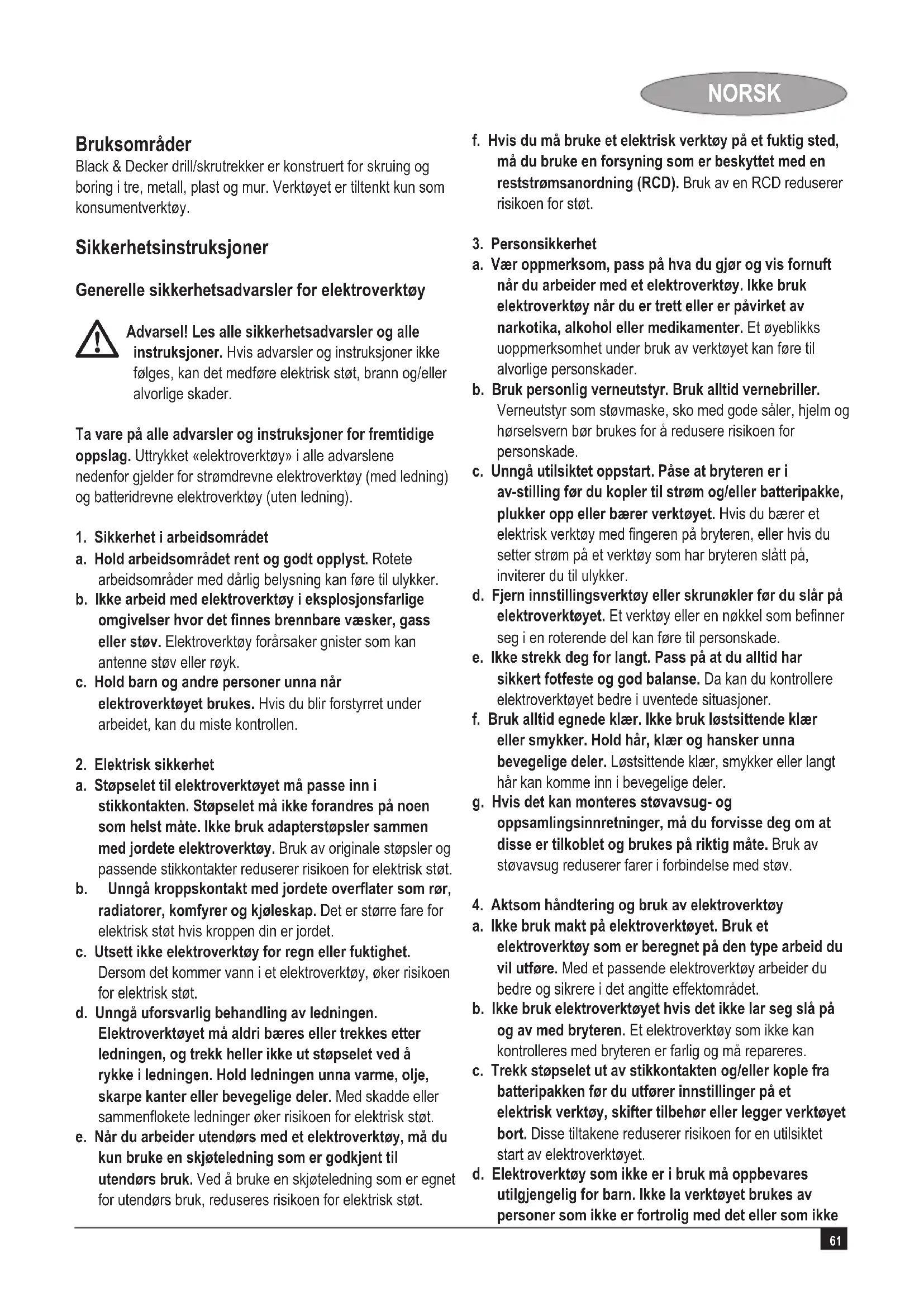 a. Ikke bruk makt på elektroverktøyet. Bruk et elektroverktøy som er beregnet på den type arbeid du vil utføre. Med et passende elektroverktøy arbeider du bedre og sikrere i det angitte effektområdet. b. Ikke bruk elektroverktøyet hvis det ikke lar seg slå på og av med bryteren. Et elektroverktøy som ikke kan kontrolleres med bryteren er farlig og må repareres. c. Trekk støpselet ut av stikkontakten og/eller kople fra batteripakken før du utfører innstillinger på et elektrisk verktøy, skifter tilbehør eller legger verktøyet bort. Disse tiltakene reduserer risikoen for en utilsiktet start av elektroverktøyet. d. Elektroverktøy som ikke er i bruk må oppbevares utilgjengelig for barn. Ikke la verktøyet brukes av personer som ikke er fortrolig med det eller som ikke62 NORSK har lest disse bruksanvisningene. Elektroverktøy er farlige når de brukes av uerfarne personer. e. Vær nøye med vedlikehold av elektroverktøy. Kontroller om bevegelige deler fungerer feilfritt og ikke klemmes fast, om deler er brukket eller skadet og andre forhold som kan innvirke på elektroverktøyets funksjon. Hvis elektroverktøyet er skadet, må det repareres før bruk. Dårlig vedlikeholdte elektroverktøy er årsaken til mange uhell. f. Hold skjæreverktøy skarpe og rene. Godt vedlikeholdte skjæreverktøy med skarpe egger setter seg ikke så ofte fast og er lettere å føre. g. Bruk elektroverktøy, tilbehør, bor osv. i henhold til disse instruksjonene. Ta hensyn til arbeidsforholdene og arbeidet som skal utføres. Bruk av elektroverktøy til andre formål enn det som er angitt, kan føre til farlige situasjoner.
