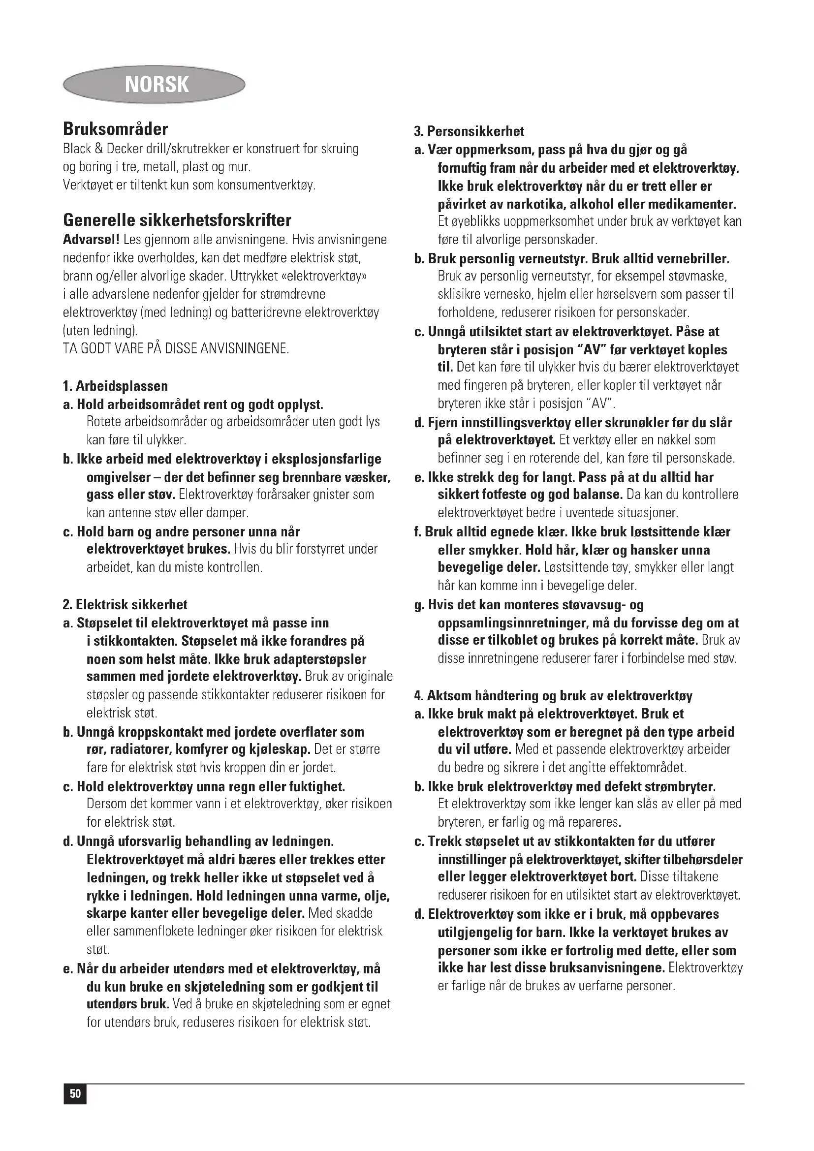 a. Elektroverktøyet ditt skal alltid repareres av kvalifisert personell og kun med originale reservedeler. Dette forsikrer at elektroverktøyets sikkerhet opprettholdes. Ekstra sikkerhetsforskrifter for batterier og ladere Batterier ◆ Må aldri åpnes. ◆ Batteriet må ikke komme i kontakt med vann. ◆ Må ikke oppbevares på steder hvor temperaturen kan overstige 40 °C. ◆ Må bare lades ved lufttemperaturer mellom 4 °C og 40 °C. ◆ Må bare lades med laderen som følger med verktøyet. ◆ Når du kasserer batteriet, følger du instruksene som er gitt i avsnittet “Miljø”. ◆ Under ekstreme forhold kan batterilekkasje forekomme. Hvis du merker væske på batteriet, må du gjøre som følger: - Tørk forsiktig væsken av med en klut. Unngå kontakt med huden. - I tilfeller hvor det oppstår kontakt med hud eller øyne, skal instruksjonene nedenfor følges. Advarsel! Batterivæsken, en 25-30 % løsning av kaliumhydroksid, kan være skadelig. Hvis den kommer i berøring med hud, må du straks skylle med vann. Nøytraliser med en svak syre, f.eks. sitronsaft eller eddik. Hvis du får væsken i øynene, må du rense dem med rikelige mengder rent vann i minst 10 minutter. Kontakt lege. ◆ Batteriet må ikke brennes. ◆ Bruk aldri et skadet batteri. Ladere ◆ Bruk din Black & Decker lader kun sammen med det batteriet som blir levert med verktøyet. Andre typer batterier kan eksplodere og forårsake person- og materialskader. ◆ Forsøk aldri å lade ikke-oppladbare batterier. ◆ Bytt straks ut defekte ledninger. ◆ Laderen må ikke komme i kontakt med vann. ◆ Laderen må ikke åpnes. ◆ Ikke skad eller feilbehandle laderen. Laderen er kun beregnet på innendørs bruk. Elektrisk sikkerhet Laderen er dobbeltisolert. Derfor er ikke jording nødvendig. Kontroller at nettspenningen er i overensstemmelse med spenningen på typeskiltet. Du må aldri forsøke å bytte laderen ut med et vanlig støpsel. Ekstra sikkerhetsinstrukser for drill/skrutrekker ◆ Før boring i vegger, gulv eller tak, undersøk hvor elektriske ledninger og rør befinner seg. ◆ Unngå å berøre borspissen rett etter at du har boret, da den kan være varm. Funksjoner Dette verktøyet har noen av eller alle disse funksjonene: