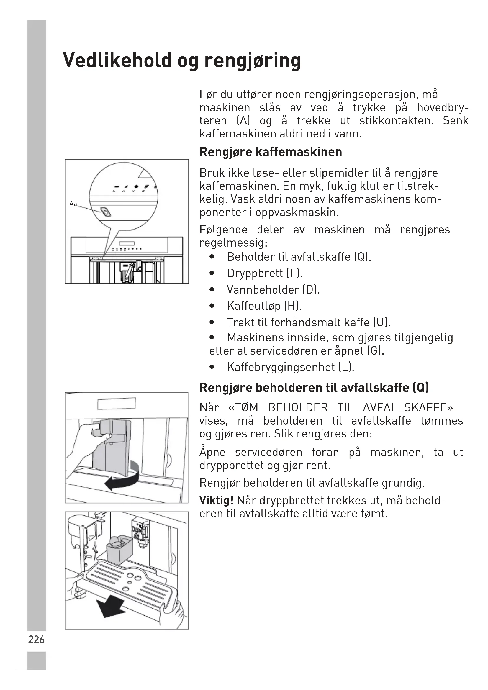 - Kaffebryggingsenhet(L). Rengjøre beholderen til avfallskaffe (Q) Når «TØM BEHOLDER TIL AVFALLSKAFFE» vises, må beholderen til avfallskaffe tømmes oggjøresren.Slikrengjøresden: Åpne servicedøren foran på maskinen, ta ut dryppbrettetoggjørrent. Rengjørbeholderentilavfallskaffegrundig. Viktig! Nårdryppbrettettrekkesut,måbehold- erentilavfallskaffealltidværetømt. Vedlikehold og rengjøring Aa227