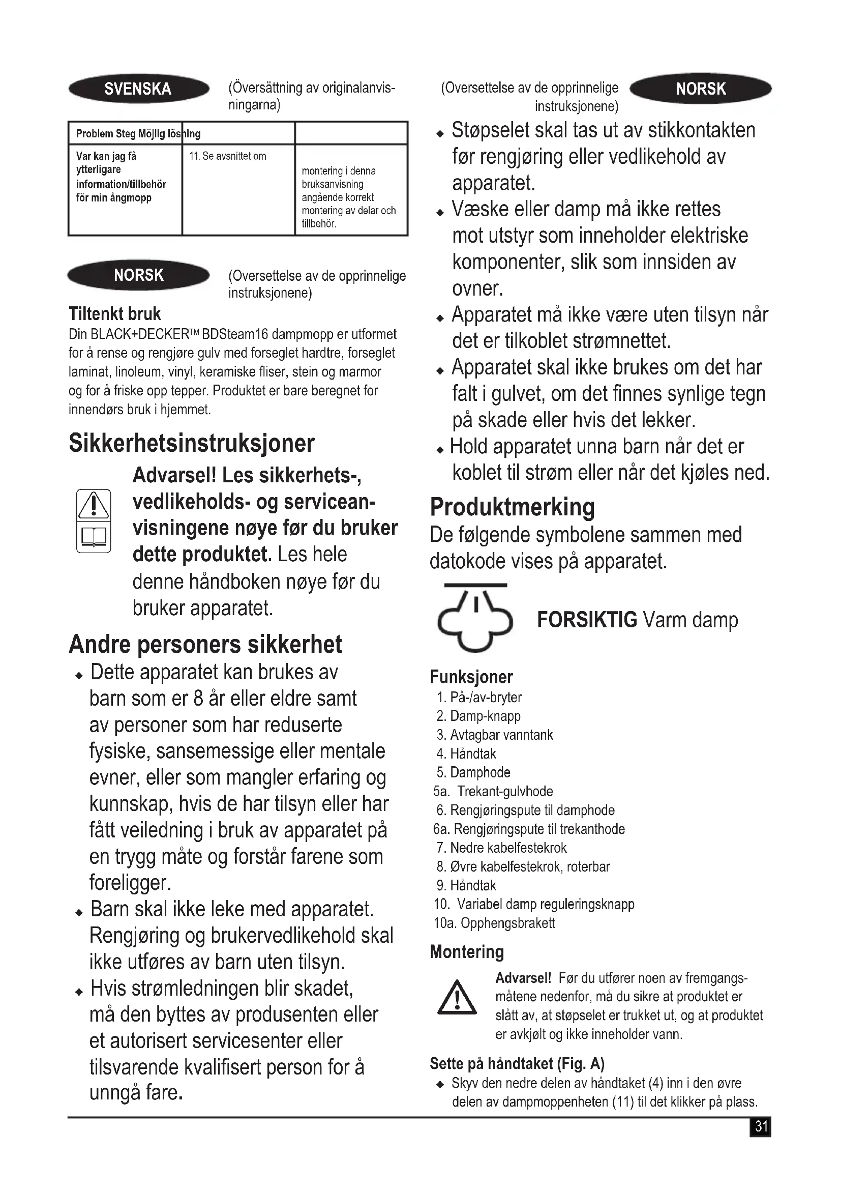 Advarsel! Før du utfører noen av fremgangs-måtene nedenfor, må du sikre at produktet er slått av, at støpselet er trukket ut, og at produktet er avkjølt og ikke inneholder vann. Sette på håndtaket (Fig. A) u Skyv den nedre delen av håndtaket (4) inn i den øvre delen av dampmoppenheten (11) til det klikker på plass.32 (Oversettelse av de opprinnelige instruksjonene) NORSK Pilen på håndtaket (4) skal justeres i forhold til den øvre delen av dampmoppenheten (11). Sette på vanntanken (Fig. B) u Skyv vanntanken (3) nedover inn i dampmoppenheten (11), og pass på at vannbeholderen er festet riktig. Sette på en rengjøringspute (gur C) Ekstra rengjøringsputer får du hos din BLACK+DECKER- forhandler (artikkelnummer FSMP20-XJ). Trekant rengjøringsputer:- (artikkelnummer FSMP30-XJ). u Plasser en rengjøringspute (6) på gulvet med festesiden av borrelåsen opp. u Trykk dampmoppen forsiktig ned på rengjøringsputen (6). Forsiktig: Plasser alltid dampmoppen på hvilematten med håndtaket (4) i stående stilling når den er i ro, og pass på at dampmoppen er slått av når den ikke er i bruk. Fjerne en rengjøringspute Forsiktig! Bruk alltid egnede sko når du bytter rengjøringspute på dampmoppen. Ikke bruk tøer eller fottøy med åpne tær. u Sett håndtaket (4) i stående stilling igjen, og slå dampmoppen "AV". u Vent til dampenheten er avkjølt før du setter den til oppbevaring (omtrent 5 minutter). u Løft dampmoppen vekk fra rengjøringsputen ved å løsne borrelåsen. Forsiktig! Plasser alltid dampmoppen på hvilematten med håndtaket (4) i stående stilling når den er i ro, og pass på at dampmoppen er slått av når den ikke er i bruk. Trekanthode (Fig. D) Denne dampmoppen har et innebygd trekanthode som gjør det mulig å komme til i hjørner og trange områder. Forsiktig! Bruk alltid egnede sko når du er i kontakt med trekanthodet på dampmoppen. Ikke bruk tøer eller fottøy med åpne tær. u Sett håndtaket (4) i stående stilling igjen, og slå dampmoppen av. u Vent til den er avkjølt (omtrent fem minutter). u Plasser skotuppen på klaffen (5b) for fjerning av damphodet, og trykk forsiktig nedover. u Løft trekanthodet (5a) opp og bort fra damphodet (5). u Sett på plass rengjøringsputen (6a) for trekanthodet under trekanthodet. Fylle vanntanken (gur E) Vanntanken på dampmoppen kan tas av for praktisk og enkel fylling. Merk! Fyll vanntanken med rent vann fra kranen. Merk! I områder med hardt vann anbefales bruk av avionisert vann. u Ta av vanntanken (3). u Ta av lokket ved å skru av mot klokken. u Fyll vanntanken (3) med vann. Advarsel! Vanntanken tar 350ml. Ikke fyll for mye på tanken. u Sett på lokket ved å skru på med klokken. u Sett vanntanken (3) på plass igjen. Merk! Pass på at påfyllingslokket er satt på riktig. Merk! Ikke bruk kjemiske rengjøringsmidler sammen med dampmoppen. Bruk Viktig! Denne enheten dreper 99,9 % av mikrober inkludert bakterier når den brukes i samsvar med denne håndboken, mikroberputen er satt på, og enheten brukes kontinuerlig i 90 sekunder. Slå på og av u Når du skal slå produktet på, trykker du på AV/PÅ- knappen (1). Det tar ca. 15 sekunder til dampmoppen er oppvarmet. u Trykk på dampknappen (2). Dette vil starte pumpen og enheten vil begynne å avgi damp. u For å stoppe dampen, slå av dampknappen (2). Strøm til dampkjelen er fortsatt på, for rask oppstart igjen. u Når du skal slå produktet av, trykker du på på/av-knappen (1). Forsiktig! La aldri dampmoppen være på ett sted noen tid. Plasser alltid dampmoppen på hvilematten med håndtaket (4) i stående stilling når den er i ro, og pass på at dampmoppen er slått av når den ikke er i bruk. Forsiktig! Tøm alltid dampmoppen etter bruk. Merk! Ved første fylling eller etter at den har gått tom, kan det ta opptil 45 sekunder før det lages damp. Bruk av variabel damp Enheten er utstyrt med et reguleringshjul (10) for variabel dampproduksjon, plassert på håndtaket (9). Det er mulig med 3 ulike innstillinger. Innstillingene for variabel damp er: Tre/laminat Fliser/vinyl Stein/marmor33 (Oversettelse av de opprinnelige instruksjonene) NORSK Råd for optimal bruk Generelt Forsiktig: Bruk aldri dampmoppen uten å sette på rengjøringsputen først. u Du må alltid støvsuge eller feie gulvet før du bruker dampmoppen. u Den enkleste måten å bruke produktet på er å la håndtaket helle 45º vinkel og rengjøre langsomt, et lite område av gangen. u Ikke bruk kjemiske rengjøringsmidler sammen med dampmoppen. Når du skal fjerne vanskelige ekker fra vinyl- eller linoleumsgulv, kan du forbehandle det med et mildt rengjøringsmiddel og litt vann før du bruker dampmoppen. Damprengjøring u Plasser en rengjøringspute (6) på gulvet med festesiden av borrelåsen opp. u Trykk dampmoppen forsiktig ned på rengjøringsputen (6). u Sett støpselet til dampmoppen i stikkontakten. u Trykk på på/av-knappen (1). Det tar ca. 15 sekunder til dampmoppen er oppvarmet. u Trykk på damp-knappen (2). Etter noen få sekunder begynner det å komme damp ut av damphodet. Merk! Ved første fylling eller etter at den har gått tom, kan det ta opptil 45 sekunder før det lages damp. u Det tar noen få sekunder før dampen kommer inn i rengjøringsputen. Dampmoppen glir nå lett over overaten som skal renses/rengjøres. u Skyv og trekk dampmoppen langsomt over gulvet for å rengjøre alle deler grundig med dampen. u Når du er ferdig med å bruke dampmoppen, sett håndtaket (4) rett opp, pass på at den står stødig og slå den AV. Vent til dampmoppen er avkjølt (omtrent fem minutter). Forsiktig! Det er viktig å holde øye med vannivået i vanntanken (3). Når du skal fylle på vanntanken og fortsette å rense/rengjøre, setter du håndtaket i stående stilling og slår dampmoppen AV. Trekk støpselet ut av stikkontakten, ta av vanntanken (3) og fyll den igjen. Forsiktig! La aldri dampmoppen være på ett sted noen tid. Plasser alltid dampmoppen på hvilematten med 