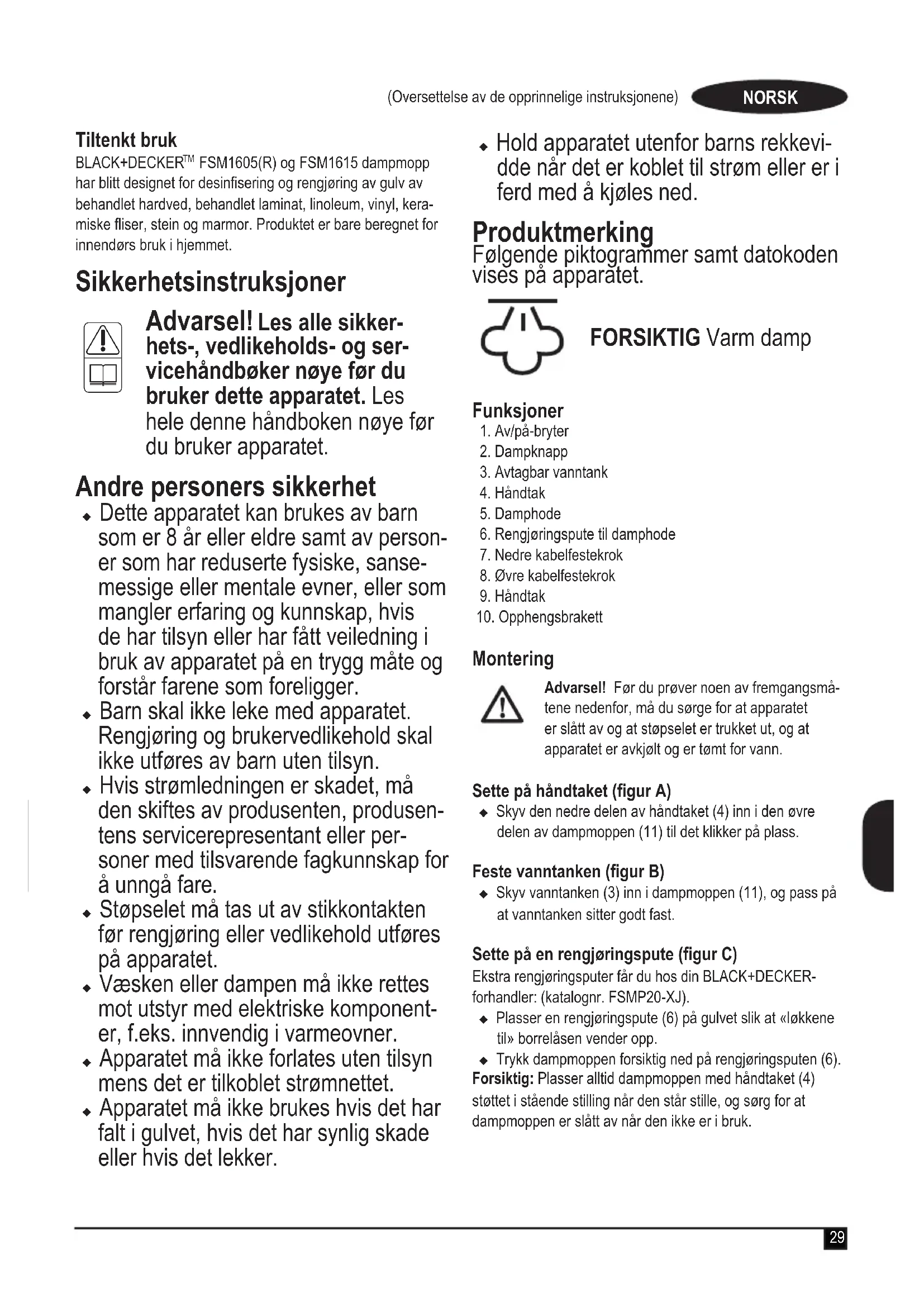 Advarsel! Les alle sikker- hets-, vedlikeholds- og ser- vicehåndbøker nøye før du bruker dette apparatet. Les hele denne håndboken nøye før du bruker apparatet. Andre personers sikkerhet u Dette apparatet kan brukes av barn som er 8 år eller eldre samt av person- er som har reduserte fysiske, sanse- messige eller mentale evner, eller som mangler erfaring og kunnskap, hvis de har tilsyn eller har fått veiledning i bruk av apparatet på en trygg måte og forstår farene som foreligger. u Barn skal ikke leke med apparatet. Rengjøring og brukervedlikehold skal ikke utføres av barn uten tilsyn. u Hvis strømledningen er skadet, må den skiftes av produsenten, produsen- tens servicerepresentant eller per- soner med tilsvarende fagkunnskap for å unngå fare. u Støpselet må tas ut av stikkontakten før rengjøring eller vedlikehold utføres på apparatet. u Væsken eller dampen må ikke rettes mot utstyr med elektriske komponent- er, f.eks. innvendig i varmeovner. u Apparatet må ikke forlates uten tilsyn mens det er tilkoblet strømnettet. u Apparatet må ikke brukes hvis det har falt i gulvet, hvis det har synlig skade eller hvis det lekker. u Hold apparatet utenfor barns rekkevi- dde når det er koblet til strøm eller er i ferd med å kjøles ned. Produktmerking Følgende piktogrammer samt datokoden vises på apparatet. FORSIKTIG Varm damp Funksjoner 1. Av/på-bryter 2. Dampknapp 3. Avtagbar vanntank 4. Håndtak 5. Damphode 6. Rengjøringspute til damphode 7. Nedre kabelfestekrok 8. Øvre kabelfestekrok 9. Håndtak 10. Opphengsbrakett Montering Advarsel! Før du prøver noen av fremgangsmå-tene nedenfor, må du sørge for at apparatet er slått av og at støpselet er trukket ut, og at apparatet er avkjølt og er tømt for vann. Sette på håndtaket (gur A) u Skyv den nedre delen av håndtaket (4) inn i den øvre delen av dampmoppen (11) til det klikker på plass. Feste vanntanken (gur B) u Skyv vanntanken (3) inn i dampmoppen (11), og pass på at vanntanken sitter godt fast. Sette på en rengjøringspute (gur C) Ekstra rengjøringsputer får du hos din BLACK+DECKER-forhandler: (katalognr. FSMP20-XJ).u Plasser en rengjøringspute (6) på gulvet slik at «løkkene til» borrelåsen vender opp.u Trykk dampmoppen forsiktig ned på rengjøringsputen (6).Forsiktig: Plasser alltid dampmoppen med håndtaket (4) støttet i stående stilling når den står stille, og sørg for at dampmoppen er slått av når den ikke er i bruk.30 (Oversettelse av de opprinnelige instruksjonene) NORSK Ta av en rengjøringspute Forsiktig! Bruk alltid egnede sko når du bytter rengjørings- pute på dampmoppen. Ikke bruk tøer eller fottøy med åpne tær. u Sett håndtaket (4) tilbake i stående stilling, og slå dampmoppen «AV». u Vent til dampmoppen er avkjølt (ca. fem minutter). u Frigjør dampmoppen fra borrelåsfestet, og løft dampmop- pen vekk fra rengjøringsputen. Forsiktig! Plasser alltid dampmoppen med håndtaket (4) støttet i stående stilling når den står stille, og sørg for at dampmoppen er slått av når den ikke er i bruk. Fylle vanntanken (gur D) Vanntanken på dampmoppen kan tas av for praktisk og enkel påfylling. Merk: Fyll vanntanken med rent vann fra kranen. Merk: I områder med hardt vann anbefales bruk av avionisert vann. u Ta av vanntanken (3). u Ta av lterlokket ved å skru mot urviseren. u Fyll vanntanken (3) med vann. Advarsel! Vanntankens kapasitet er 350 ml. Ikke fyll for mye på tanken. u Bytt ut lterlokket ved å skru mot urviseren. u Sett vanntanken (3) på plass igjen. Merk: Pass på at lterlokket sitter godt fast. Merk: Ikke bruk kjemiske rengjøringsmidler sammen med dampmoppens vanntank. Bruk Viktig! Denne enheten dreper 99,9 % av bakterier og mik- rober når den brukes i samsvar med instruksjonene i denne håndboken og mikroberputen er satt på, og enheten brukes kontinuerlig i 90 sekunder. Slå av og på u Trykk på PÅ/AV-knappen (1) for å slå på apparatet. Det tar ca. 15 sekunder til dampmoppen er oppvarmet. u Trykk på dampknappen (2). Da starter pumpen og enheten vil begynne å produsere damp. u Drei dampnappen (2) til av for å stoppe produksjonen av damp. Dette vil beholde strømmen til kokeren for raskere oppstart. u Trykk på PÅ/AV-knappen (1) for å slå av apparatet. Forsiktig! La aldri dampmoppen være på ett sted noen tid. Plasser alltid dampmoppen med håndtaket (4) støttet i stående stilling når den står stille, og sørg for at dampmoppen er slått av når den ikke er i bruk. Forsiktig! Tøm alltid dampmoppen etter bruk. Merk: Ved første fylling eller etter at den har gått tom, kan det ta opptil 45 sekunder før det lages damp. Råd for optimal bruk Generelt Forsiktig: Bruk aldri dampmoppen uten å sette på rengjøring- sputen først. u Du må alltid støvsuge eller feie gulvet før du bruker dampmoppen. u Den enkleste måten å bruke produktet på er å la hånd- taket helle 45° og gjøre rent langsomt, et lite område om gangen. u Ikke bruk kjemiske rengjøringsmidler sammen med dampmoppen. Når du skal fjerne vanskelige ekker fra vinyl- eller linoleumsgulv, kan du forbehandle det med et mildt rengjøringsmiddel og litt vann før du bruker dampmoppen. Damprengjøring u Plasser en rengjøringspute (6) på gulvet slik at «løkkene» til borrelåsen vender opp. u Trykk dampmoppen forsiktig ned på rengjøringsputen (6). u Sett støpselet til dampmoppen inn i stikkontakten. u Trykk på på/av-knappen (1). Det tar ca. 15 sekunder til dampmoppen er oppvarmet. u Trykk på dampknappen (2). Etter noen få sekunder begyn- ner det å komme damp ut av damphodet. Merk: Ved første fylling eller etter at den har gått tom, kan det ta opptil 45 sekunder før det lages damp. u Det tar noen få sekunder før dampen kommer inn i rengjøringsputen. Dampmoppen glir nå lett over overaten som skal renses/rengjøres. u Skyv og trekk dampmoppen langsomt over overaten for grundig damprengjøring av hver del. u Når du er ferdig med å bruke dampmoppen, s
