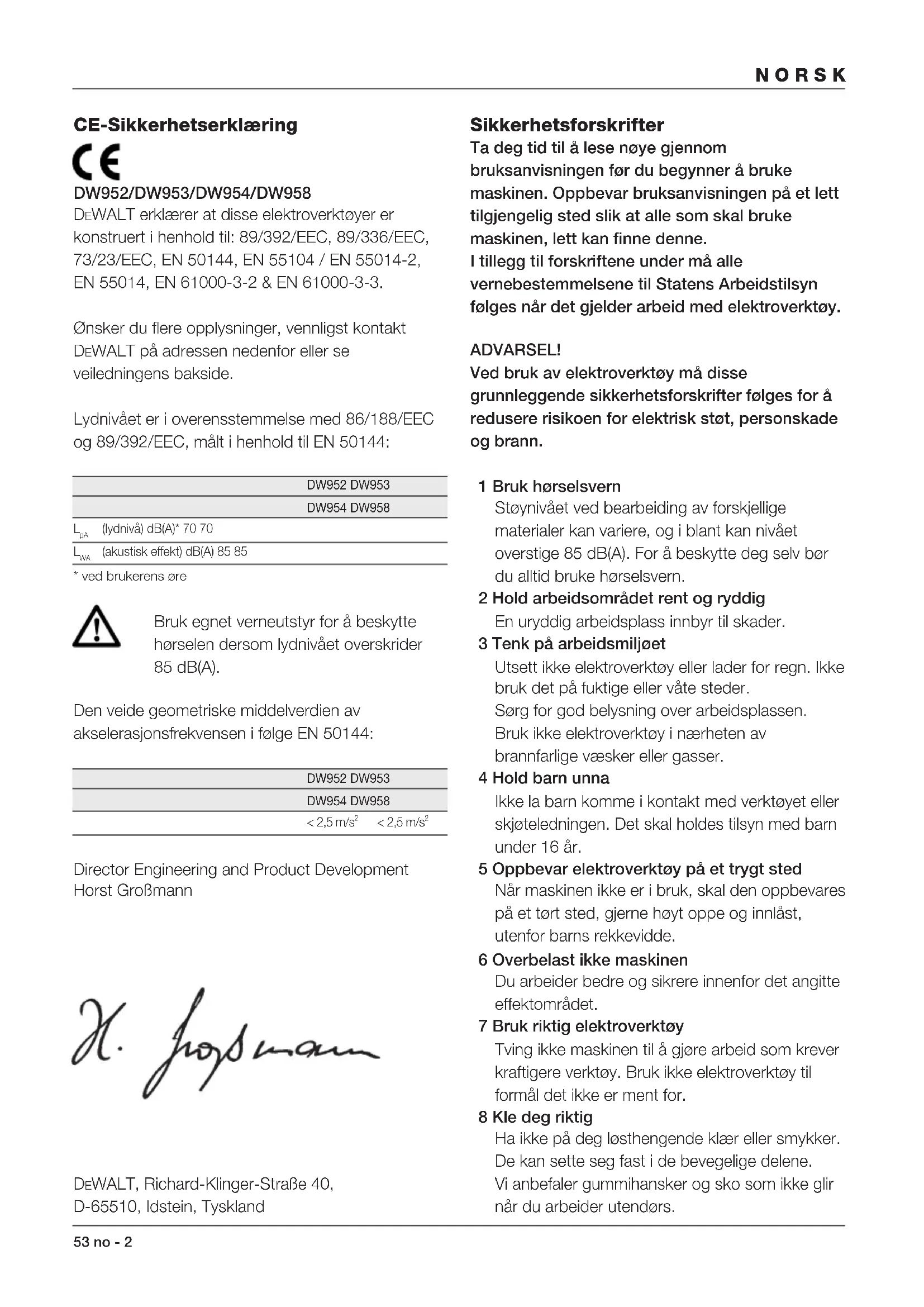 - ved brukerens øre Bruk egnet verneutstyr for å beskytte hørselen dersom lydnivået overskrider 85 dB(A). Den veide geometriske middelverdien av akselerasjonsfrekvensen i følge EN 50144: DW952 DW953 DW954 DW958 < 2,5 m/s