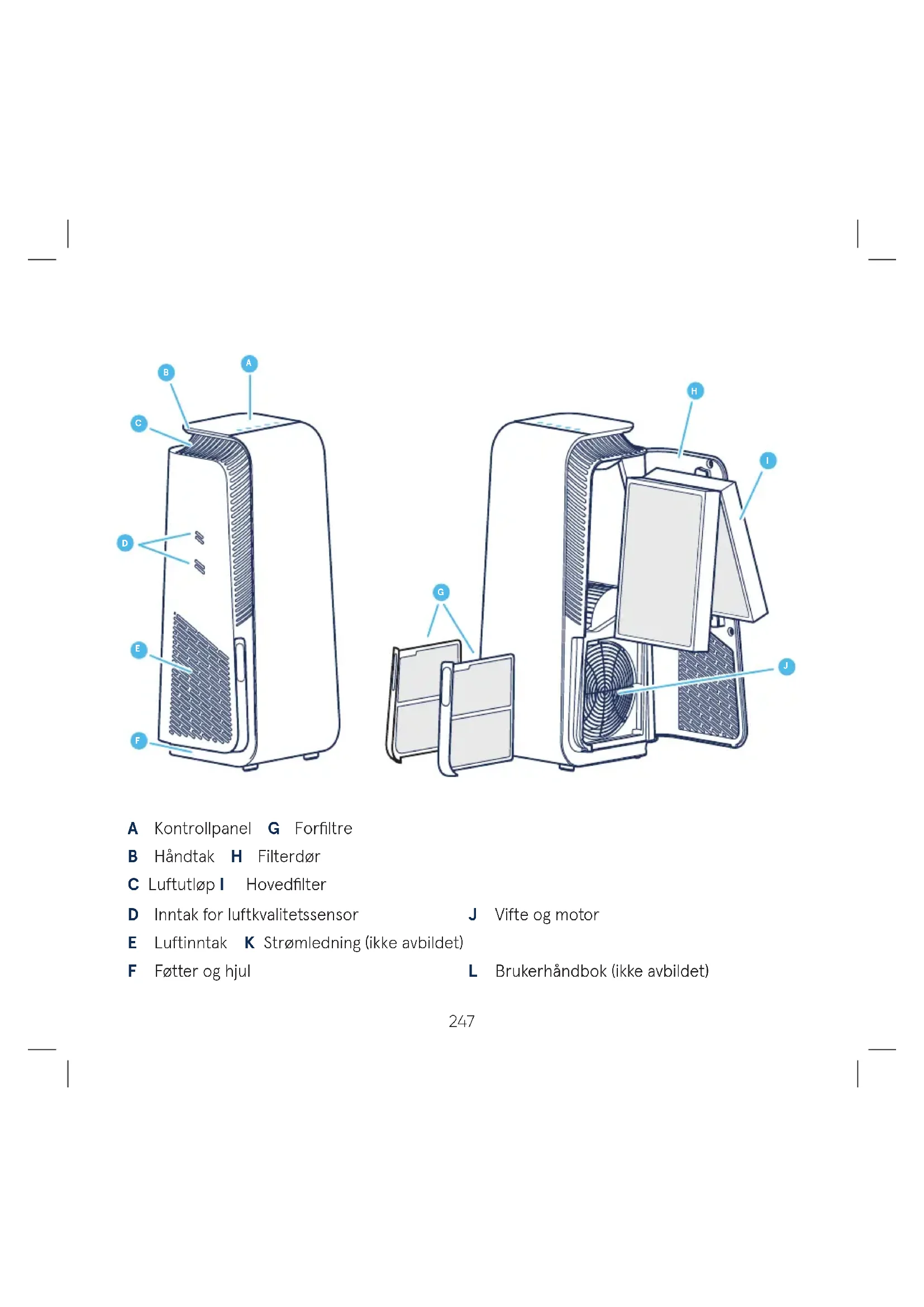A Kontrollpanel G Forfiltre B Håndtak H Filterdør C Luftutløp I Hovedfilter D Inntak for luftkvalitetssensor J Vifte og motor E Luftinntak K Strømledning (ikke avbildet) F Føtter og hjul L Brukerhåndbok (ikke avbildet)248 SikkerhetsinstruksjonerSikkerhetsinstruksjoner Blueair HealthProtect™-luftrenserne er elektriske apparater kun til innendørs bruk. Ta nødvendige forholdsregler for å redusere risikoen for brann, elektrisk støt og personskade.