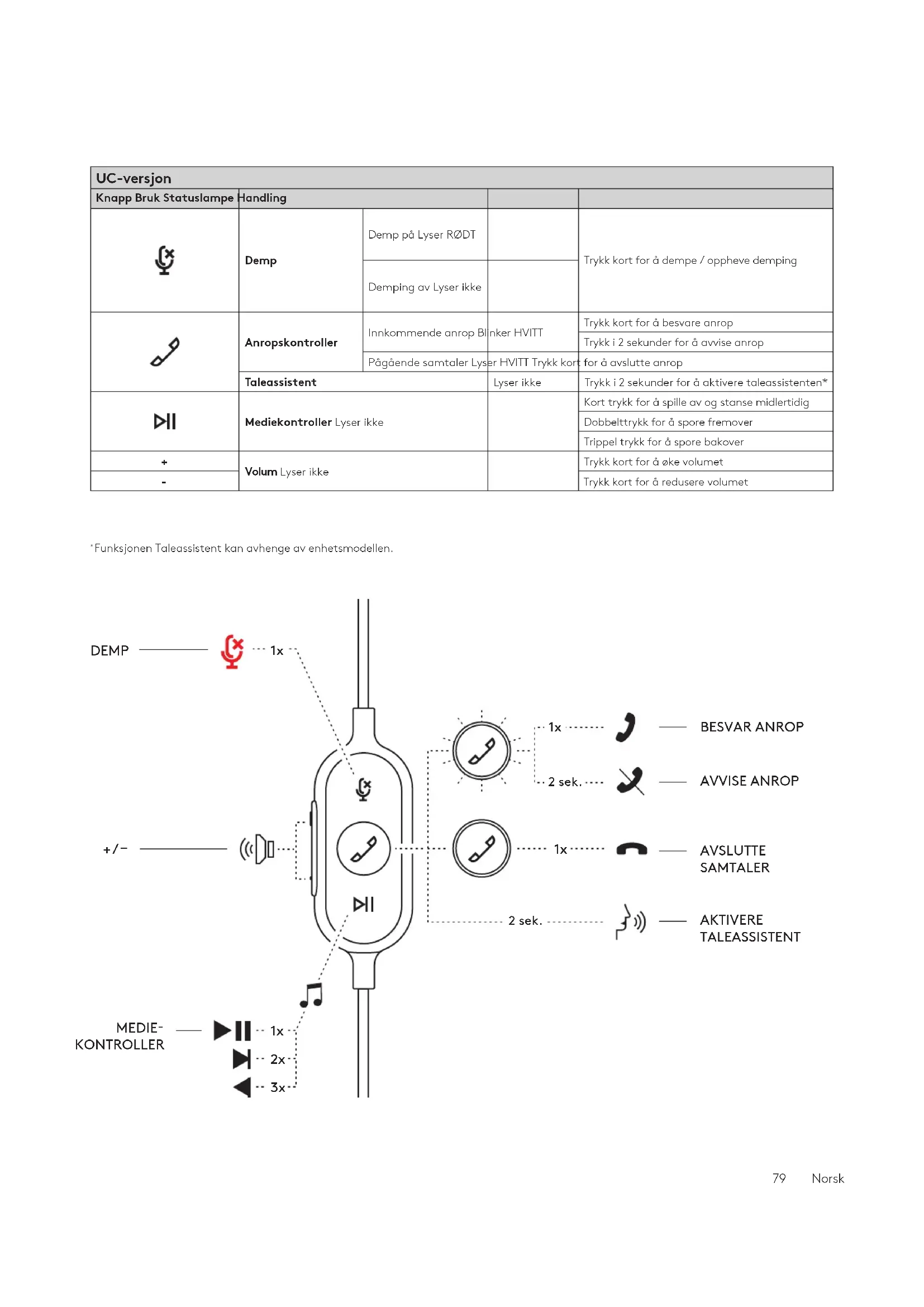 78 Norsk* Funksjonen Taleassistent kan avhenge av enhetsmodellen. UC-versjon Knapp Bruk Statuslampe Handling Demp Demp på Lyser RØDT Trykk kort for å dempe / opphevedemping Demping av Lyser ikke Anropskontroller Innkommende anrop Blinker HVITT Trykk kort for å besvare anrop Trykk i 2 sekunder for å avvise anrop Pågående samtaler Lyser HVITT Trykk kort for å avslutte anrop Taleassistent Lyser ikke Trykk i 2 sekunder for å aktivere taleassistenten* Mediekontroller Lyser ikke Kort trykk for å spille av og stanse midlertidig Dobbelttrykk for å spore fremover Trippel trykk for å spore bakover