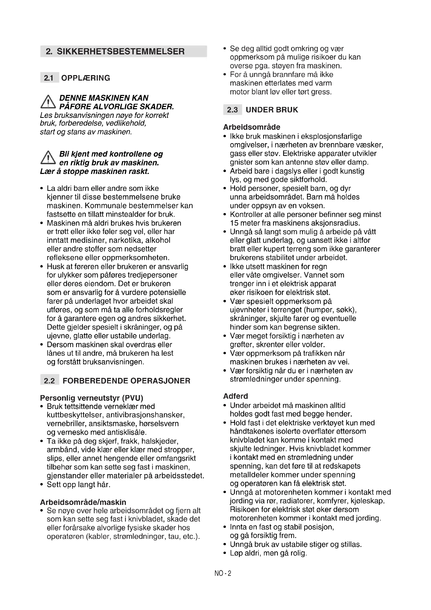 - Unngå så langt som mulig å arbeide på vått eller glatt underlag, og uansett ikke i altfor bratt eller kupert terreng som ikke garanterer brukerens stabilitet under arbeidet.