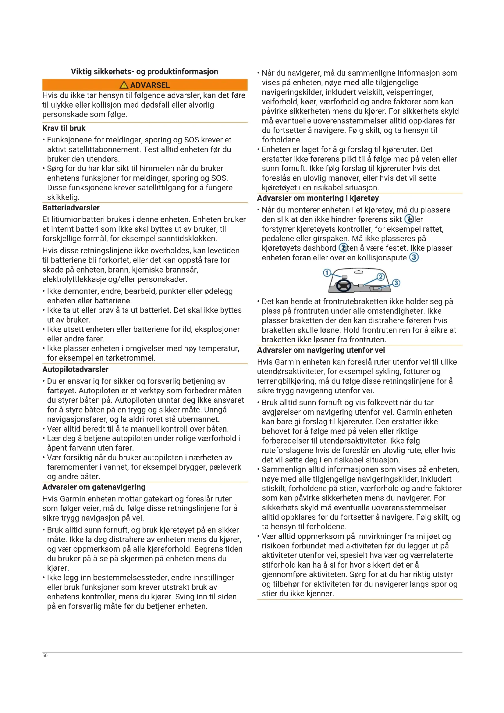 - Enheten er laget for å gi forslag til kjøreruter. Det erstatter ikke førerens plikt til å følge med på veien eller sunn fornuft. Ikke følg forslag til kjøreruter hvis det foreslås en ulovlig manøver, eller hvis det vil sette kjøretøyet i en risikabel situasjon. Advarsler om montering i kjøretøy