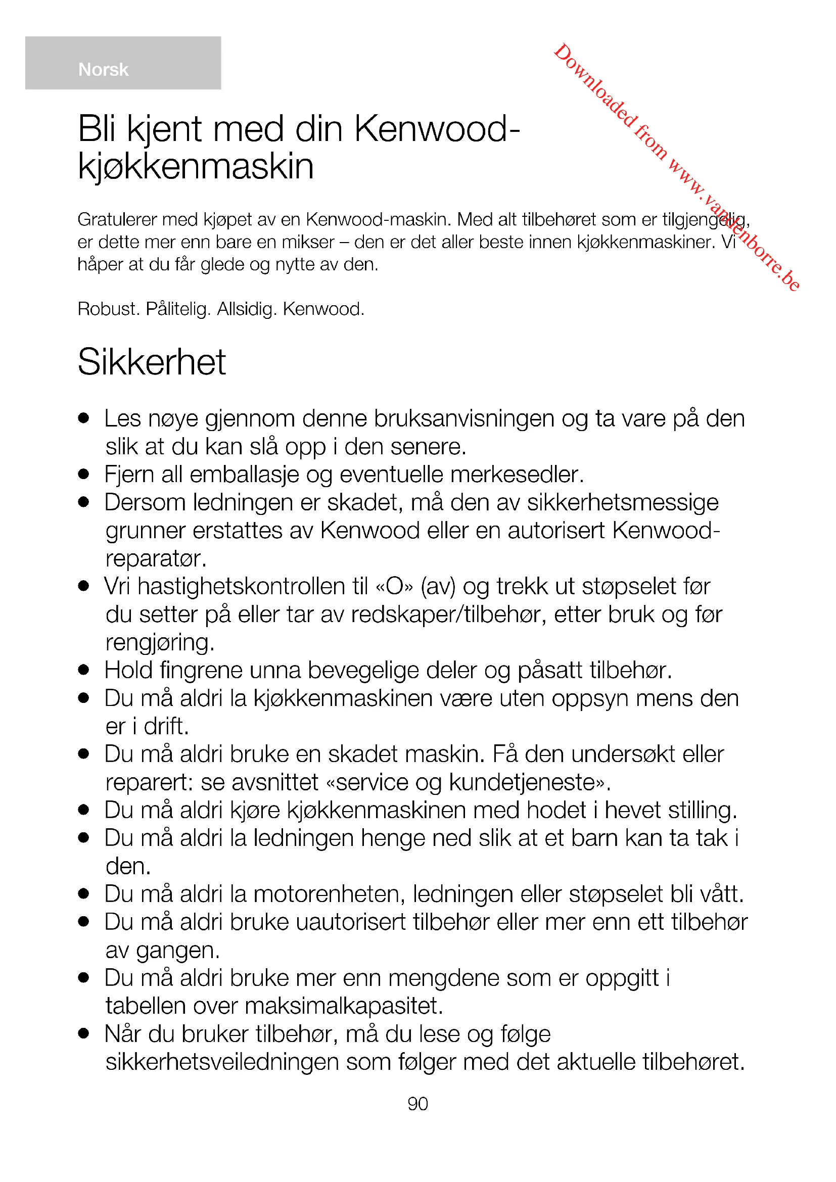 Bruk bare apparatet til dets tiltenkte hjemlige bruk. Kenwood frasier seg ethvert ansvar ved feilaktig bruk eller dersom apparatet ikke er brukt i henhold til denne bruksanvisningen.