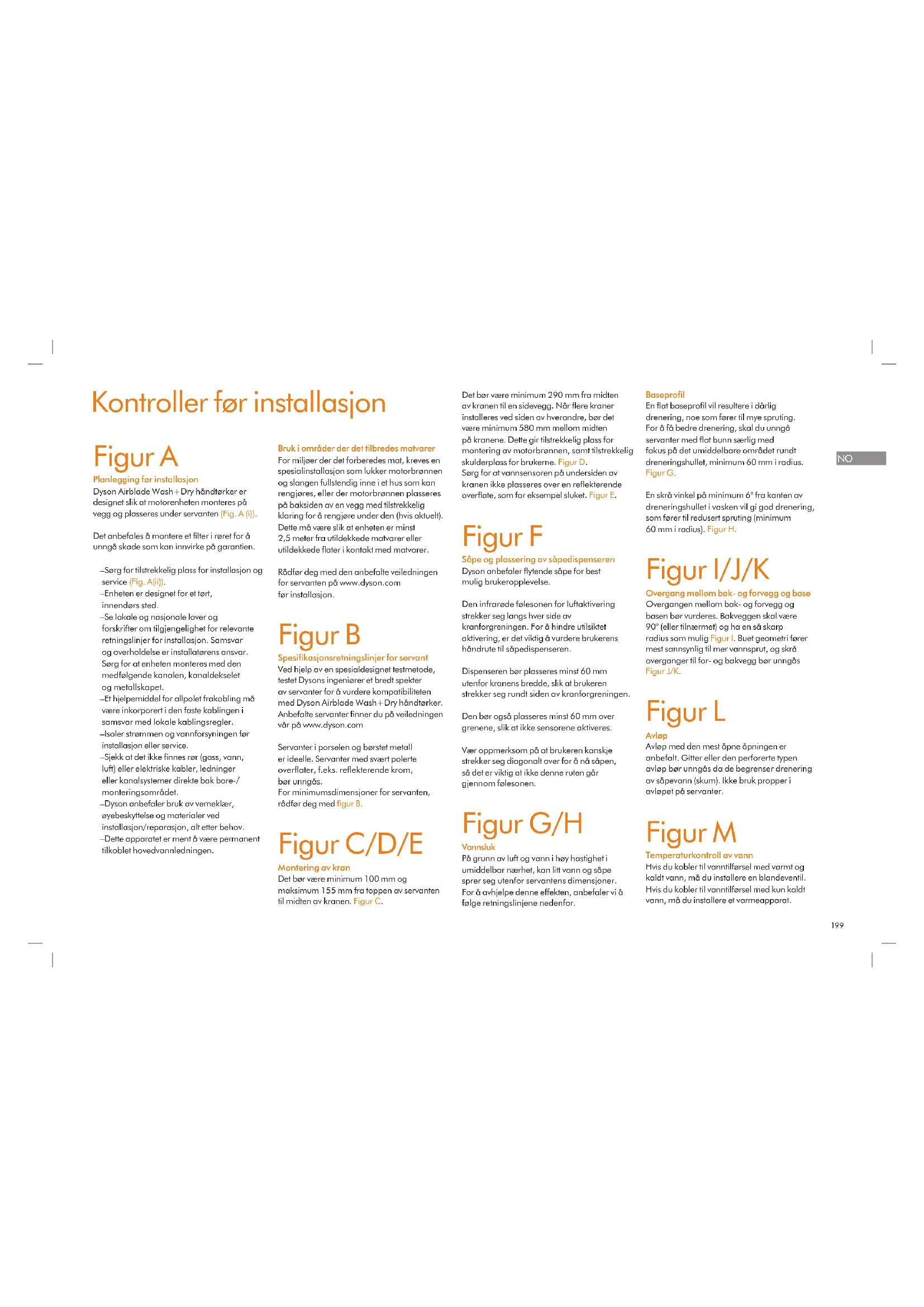 Kontroller før installasjon Figur A Planlegging før installasjon Dyson Airblade Wash+Dry håndtørker er designet slik at motorenheten monteres på vegg og plasseres under servanten (Fig. A (i)). Det anbefales å montere et filter i røret for å unngå skade som kan innvirke på garantien. – Sørg for tilstrekkelig plass for installasjon og service (Fig. A(ii)). – Enheten er designet for et tørt, innendørs sted. – Se lokale og nasjonale lover og forskrifter om tilgjengelighet for relevante retningslinjer for installasjon. Samsvar og overholdelse er installatørens ansvar. Sørg for at enheten monteres med den medfølgende kanalen, kanaldekselet og metallskapet. – Et hjelpemiddel for allpolet frakobling må være inkorporert i den faste kablingen i samsvar med lokale kablingsregler. – Isoler strømmen og vannforsyningen før installasjon eller service. – Sjekk at det ikke finnes rør (gass, vann, luft) eller elektriske kabler, ledninger eller kanalsystemer direkte bak bore-/ monteringsområdet. – Dyson anbefaler bruk av verneklær, øyebeskyttelse og materialer ved installasjon/reparasjon, alt etter behov. – Dette apparatet er ment å være permanent tilkoblet hovedvannledningen. Bruk i områder der det tilbredes matvarer For miljøer der det forberedes mat, kreves en spesialinstallasjon som lukker motorbrønnen og slangen fullstendig inne i et hus som kan rengjøres, eller der motorbrønnen plasseres på baksiden av en vegg med tilstrekkelig klaring for å rengjøre under den (hvis aktuelt). Dette må være slik at enheten er minst 2,5 meter fra utildekkede matvarer eller utildekkede flater i kontakt med matvarer. Rådfør deg med den anbefalte veiledningen for servanten på www.dyson.com før installasjon. Figur B Spesifikasjonsretningslinjer for servant Ved hjelp av en spesialdesignet testmetode, testet Dysons ingeniører et bredt spekter av servanter for å vurdere kompatibiliteten med Dyson Airblade Wash+Dry håndtørker. Anbefalte servanter finner du på veiledningen vår på www.dyson.com Servanter i porselen og børstet metall er ideelle. Servanter med svært polerte overflater, f.eks. reflekterende krom, bør unngås. For minimumsdimensjoner for servanten, rådfør deg med figur B. Figur C/D/E Montering av kran Det bør være minimum 100 mm og maksimum 155 mm fra toppen av servanten til midten av kranen. Figur C. Det bør være minimum 290 mm fra midten av kranen til en sidevegg. Når flere kraner installeres ved siden av hverandre, bør det være minimum 580 mm mellom midten på kranene. Dette gir tilstrekkelig plass for montering av motorbrønnen, samt tilstrekkelig skulderplass for brukerne. Figur D. Sørg for at vannsensoren på undersiden av kranen ikke plasseres over en reflekterende overflate, som for eksempel sluket. Figur E. Figur F Såpe og plassering av såpedispenseren Dyson anbefaler flytende såpe for best mulig brukeropplevelse. Den infrarøde følesonen for luftaktivering strekker seg langs hver side av kranforgreningen. For å hindre utilsiktet aktivering, er det viktig å vurdere brukerens håndrute til såpedispenseren. Dispenseren bør plasseres minst 60 mm utenfor kranens bredde, slik at brukeren strekker seg rundt siden av kranforgreningen. Den bør også plasseres minst 60 mm over grenene, slik at ikke sensorene aktiveres. Vær oppmerksom på at brukeren kanskje strekker seg diagonalt over for å nå såpen, så det er viktig at ikke denne ruten går gjennom følesonen. Figur G/H Vannsluk På grunn av luft og vann i høy hastighet i umiddelbar nærhet, kan litt vann og såpe sprer seg utenfor servantens dimensjoner. For å avhjelpe denne effekten, anbefaler vi å følge retningslinjene nedenfor. Baseprofil En flat baseprofil vil resultere i dårlig drenering, noe som fører til mye spruting. For å få bedre drenering, skal du unngå servanter med flat bunn særlig med fokus på det umiddelbare området rundt dreneringshullet, minimum 60 mm i radius. Figur G. En skrå vinkel på minimum 6° fra kanten av dreneringshullet i vasken vil gi god drenering, som fører til redusert spruting (minimum 60 mm i radius). Figur H. Figur I/J/K Overgang mellom bak- og forvegg og base Overgangen mellom bak- og forvegg og basen bør vurderes. Bakveggen skal være 90° (eller tilnærmet) og ha en så skarp radius som mulig Figur I. Buet geometri fører mest sannsynlig til mer vannsprut, og skrå overganger til for- og bakvegg bør unngås Figur J/K. Figur L Avløp Avløp med den mest åpne åpningen er anbefalt. Gitter eller den perforerte typen avløp bør unngås da de begrenser drenering av såpevann (skum). Ikke bruk propper i avløpet på servanter. Figur M Temperaturkontroll av vann Hvis du kobler til vanntilførsel med varmt og kaldt vann, må du installere en blandeventil. Hvis du kobler til vanntilførsel med kun kaldt vann, må du installere et varmeapparat.NO