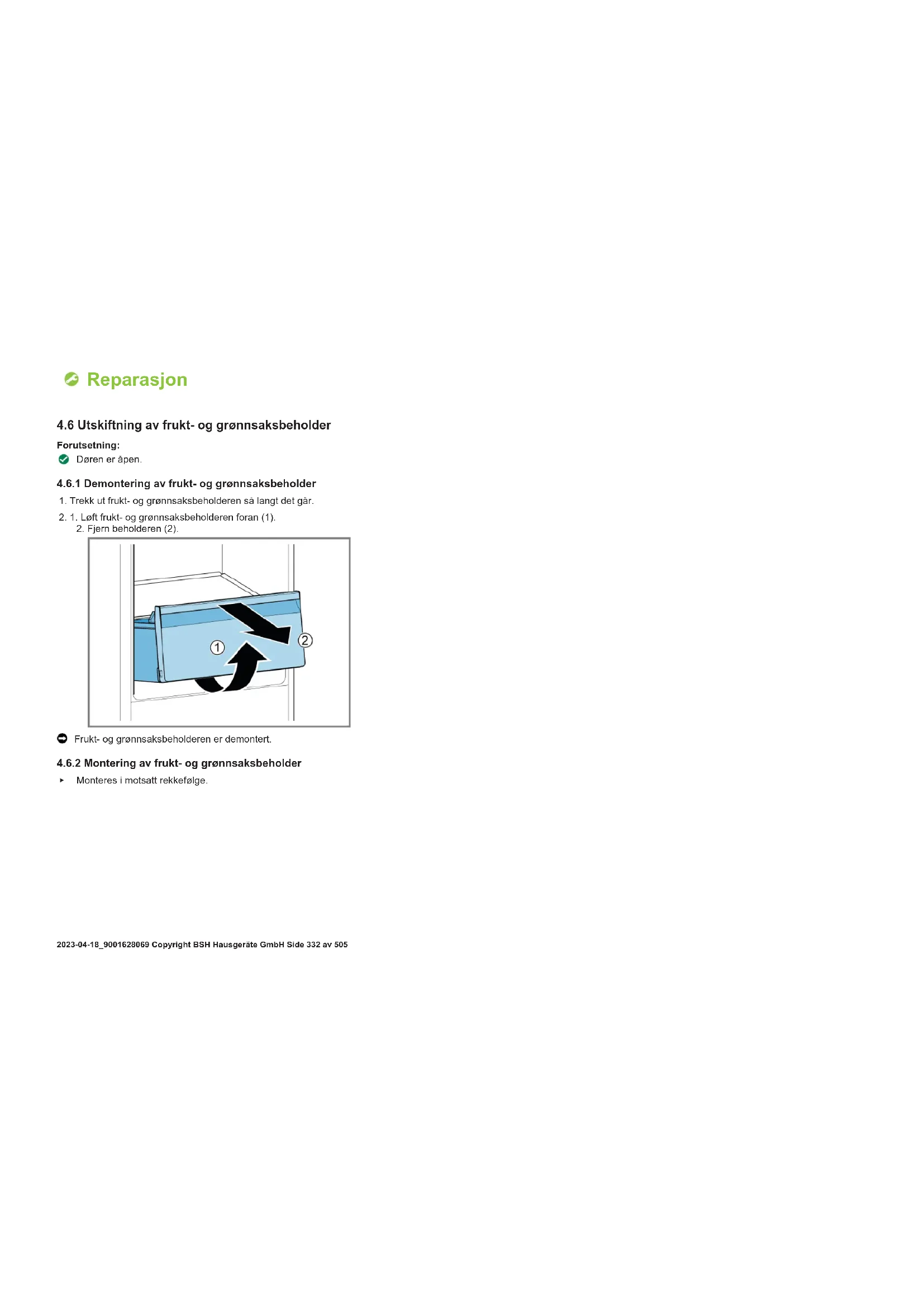 Monteres i motsatt rekkefølge. Reparasjon 2023-04-18_9001628069 Copyright BSH Hausgeräte GmbH Side332av5054.7 Utskiftning av beholder for frysevarer Forutsetning: Døren er åpen.