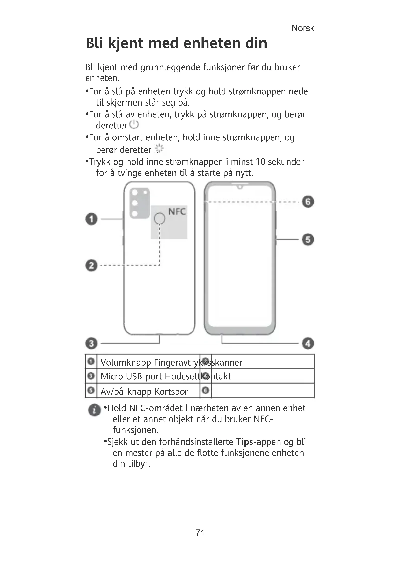 - Sjekk ut den forhåndsinstallerte Tips-appen og bli en mester på alle de otte funksjonene enheten din tilbyr. Norsk 71Komme i gang
