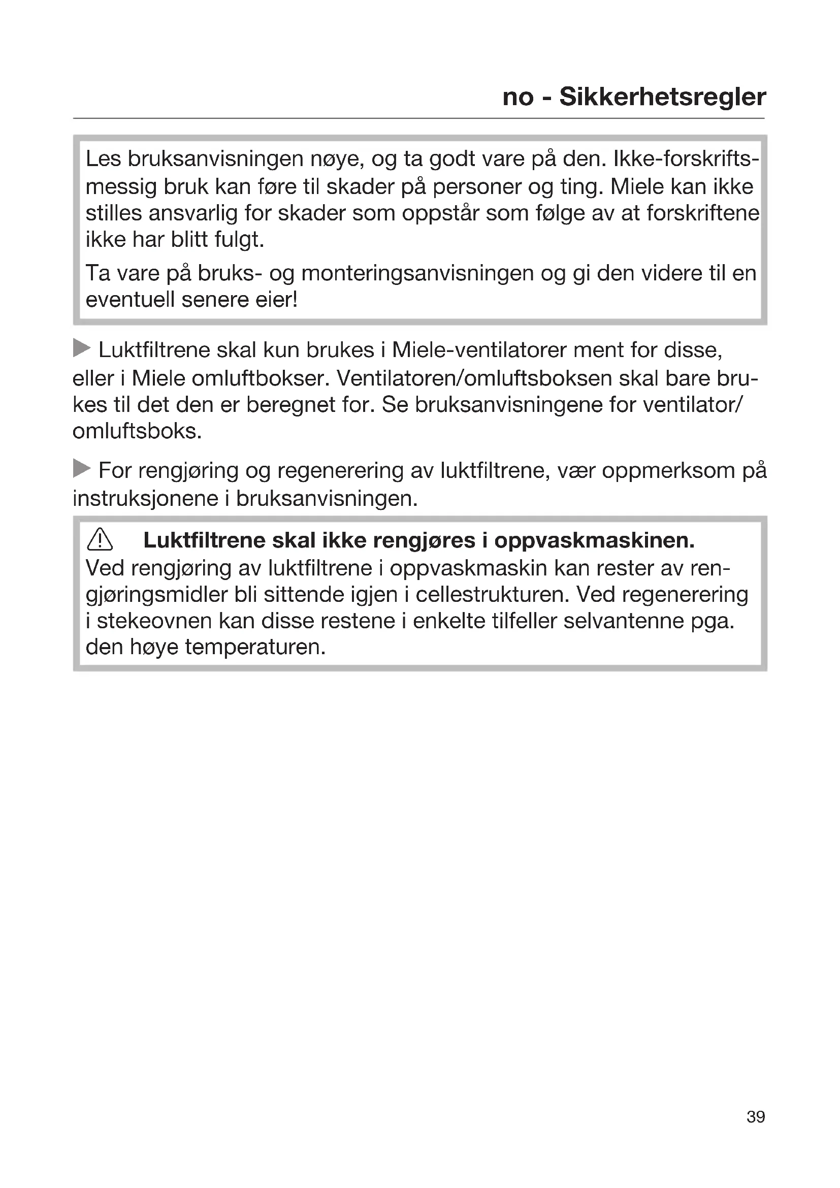 Les bruksanvisningen nøye, og ta godt vare på den. Ikke-forskrifts- messig bruk kan føre til skader på personer og ting. Miele kan ikke stilles ansvarlig for skader som oppstår som følge av at forskriftene ikke har blitt fulgt. Ta vare på bruks- og monteringsanvisningen og gi den videre til en eventuell senere eier! Luktfiltrene skal kun brukes i Miele-ventilatorer ment for disse, eller i Miele omluftbokser. Ventilatoren/omluftsboksen skal bare bru- kes til det den er beregnet for. Se bruksanvisningene for ventilator/ omluftsboks. For rengjøring og regenerering av luktfiltrene, vær oppmerksom på instruksjonene i bruksanvisningen. Luktfiltrene skal ikke rengjøres i oppvaskmaskinen. Ved rengjøring av luktfiltrene i oppvaskmaskin kan rester av ren- gjøringsmidler bli sittende igjen i cellestrukturen. Ved regenerering i stekeovnen kan disse restene i enkelte tilfeller selvantenne pga. den høye temperaturen.no - Bruksanvisning