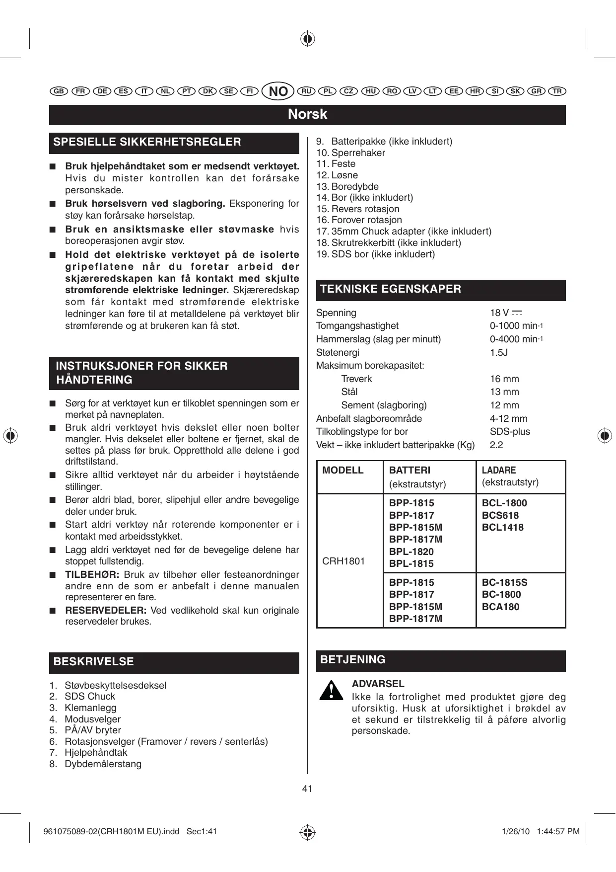 Last ned instruksjonene for din Elektriske verktøy i PDF-format gratis! Finn veiledningen din CRH1801 - RYOBI og ta den elektroniske enheten tilbake i hendene. På denne siden er alle dokumenter som er nødvendige for bruken av enheten din publisert. CRH1801 av merket RYOBI.
