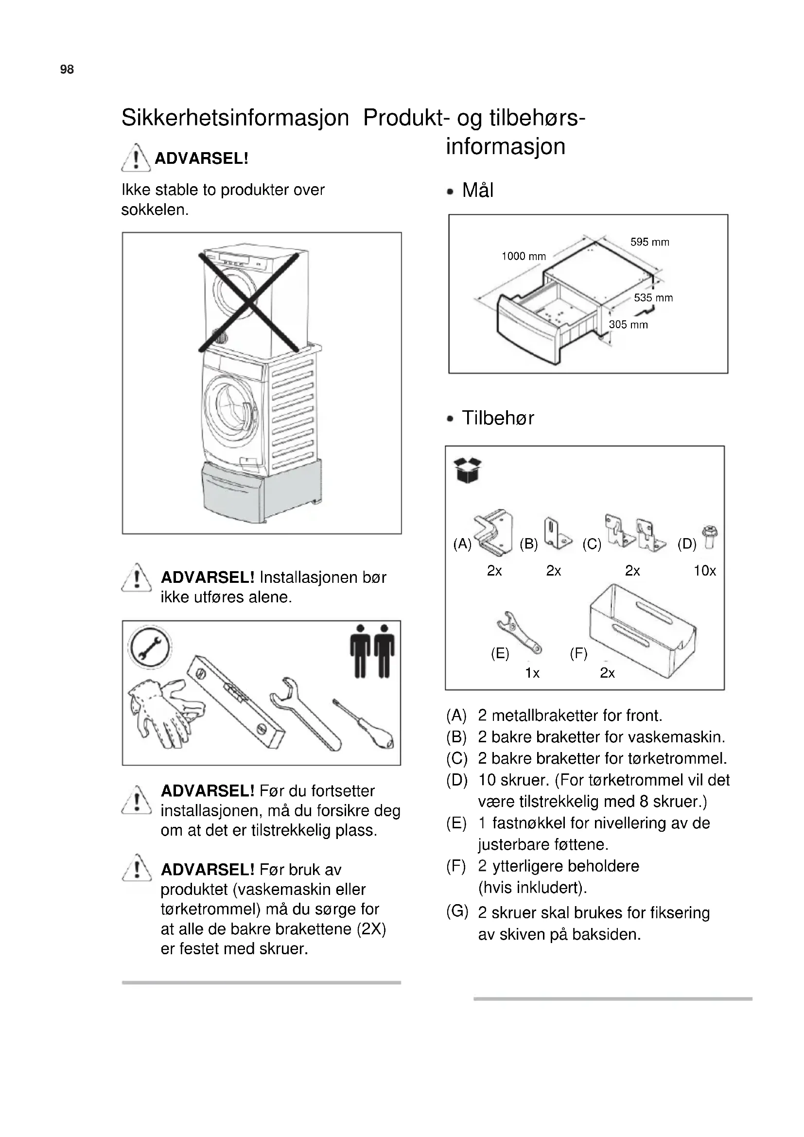 (A) (B) (C) (D) (E) (F) (G) 2 metallbraketter for front. 2 bakre braketter for vaskemaskin. 2 bakre braketter for tørketrommel. 10 skruer. (For tørketrommel vil det være tilstrekkelig med 8 skruer.) fastnøkkel for nivellering av de justerbare føttene. ytterligere beholdere (hvis inkludert). 2 skruer skal brukes for fiksering av skiven på baksiden.