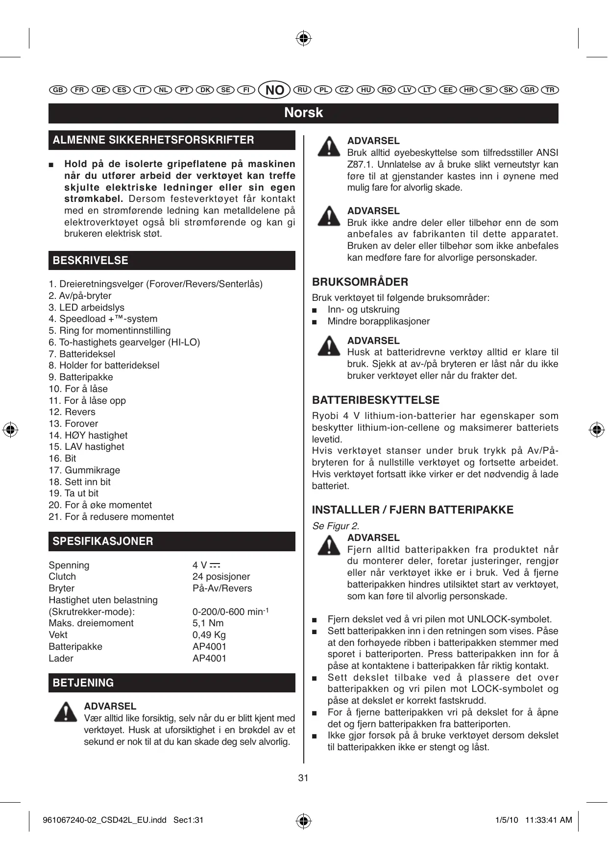 BRUKSANVISNING CSD 40 LI, CSD42L RYOBI