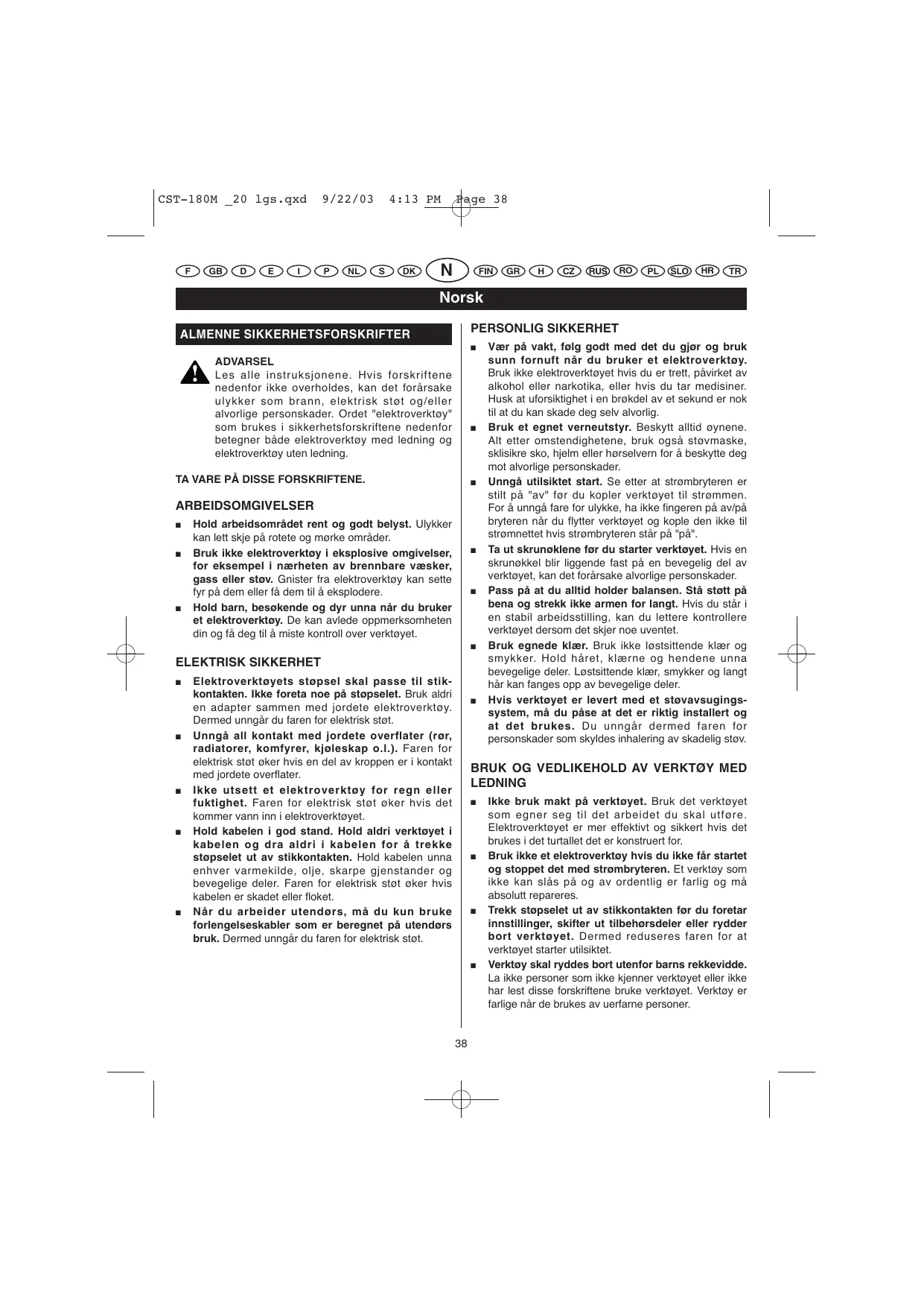 Ikke bruk makt på verktøyet. Bruk det verktøyet som egner seg til det arbeidet du skal utføre. Elektroverktøyet er mer effektivt og sikkert hvis det brukes i det turtallet det er konstruert for. Bruk ikke et elektroverktøy hvis du ikke får startet og stoppet det med strømbryteren. Et verktøy som ikke kan slås på og av ordentlig er farlig og må absolutt repareres. Trekk støpselet ut av stikkontakten før du foretar innstillinger, skifter ut tilbehørsdeler eller rydder bort verktøyet. Dermed reduseres faren for at verktøyet starter utilsiktet. Verktøy skal ryddes bort utenfor barns rekkevidde. La ikke personer som ikke kjenner verktøyet eller ikke har lest disse forskriftene bruke verktøyet. Verktøy er farlige når de brukes av uerfarne personer. CST-180M _20 lgs.qxd