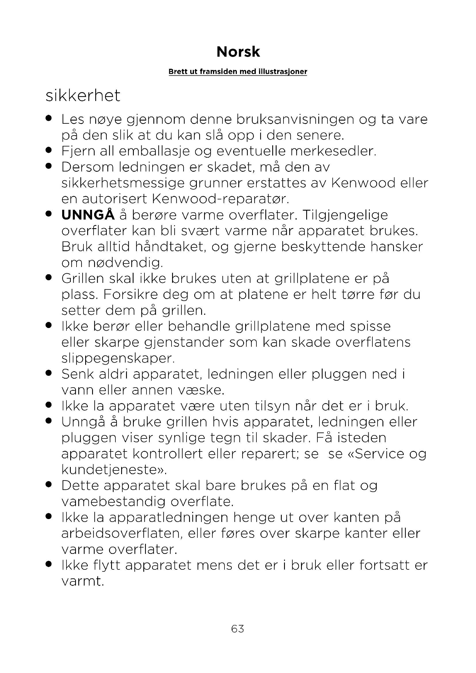 Bruk bare apparatet til dets tiltenkte hjemlige bruk. Kenwood frasier seg ethvert ansvar ved feilaktig bruk eller dersom apparatet ikke er brukt i henhold til denne bruksanvisningen.65 før du setter i støpselet