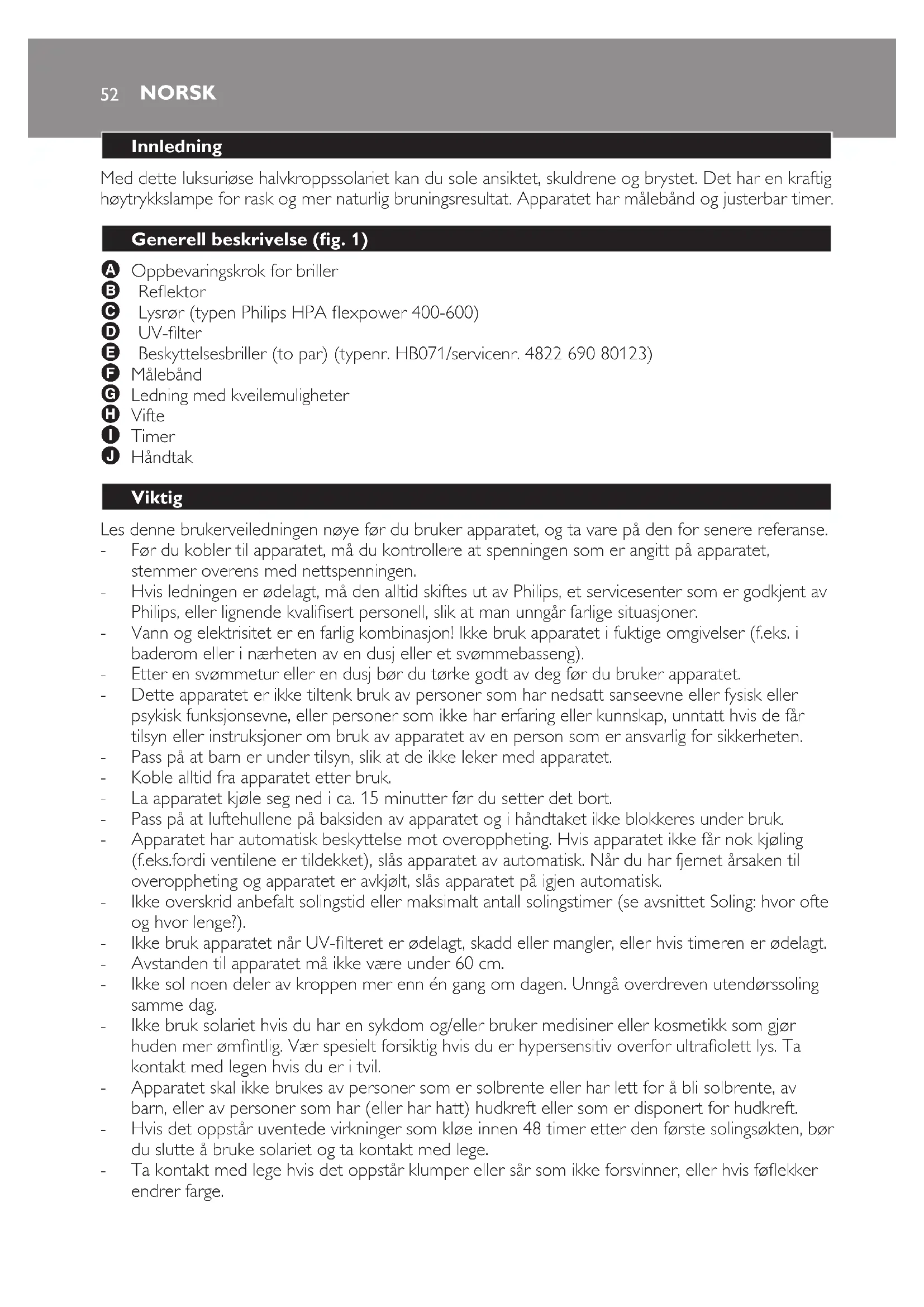NORSK53 Når du soler deg, skal du alltid bruke beskyttelsesbrillene som følger med apparatet, slik at du beskytterøynenemotovereksponering(seogsåavsnittetUV-stråleroghelse). Fjern eventuell krem, leppestift og annen kosmetikk i god tid før du bruker ansiktssolen. Ikke bruk solkrem eller selvbruningskrem. Hvis huden føles stram etter solingen, kan du bruke en fuktighetskrem. Farger kan falme når de utsettes for sollys. Bruk av dette apparatet kan ha samme virkning. Ikke forvent at apparatet gir bedre resultater enn naturlig sollys. Elektromagnetiske felt (EMF) DettePhilips-apparatetoverholderallestandardersomgjelderforelektromagnetiskefelt(EMF). Hvis det håndteres riktig og i samsvar med instruksjonene i denne brukerveiledningen, er det trygt å bruke det ut fra den kunnskapen vi har per dags dato. Soling og helse Solen Solenutstråleruliketyperenergi.Synliglysgjøratvikanse,ultraolettlys(UV)gjøratviblirbrune, oginfrarødtlys(IR)isolstrålenegirvarme. Halvkroppssolarium Meddettehalvkroppssolarietkandusoledeghjemme.Entimersikrerathverøktikkevarerlenger enn60minutter.Påsammemåtesommednaturligsollys,børduunngååsoledegforlenge(se avsnittetomUV-stråleroghelse). UV-stråler og helse På samme måte som med naturlig sollys tar det litt tid å bli brun. Virkningen begynner ikke å vise seg førettereresolingsøkter(seSoling:hvorofteoghvorlenge?). Overeksponeringforultraolettlys(naturligsollysellerkunstiglysfrasolariet)kanforårsake solbrenthet. I tillegg til mange andre faktorer, som overeksponering for naturlig sollys, kan overdreven og feil bruk av solarium øke risikoen for hud- og øyeproblemer. Graden av disse virkningene avhenger av formen, intensiteten og varigheten på eksponeringen, og følsomheten hos den aktuelle personen. JomerhudenogøyneneeksponeresforUV-lys,jostørreerrisikoenforhornhinnebetennelse, øyekatarr,skadepånetthinnen,gråstær,fortidligaldringavhudenogutviklingavhudkreft.Enkelte legemidler og kosmetikkprodukter gjør huden mer følsom. Derfor er det svært viktig at du følger instruksjonene i avsnittene Viktig og Soling: hvor ofte og hvor lenge? at du ikke overskrider maksimalt antall solingstimer per år (se avsnittet Soling: hvor ofte og hvor lenge?) at du alltid har på deg beskyttelsesbrillene når du bruker apparatet atavstandenundersolingen(avstandenmellomUV-lteretogkroppendin)erminst60cm Soling: hvor ofte og hvor lenge? Ikke bruk solariet mer enn én gang om dagen i en periode på fem til ti dager. Ladetgåminst48timermellomdenførsteogdenandresolingsøkten. Etterenperiodepå5–10dagermedsolinganbefalerviåtaenpauseisolingen. Ca. én måned etter en solingsperiode vil huden ha mistet mye av brunfargen. Du kan da begynne å ta sol igjen. Hvis du vil holde brunfargen ved like, kan du fortsette å ta sol én eller to ganger i uken i stedet for å ta en pause. Uansett om du velger å ta en pause i solingen eller fortsetter å sole deg med lengre intervaller, må du alltid huske på at du ikke må overskride maksimalt antall soltimer. Fordetteapparatetermaksimaltantall20soltimer(=1200minutter)perår.