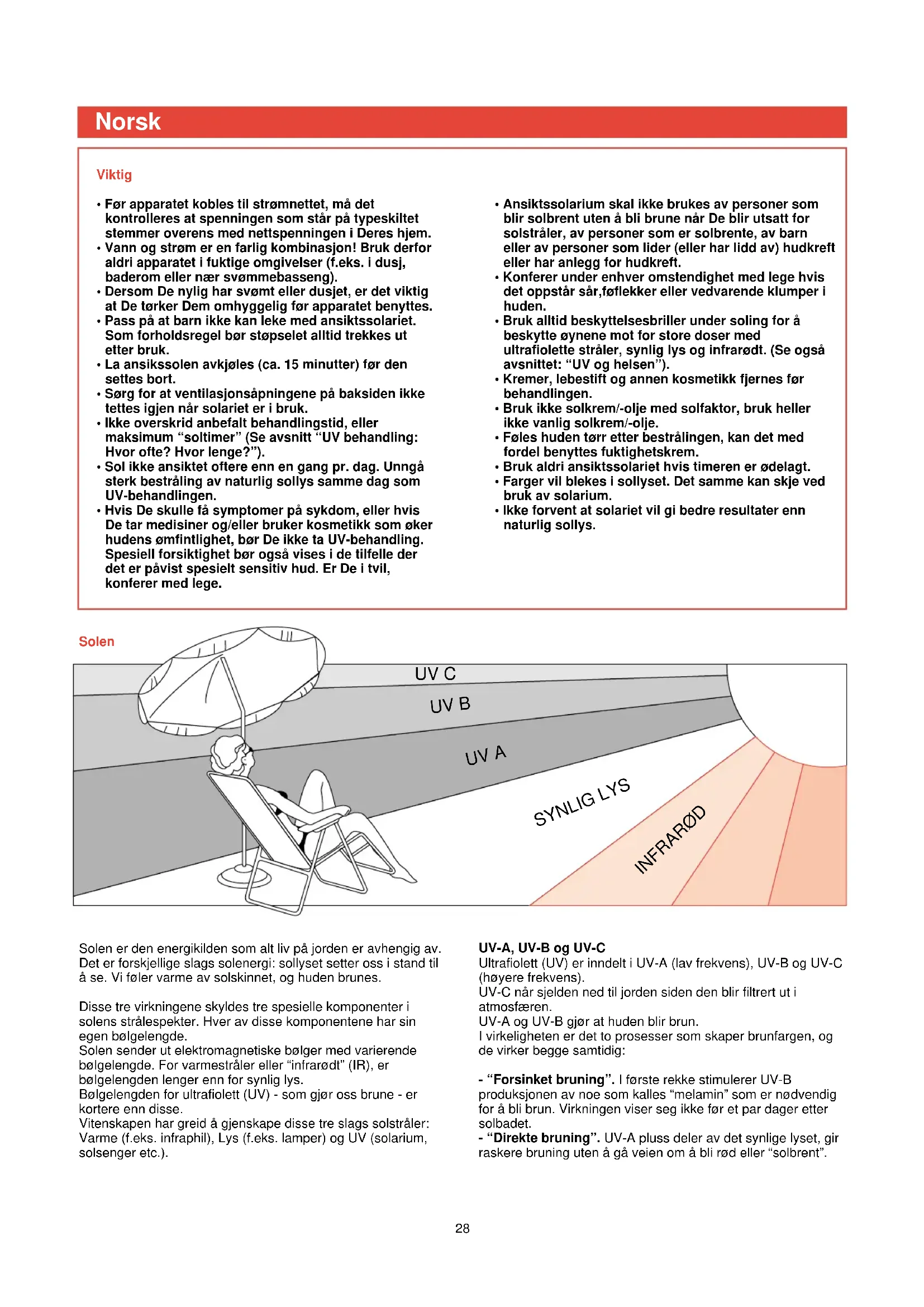 Norsk SolenUV-behandling: Hvor ofte? Hvor lenge? De kan ta en UV behandling pr. dag gjennom en periode på fem til ti dager. La det være minst 48 timer mellom de to første behandlingene. Etter en slik serie, bør det være et opphold. Etter en måneds tid vil huden ha mistet mye av brunfargen. Da kan det være på tide med en ny behandlingsrunde. På den annen side er det også mulig å ta en, eller to behandlinger pr. uke etterpå for å beholde fargen. Hva De enn måtte foretrekke, vær sikker på at De ikke overskrider det maksimale antall soltimer som for dette solariet er 30 timer (= 180 minutter) pr. år. F.eks.: Tenk Dem at De tar en 10 dagers behandling med 10 minutters behandling den første dagen og 25 minutter de 9 følgende dagene. Hele behandlingstiden blir da (1 x 10 min.) + (9 x 25 min.)= 235 minutter. I løpet av et år kan De ta 7 slike behandlinger (7 x 235 min.= 1645 min.) Det fremgår av tabellen at den første behandlingen i en serie alltid skal være på 10 minutter. Dette er ikke avhengig av den enkeltes hudømfintlighet. Ansiktssolariet Dette solariets stråler er hovedsakelig av UV-A typen, pluss en meget liten andel UV-B. UV og helsen Etter overdreven utsettelse av ultrafiolette stråler (fra solen eller fra solarium) kan huden bli solbrent. Ved siden av mange andre faktorer, slik som overdreven soling i naturlig sollys, feil eller overdreven soling med solarium, vil øke risikoen for hud eller øyensykdom. Bestrålingens måte, styrke og tid sammen med hudens grad av ømfintlighet, avgjør i hvilken utstrekning slike skader kan oppstå. Etter som huden utsettes for økt UV-bestråling, øker risikoen for betennelse på hornhinnen og/eller dens forbindelse, ødeleggelse av netthinnen, grå stær, for tidlig aldring av huden og hudskader. Visse medisiner og kosmetikk kan øke ømfintligheten ved UV- bestråling. Derfor er det meget viktig at: - Bruksanvisningens avsnitt: “Viktig” og “UV-behandling: Hvor ofte? Hvor lenge ?” blir fulgt. - Legg merke til at anbefalt bruningsavstand er minst 10 cm (ca. 4”). - Maks. antall soltimer pr. år ikke overskrides (30 timer eller 180 minutter). - De medfølgende beskyttelsesbrillene alltid blir brukt under behandlingen.