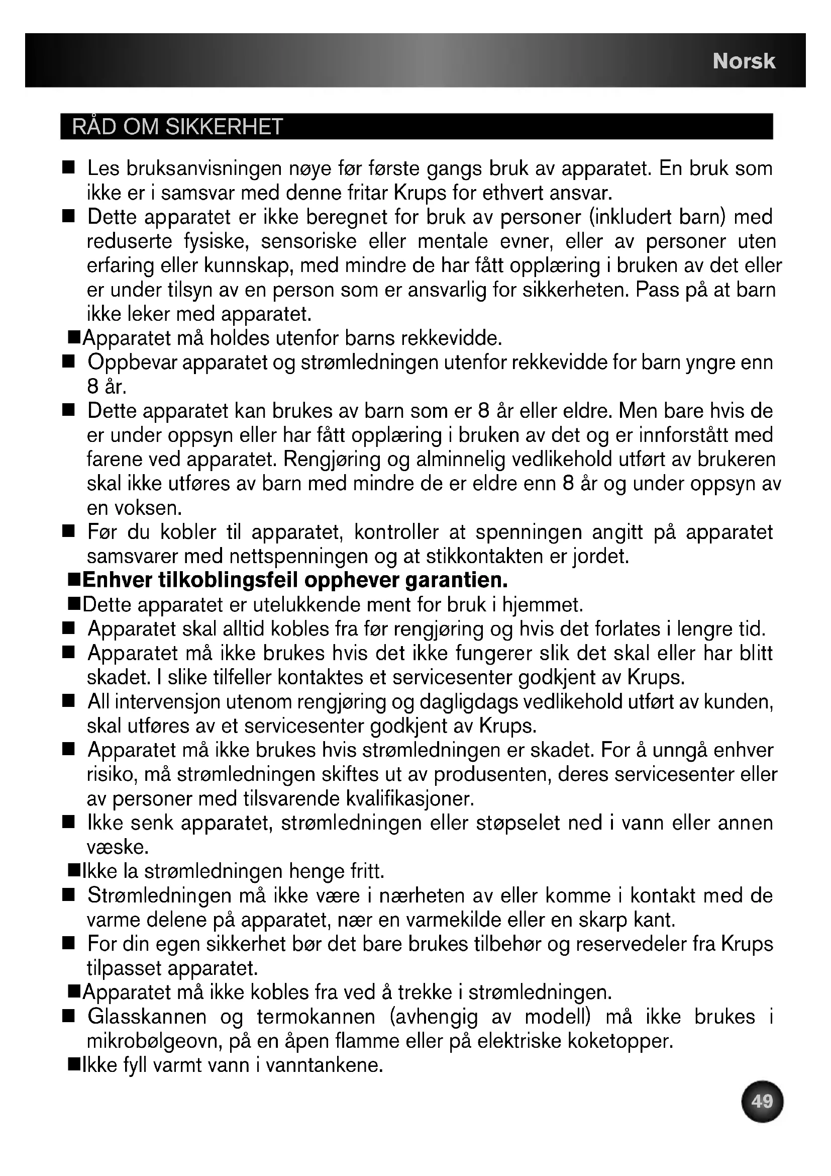 KRPS-CAFET-DUOTECH-NC0011572622/04/1309:05Page48RÅD OM SIKKERHET n Les bruksanvisningen nøye før første gangs bruk av apparatet. En bruk som ikke er i samsvar med denne fritar Krups for ethvert ansvar. n Dette apparatet er ikke beregnet for bruk av personer (inkludert barn) med reduserte fysiske, sensoriske eller mentale evner, eller av personer uten erfaring eller kunnskap, med mindre de har fått opplæring i bruken av det eller er under tilsyn av en person som er ansvarlig for sikkerheten. Pass på at barn ikke leker med apparatet. n Apparatet må holdes utenfor barns rekkevidde. n Oppbevar apparatet og strømledningen utenfor rekkevidde for barn yngre enn 8 år. n Dette apparatet kan brukes av barn som er 8 år eller eldre. Men bare hvis de er under oppsyn eller har fått opplæring i bruken av det og er innforstått med farene ved apparatet. Rengjøring og alminnelig vedlikehold utført av brukeren skal ikke utføres av barn med mindre de er eldre enn 8 år og under oppsyn av en voksen. n Før du kobler til apparatet, kontroller at spenningen angitt på apparatet samsvarer med nettspenningen og at stikkontakten er jordet. n Enhver tilkoblingsfeil opphever garantien. n Dette apparatet er utelukkende ment for bruk i hjemmet. n Apparatet skal alltid kobles fra før rengjøring og hvis det forlates i lengre tid. n Apparatet må ikke brukes hvis det ikke fungerer slik det skal eller har blitt skadet. I slike tilfeller kontaktes et servicesenter godkjent av Krups. n All intervensjon utenom rengjøring og dagligdags vedlikehold utført av kunden, skal utføres av et servicesenter godkjent av Krups. n Apparatet må ikke brukes hvis strømledningen er skadet. For å unngå enhver risiko, må strømledningen skiftes ut av produsenten, deres servicesenter eller av personer med tilsvarende kvalifikasjoner. n Ikke senk apparatet, strømledningen eller støpselet ned i vann eller annen væske. n Ikke la strømledningen henge fritt. n Strømledningen må ikke være i nærheten av eller komme i kontakt med de varme delene på apparatet, nær en varmekilde eller en skarp kant. n For din egen sikkerhet bør det bare brukes tilbehør og reservedeler fra Krups tilpasset apparatet. n Apparatet må ikke kobles fra ved å trekke i strømledningen. n Glasskannen og termokannen (avhengig av modell) må ikke brukes i mikrobølgeovn, på en åpen flamme eller på elektriske koketopper. n Ikke fyll varmt vann i vanntankene. Norsk