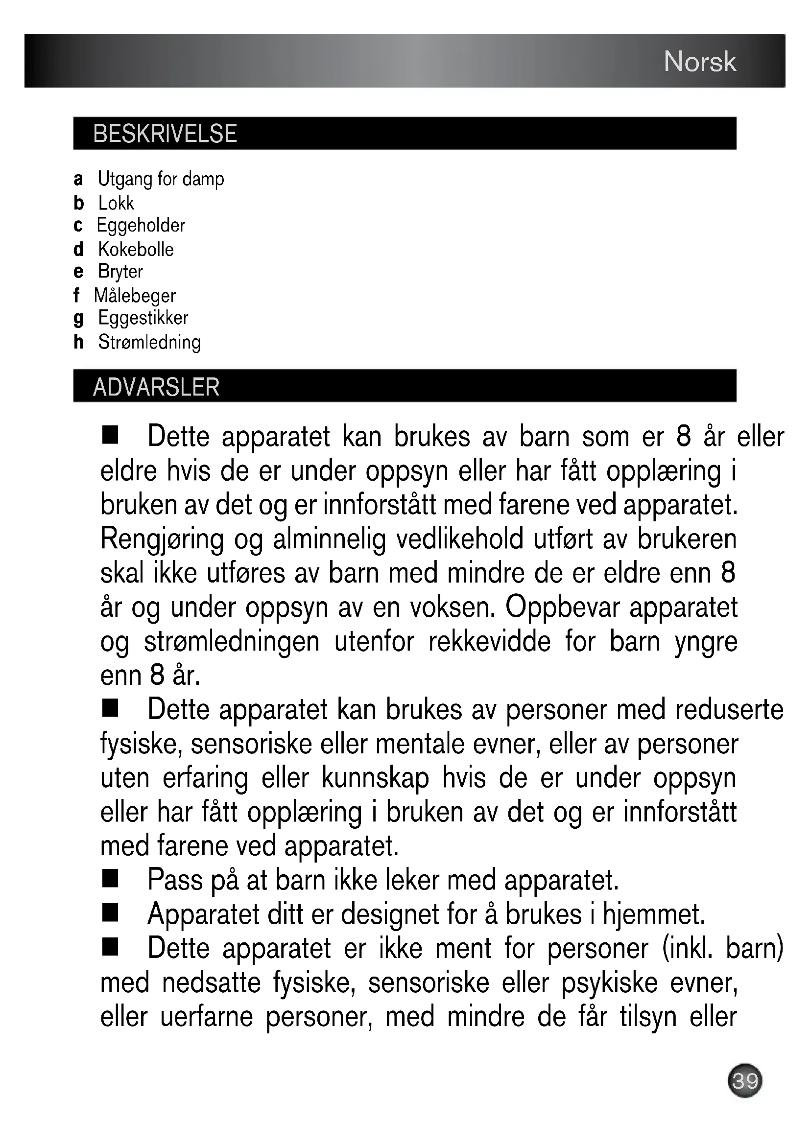 Apparatet må ikke brukes når det er tomt. For å unngå overoppheting av apparatet, må det ikke plasseres i et hjørne eller mot en vegg. Apparatet må aldri plasseres direkte på en skjør overflate (glassbord, duk, lakkert tre etc.) eller på en plastduk. Kjøkkenredskaper må aldri legges på stekeflatene i apparatet. Apparatet skal aldri nedsenkes i vann. Unngå væting av apparatet, kontrollen og ledningen INSTALLERING Plasser kokeren på en stabil arbeidsoverflate. Rengjør apparatet (frakoblet) og delene med en fuktig klut. Tørk.42 Norsk OPPSTART OG MATLAGING: Vi anbefaler at du bruker romtempererte egg. Du kan velge 3 koketider for eggene (1 til 7 egg). Avmerkingen på målebegeret er veiledende, resultatet avhenger av type og størrelse på eggene.
